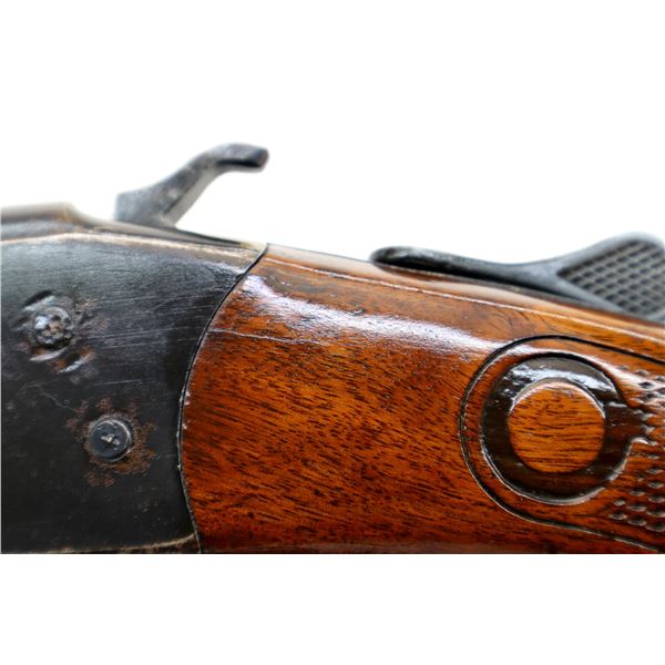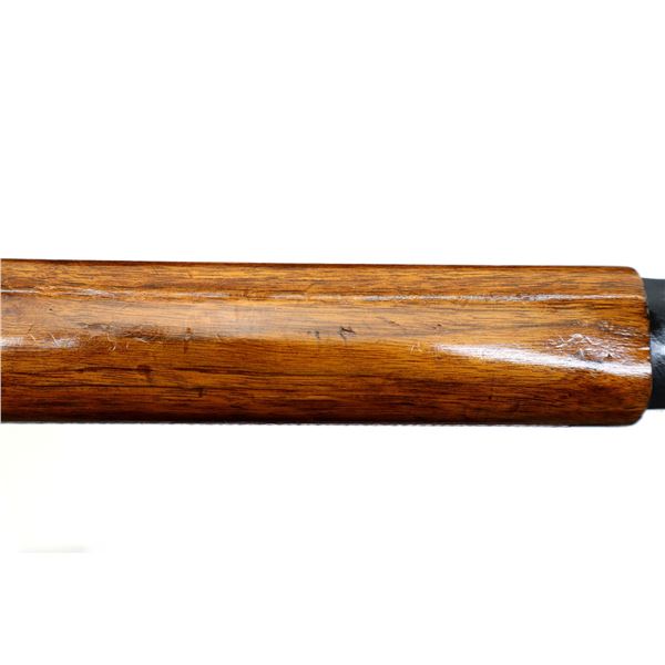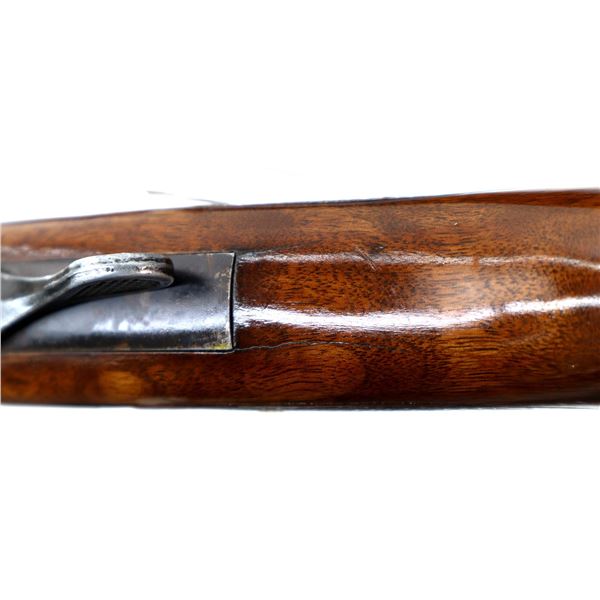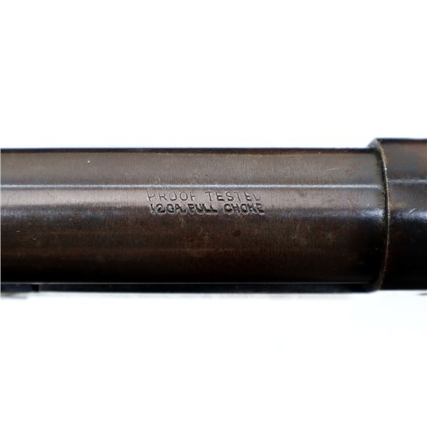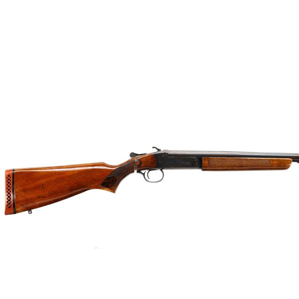 Main Description: Red fiber optic front bead, blued finish, shortened round barrel, grooved spur hammer, ejector. Two piece wood stocks, checkered forearm and pistol grip cracked behind upper and lower tangs, red vented rubber recoil pad, swivel studs.