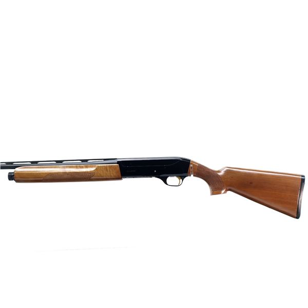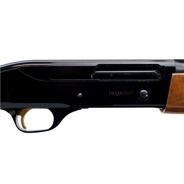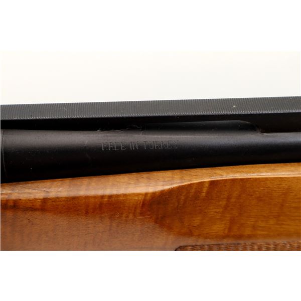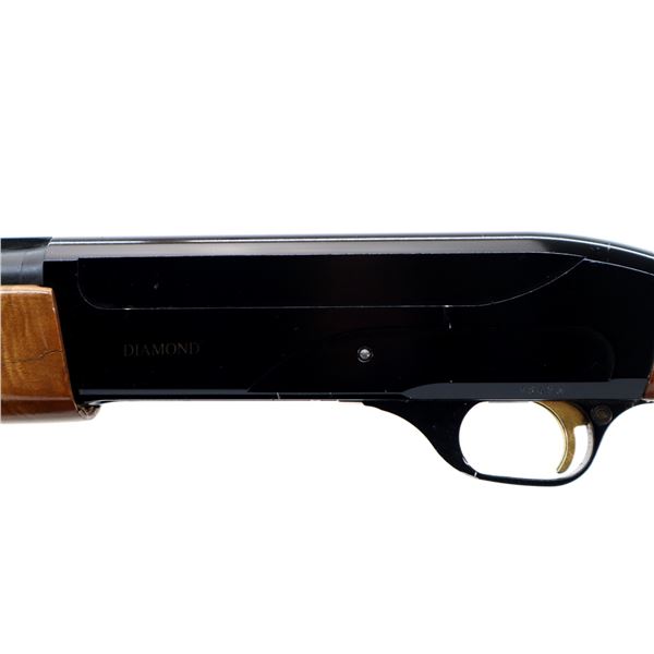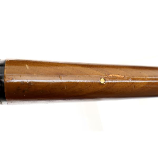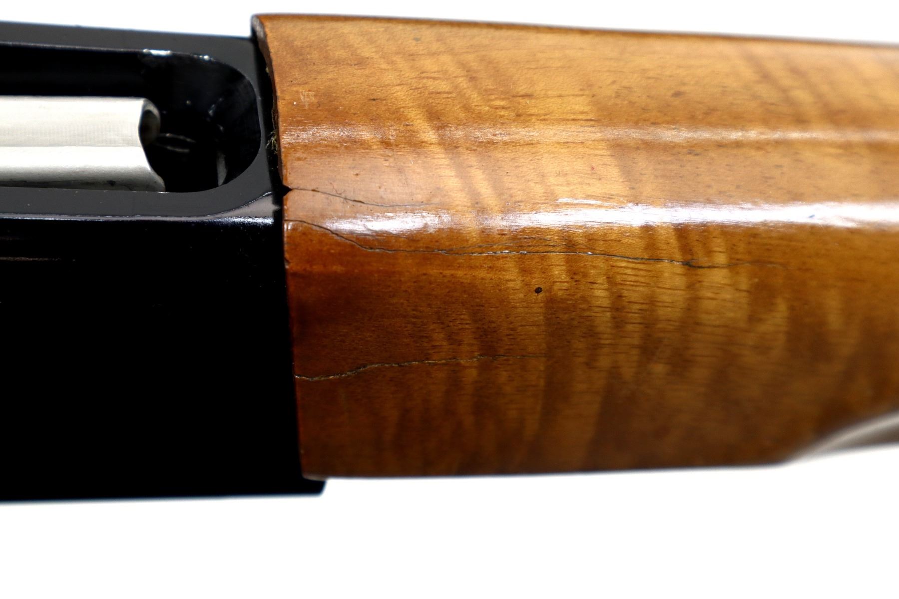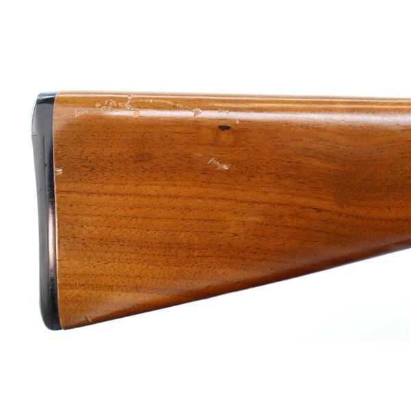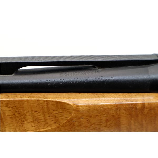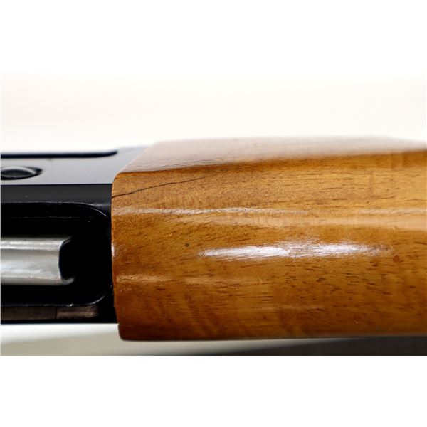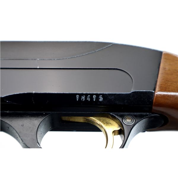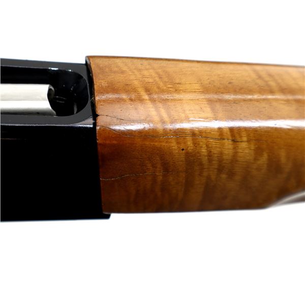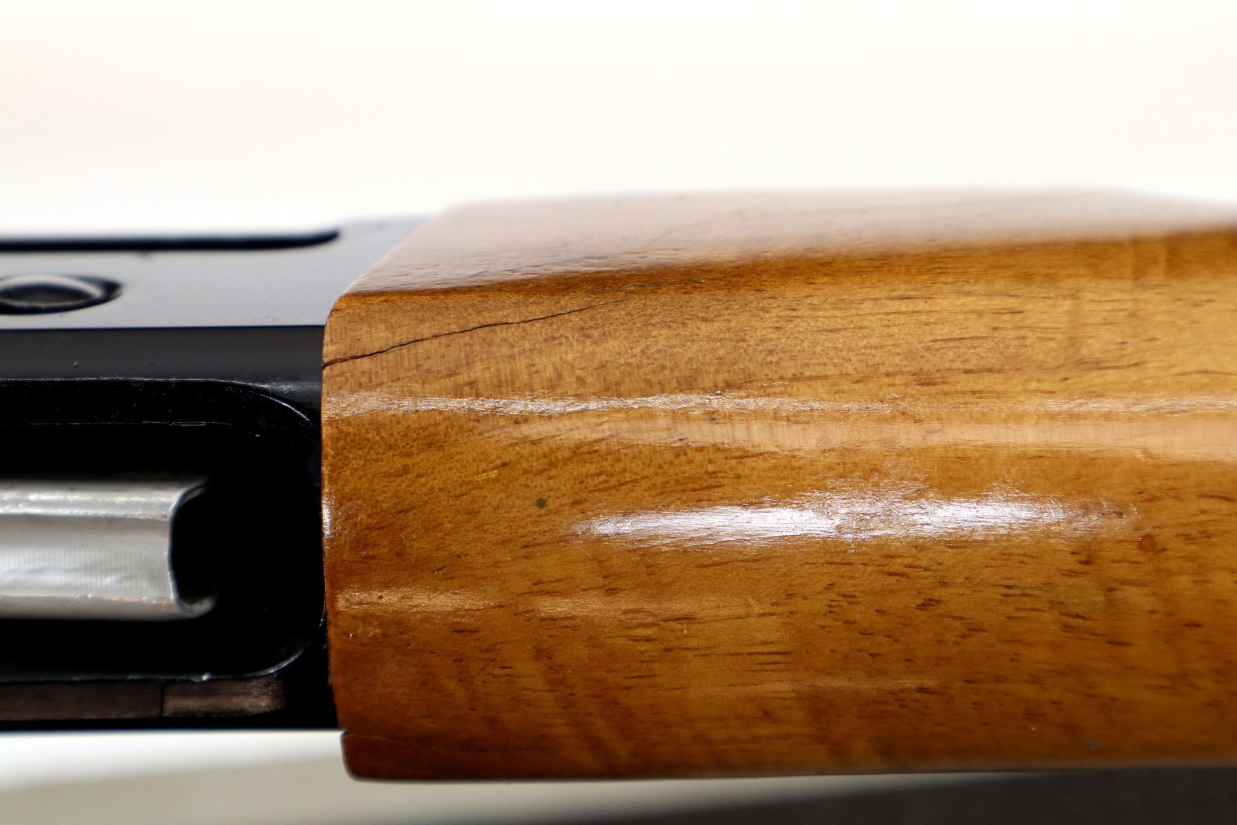 Main Description: Brass bead, Parkerized vent rib barrel, black alloy receiver drilled and tapped with plug screws installed, missing cocking handle. Two piece wood stocks, checkered forearm which is cracked, checkered pistol grip, black rubber recoil pad, gold trigger.