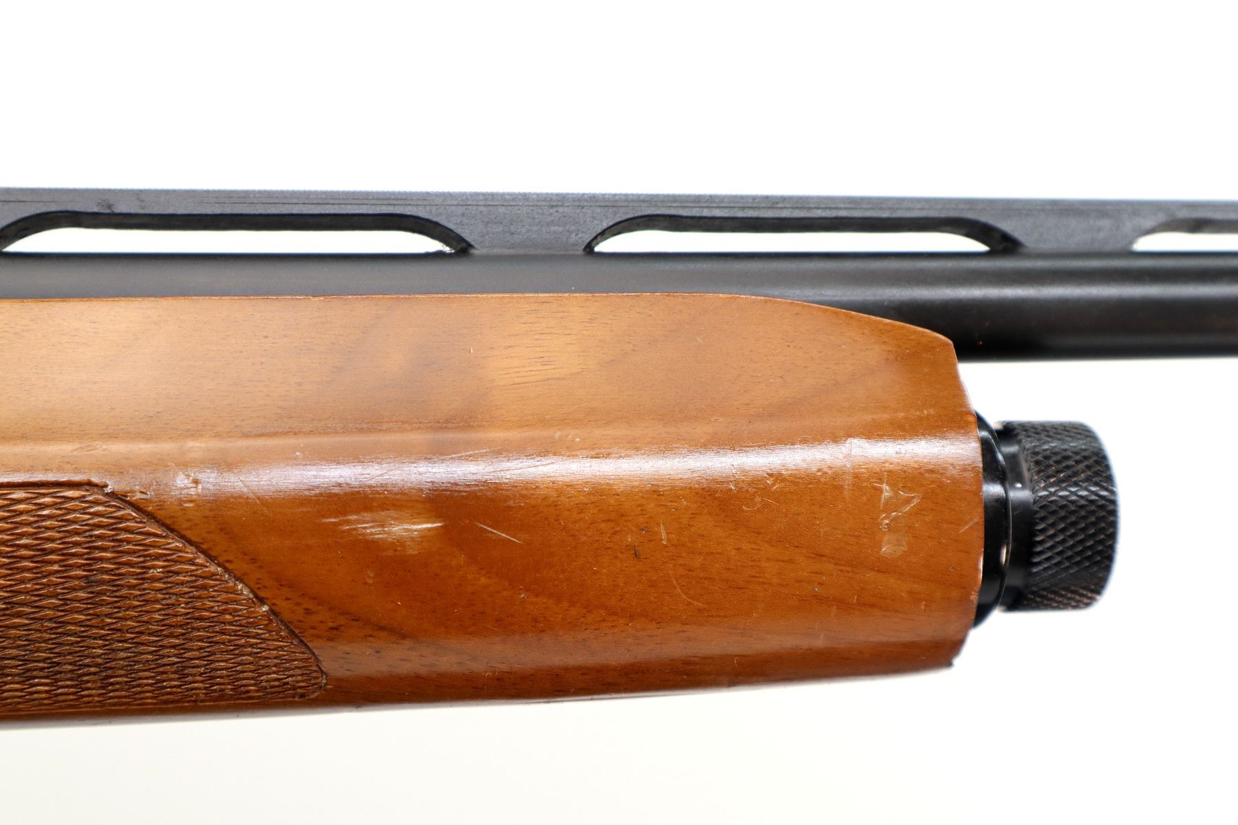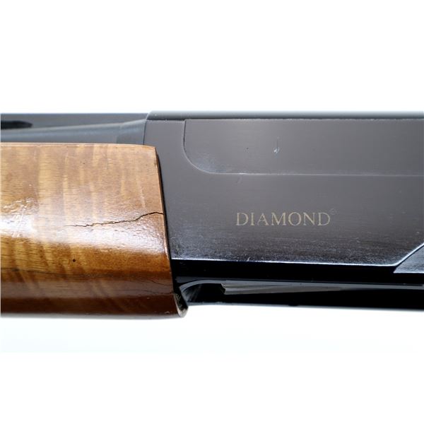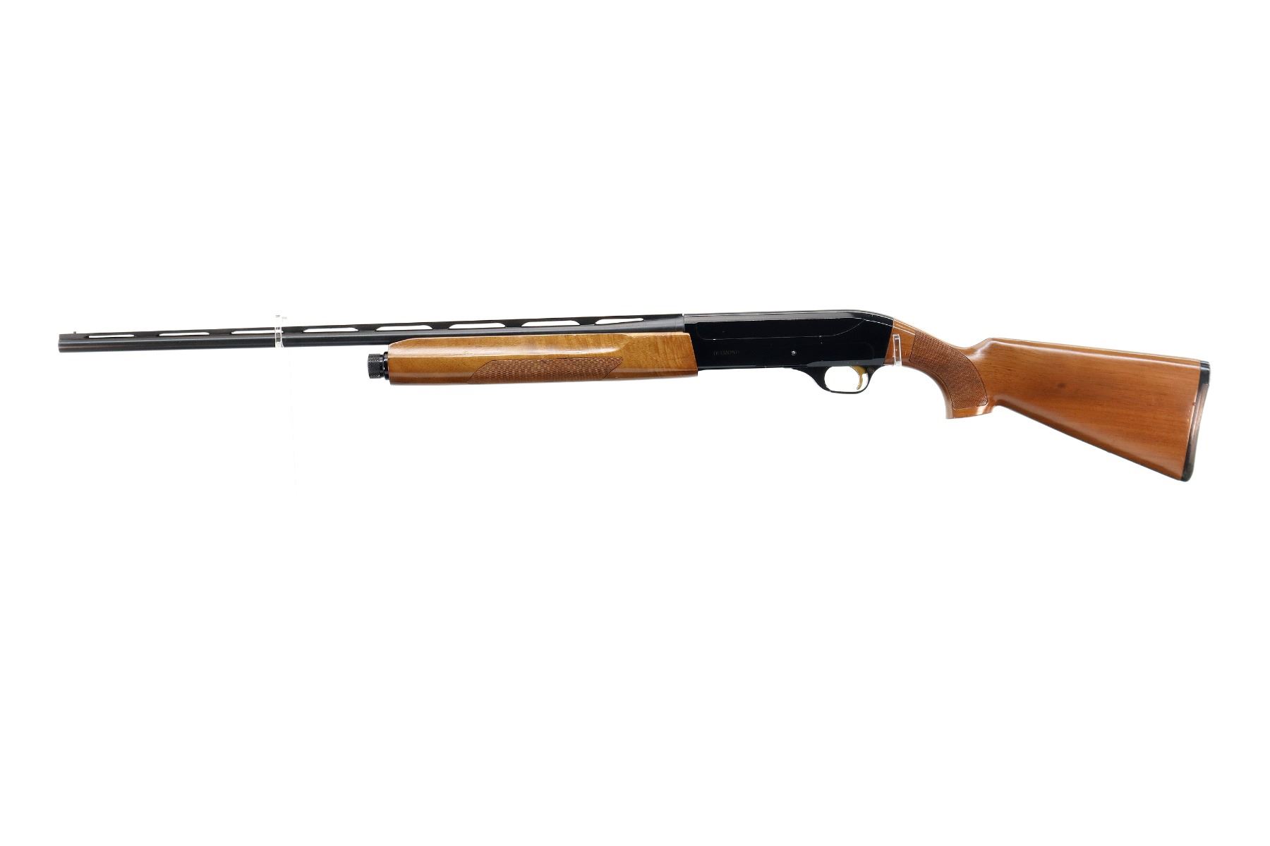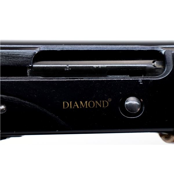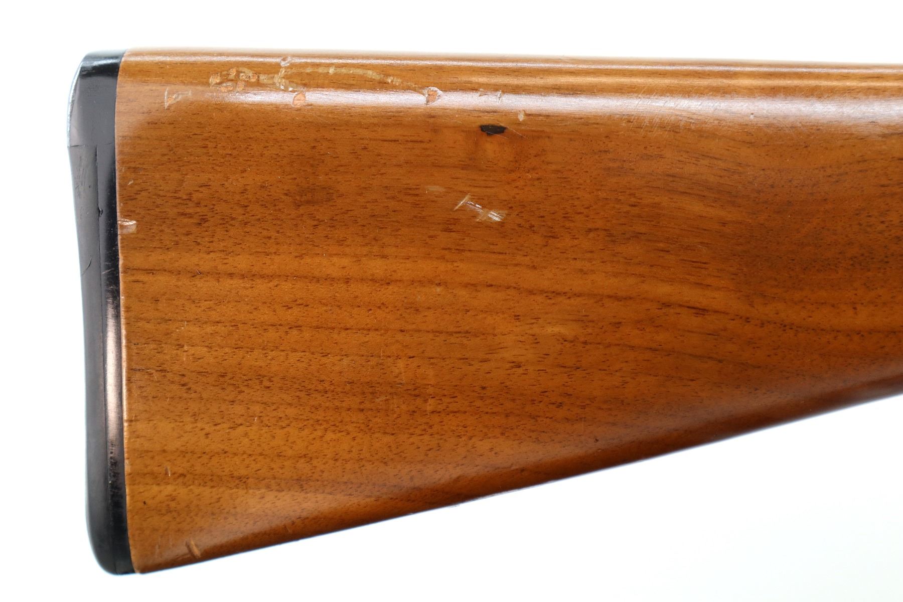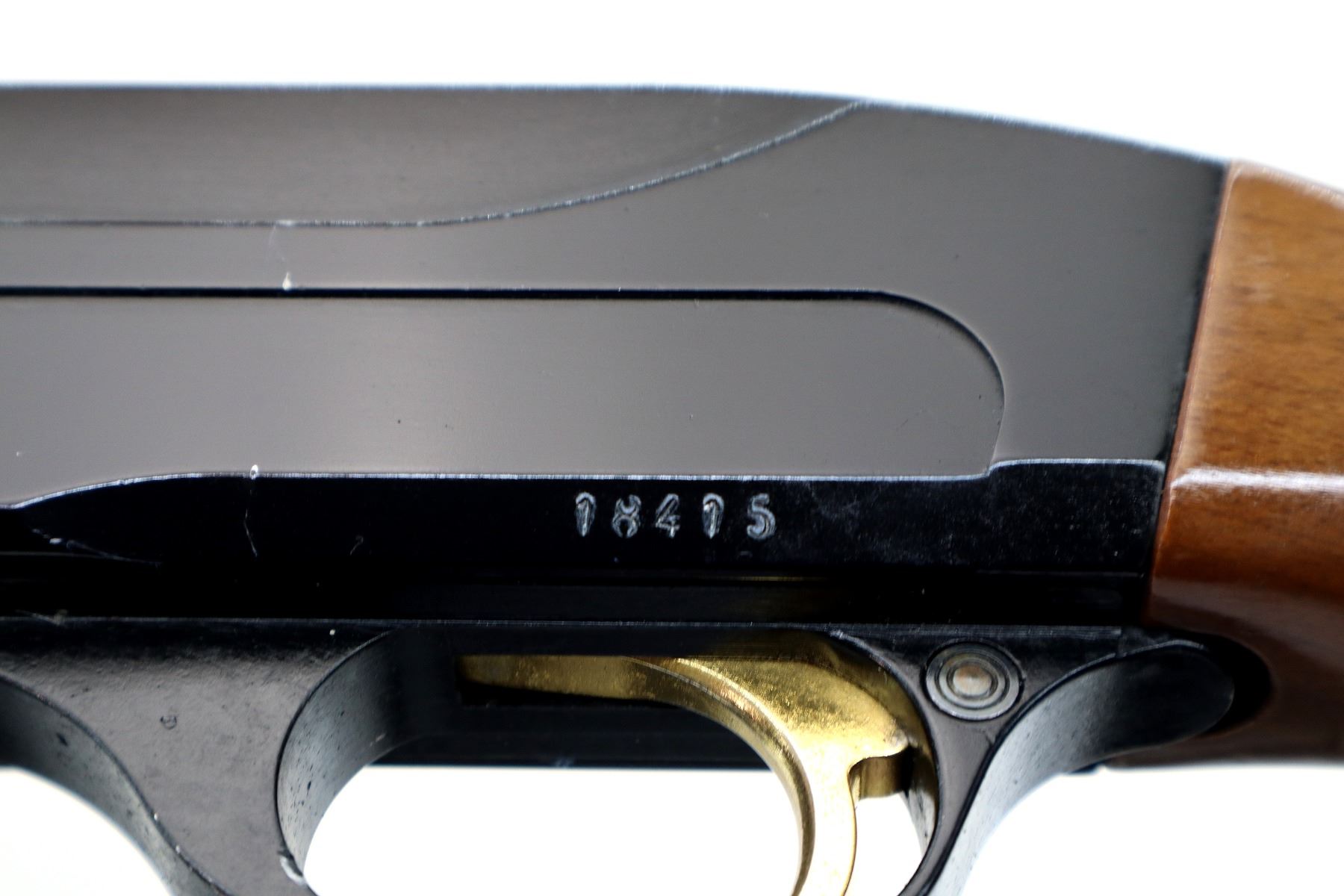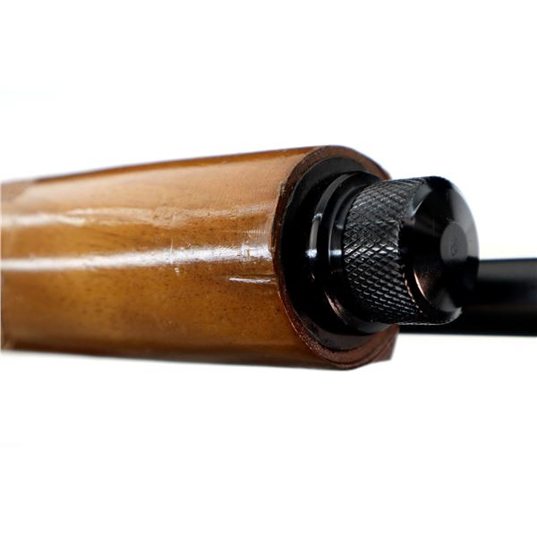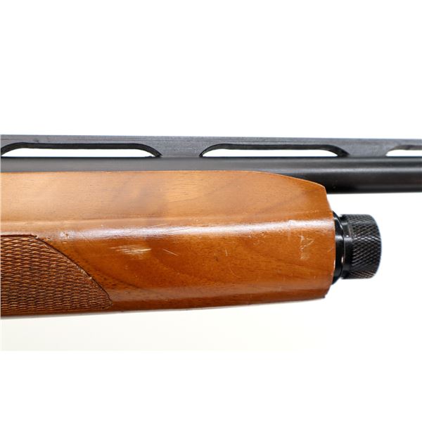Main Description: Brass bead, Parkerized vent rib barrel, black alloy receiver drilled and tapped with plug screws installed, missing cocking handle. Two piece wood stocks, checkered forearm which is cracked, checkered pistol grip, black rubber recoil pad, gold trigger.