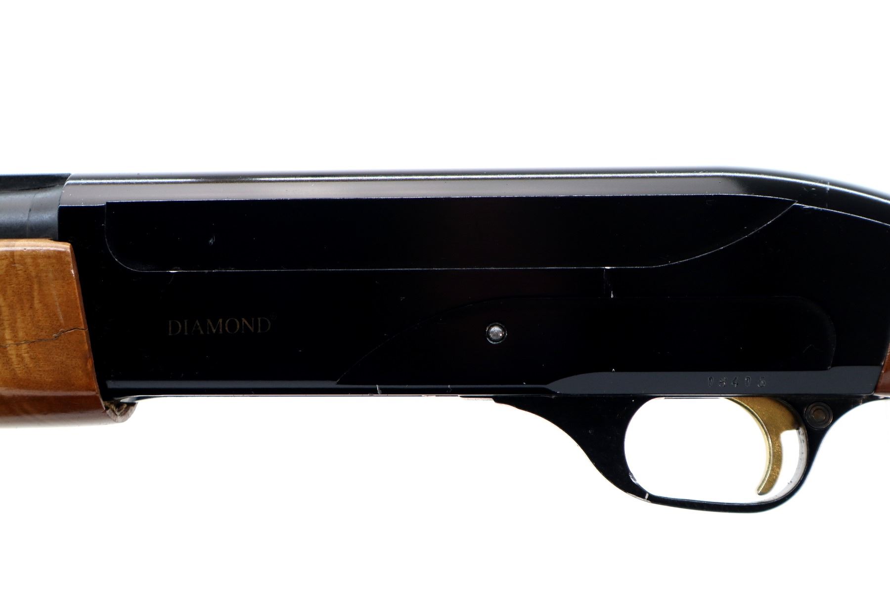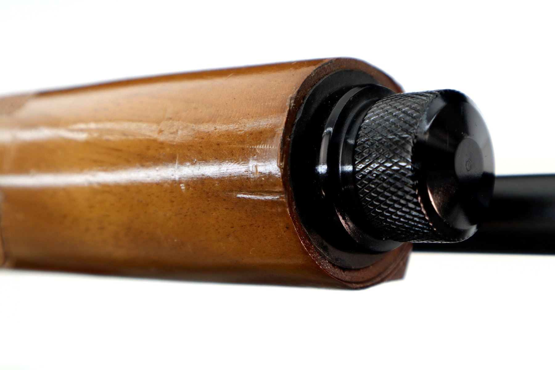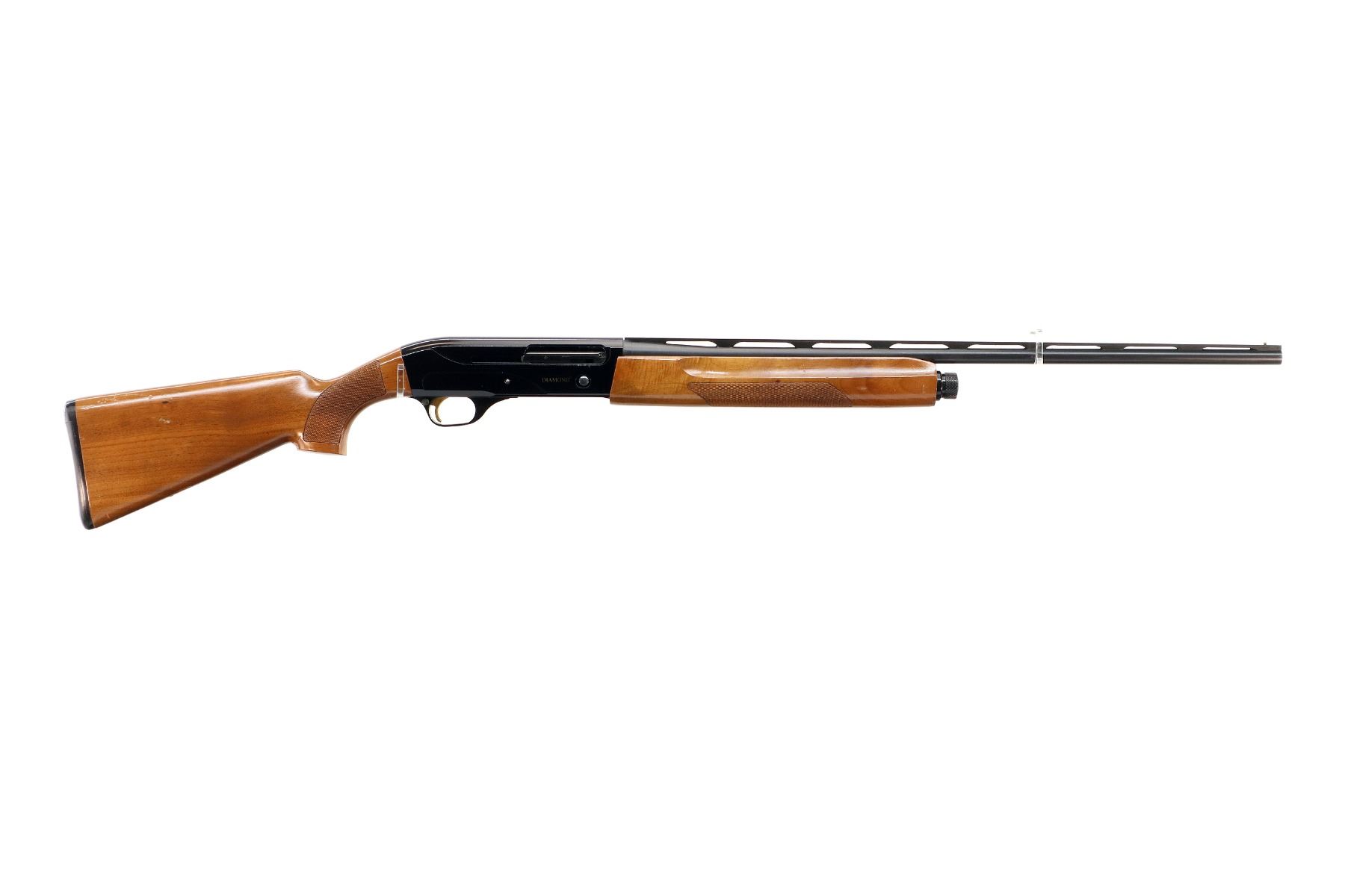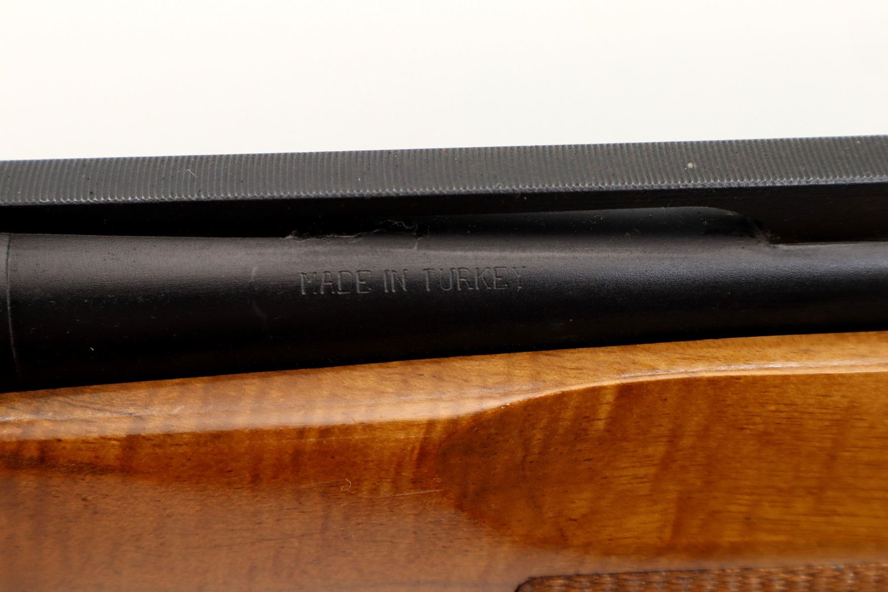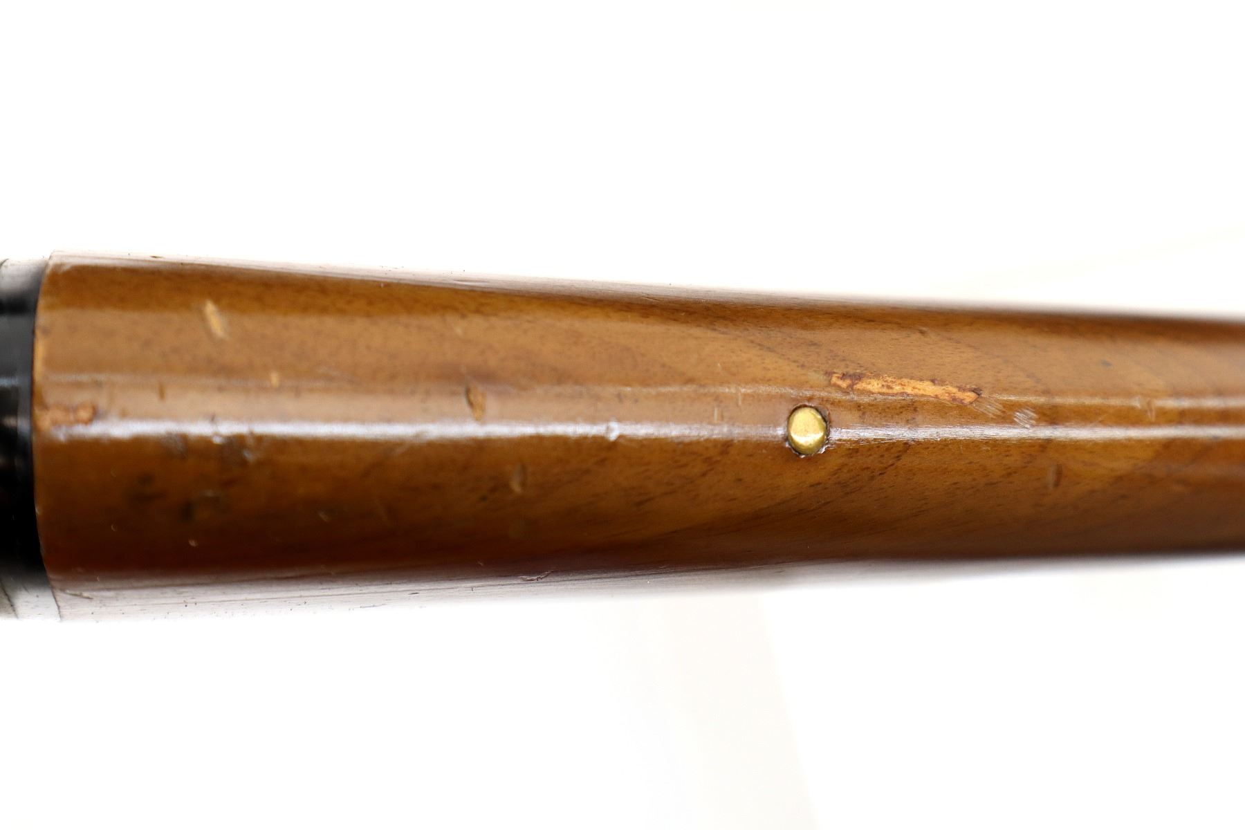 Main Description: Brass bead, Parkerized vent rib barrel, black alloy receiver drilled and tapped with plug screws installed, missing cocking handle. Two piece wood stocks, checkered forearm which is cracked, checkered pistol grip, black rubber recoil pad, gold trigger.