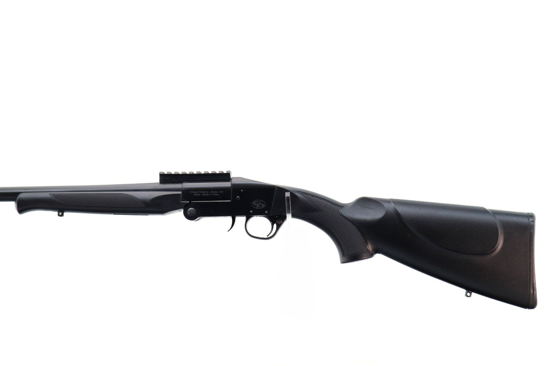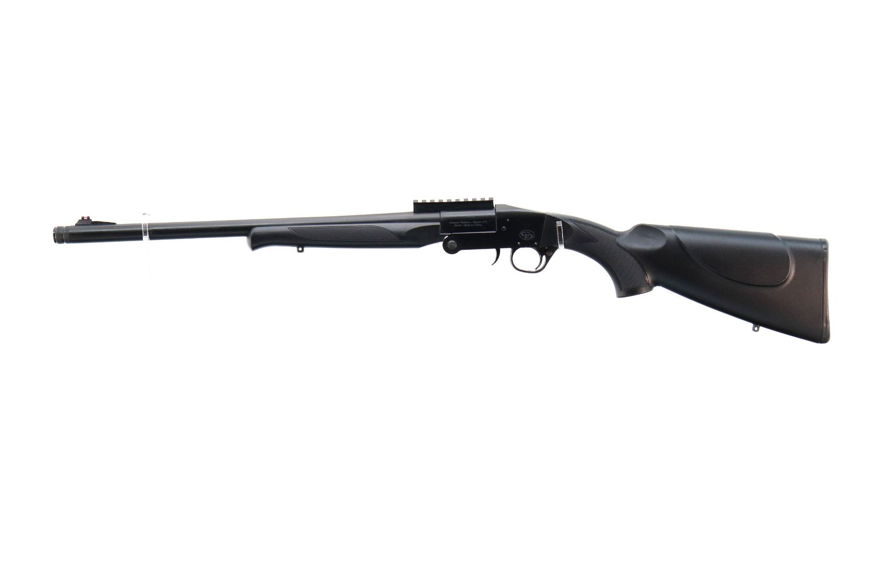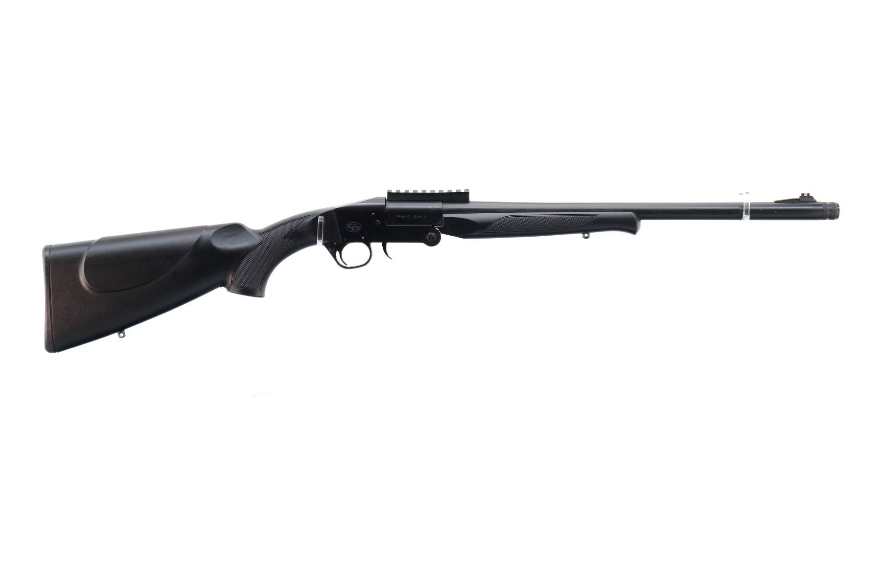 Main Description: Red fiber optic front sight with ramp, Parkerized metal finish, round barrel drilled and tapped with One piece black polymer scope rail installed, smooth opening lever in front of trigger guard, extractor. Two piece black synthetic stocks, checkered forearm, pistol grip and black polymer butt plate, swivel studs.