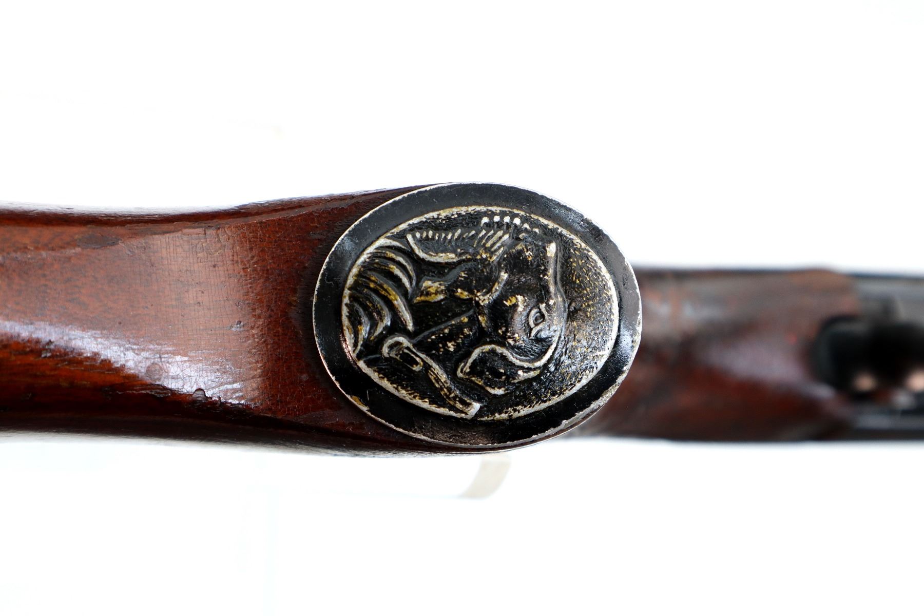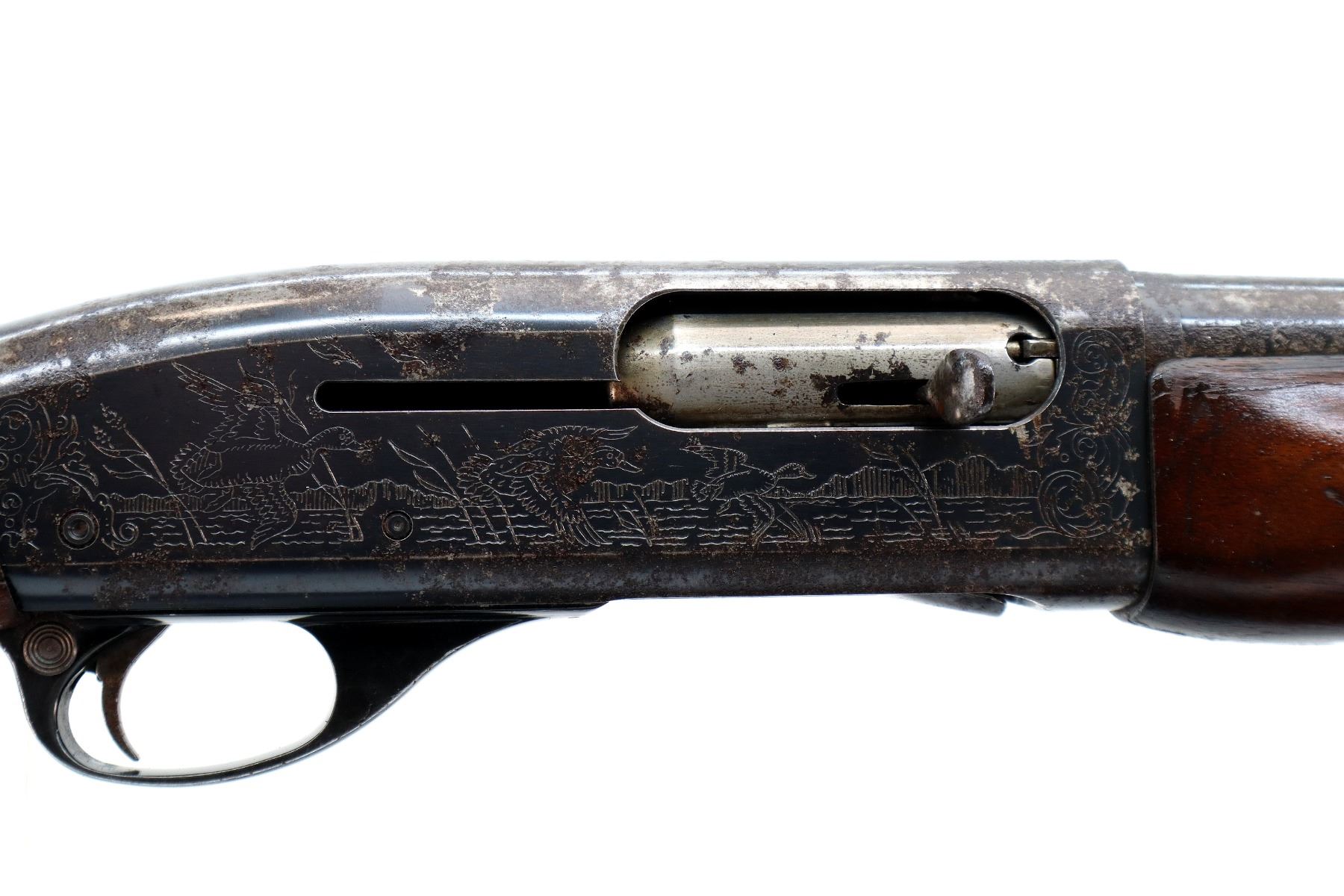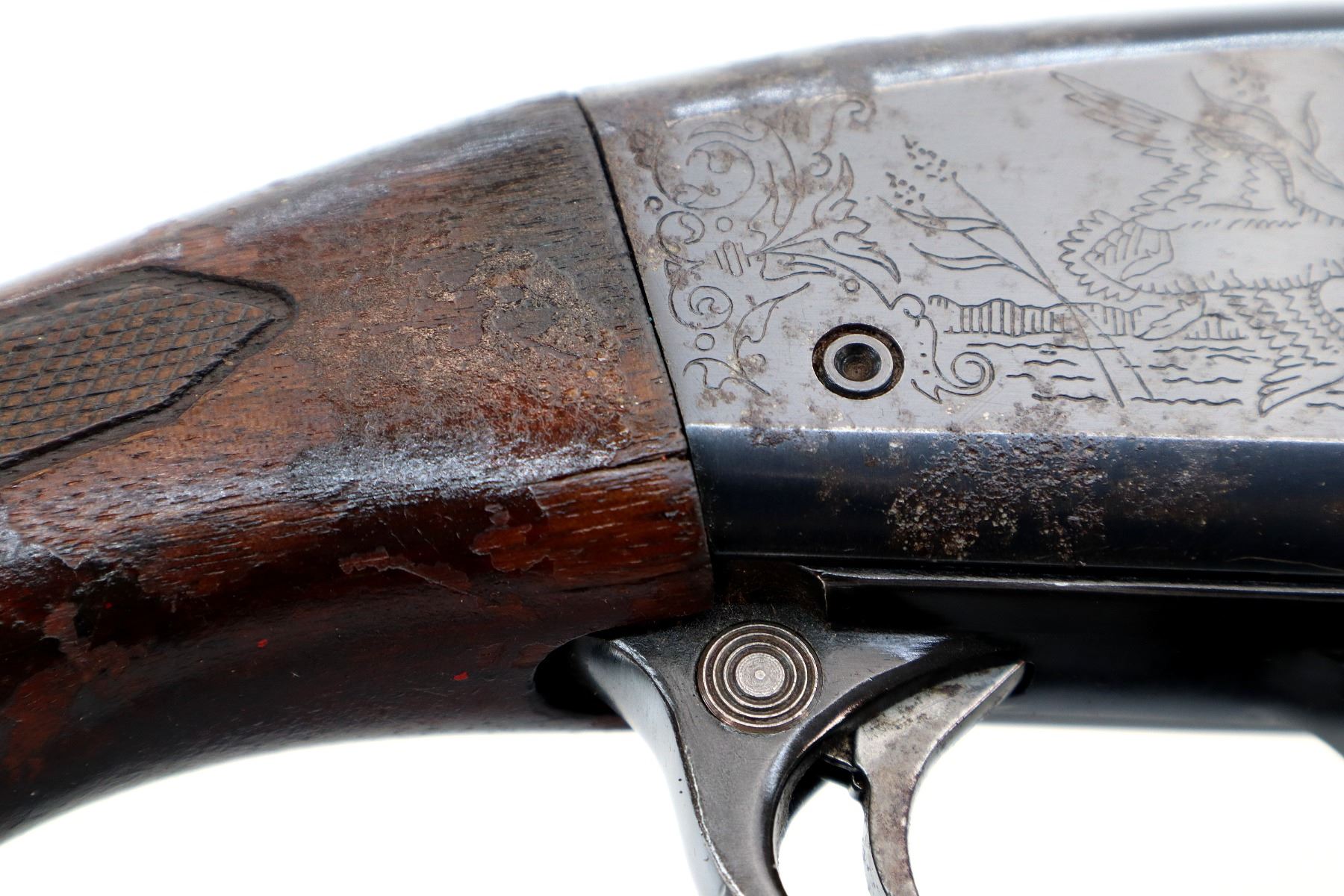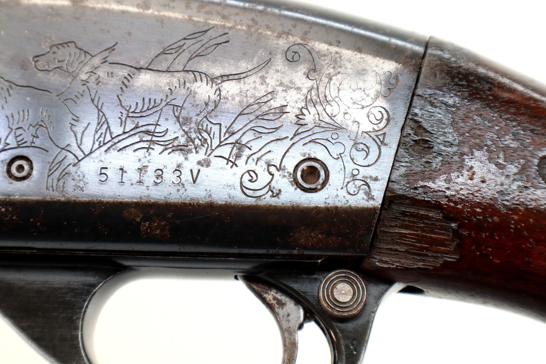 Wear: Metal finish turning brown with pitting, light rust overall, scratches, handling marks and wear. Stocks show marks, scratches and wear.