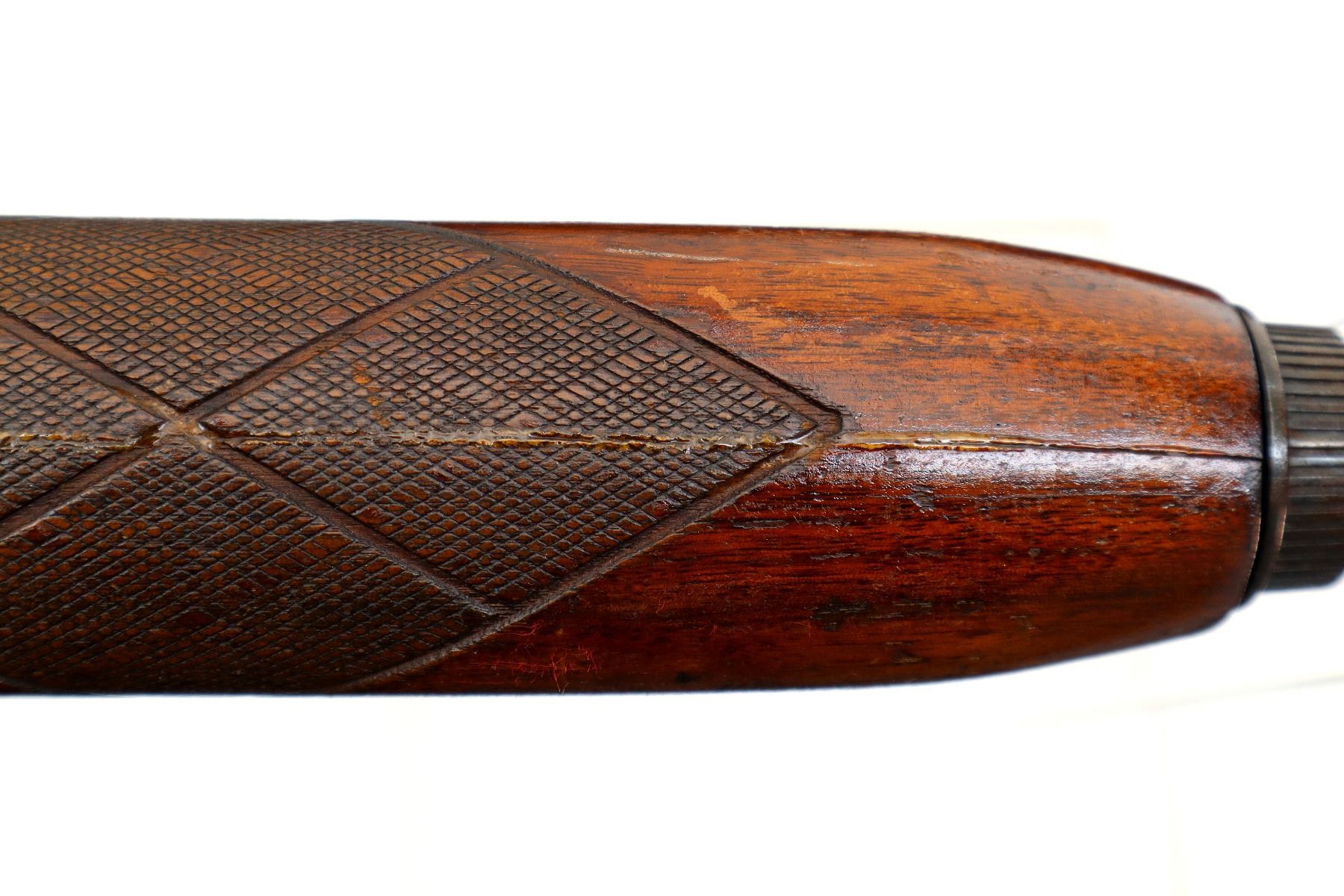Main Description: Silver bead, round barrel, engraved receiver. Two piece wood stocks, checkered forearm which is cracked and repaired, checkered pistol grip chipped cracked and loose behind receiver, grooved black polymer butt plate, grip cap, magtube cap is missing a piece.