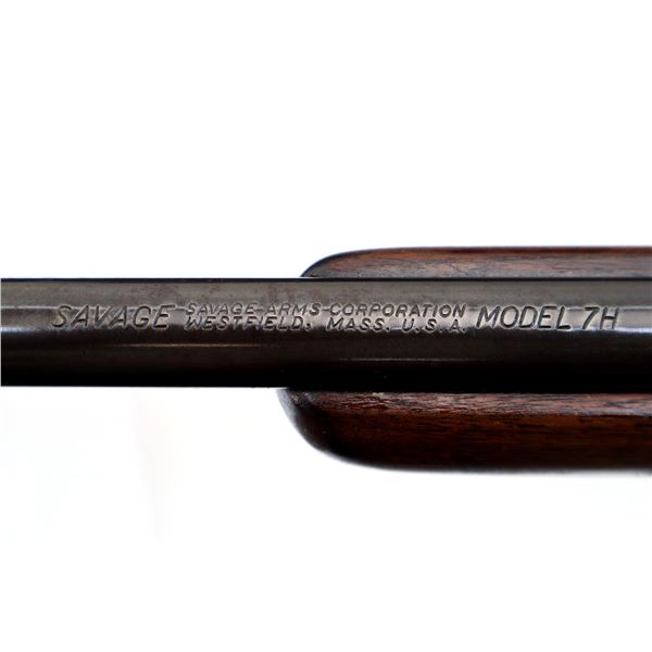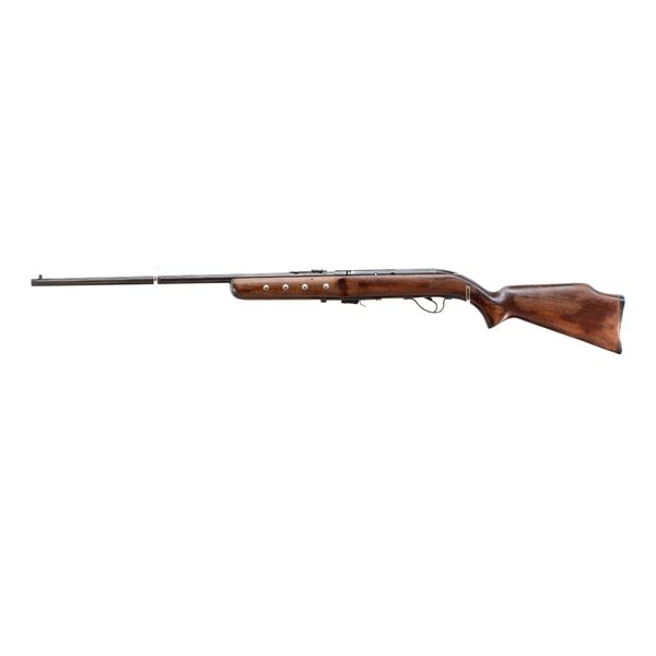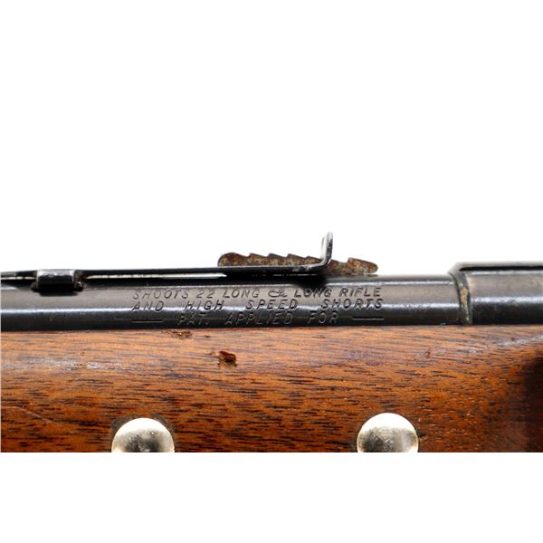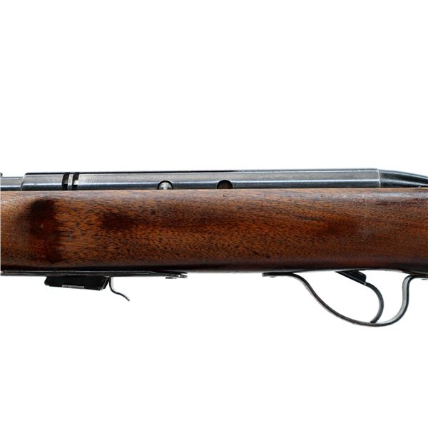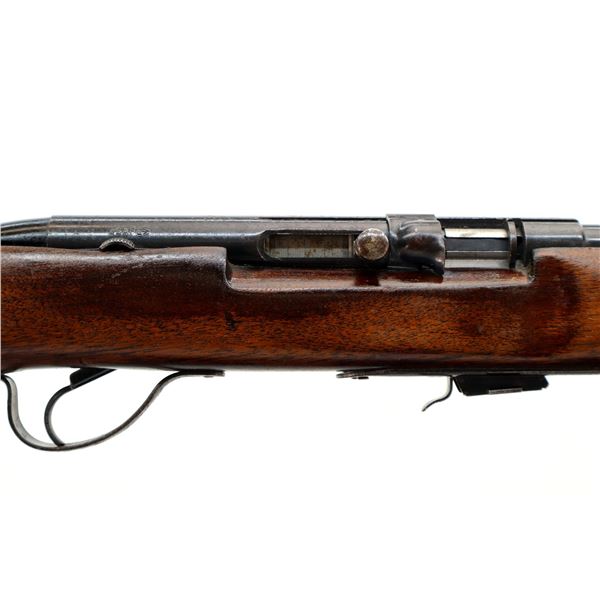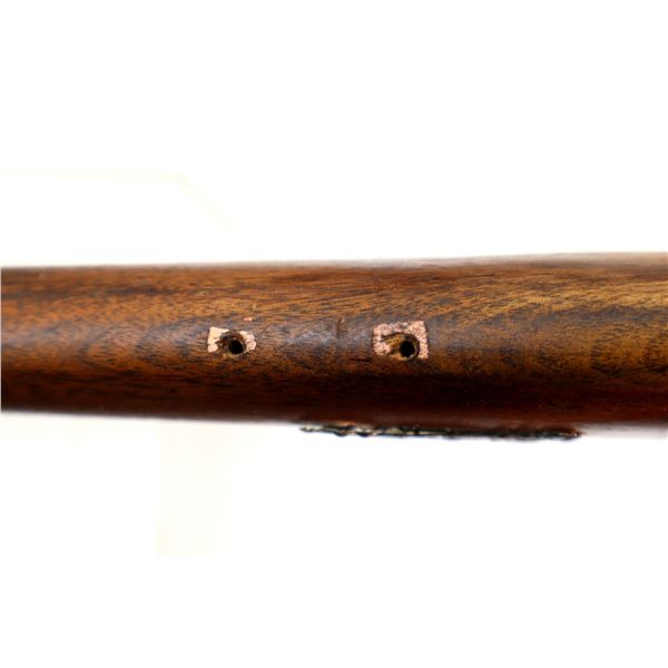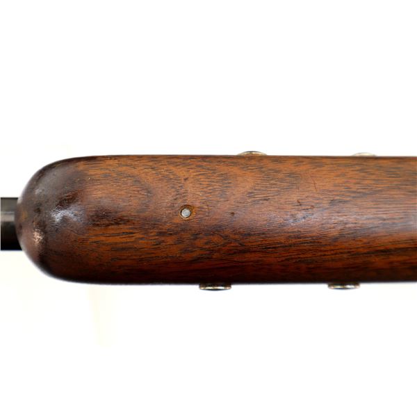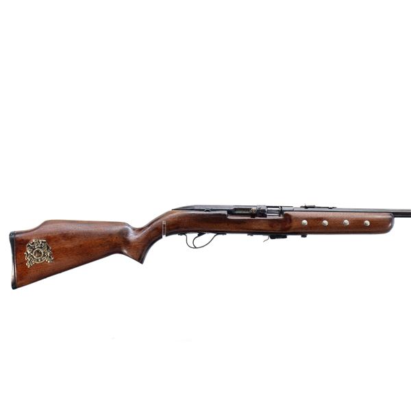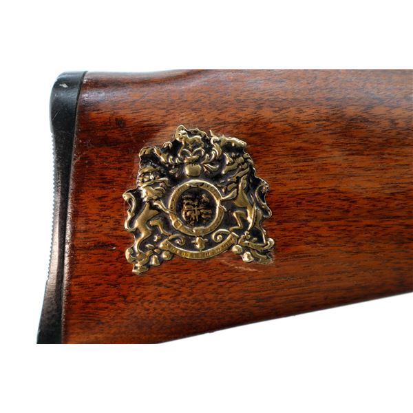Main Description: Blade front sight, adjustable u notched rear sight, grooved receiver and bolt knob, case deflector. One piece wood stock, forearm has 8 silver tacks, pistol grip, raised comb, grooved black polymer butt plate, unknown coat of arms on right side of stock. Missing swivels, holes are present.