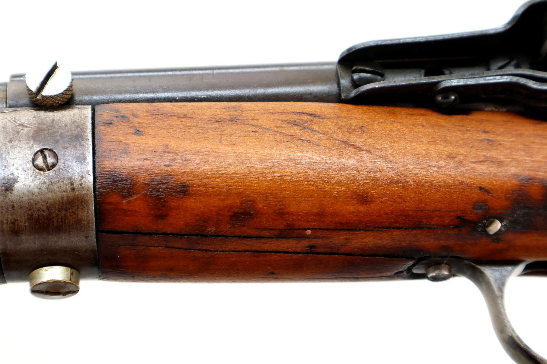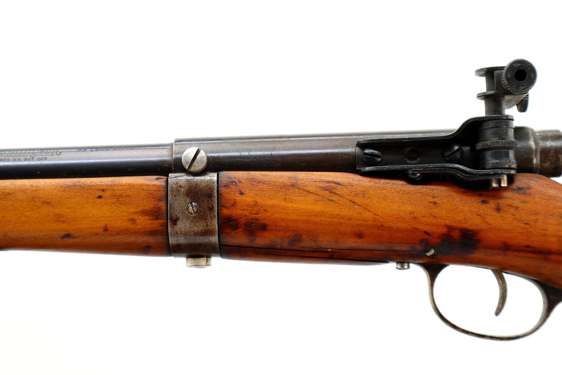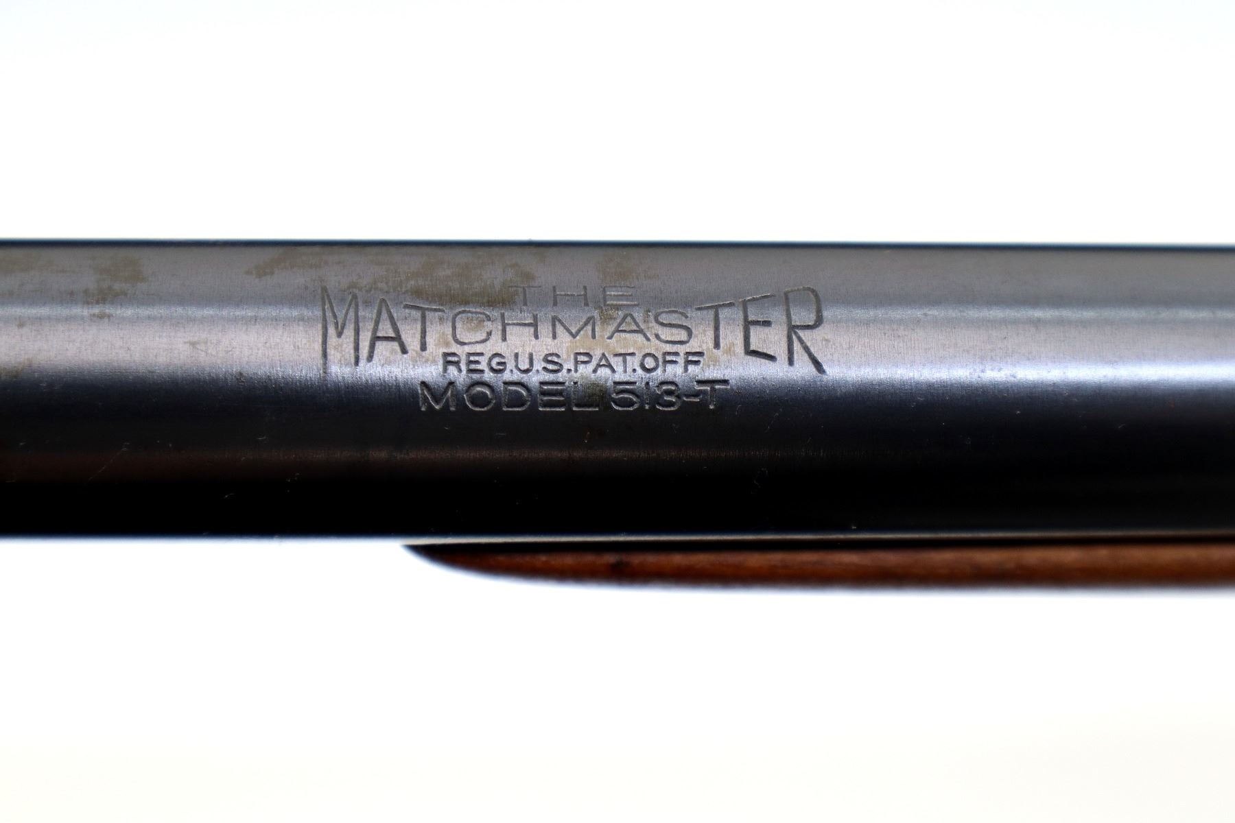 Main Description: Blade front sight with ramp, receiver drilled and tapped with adjustable Mossberg S-130 peep sight installed, heavy blued barrel marked Remington 513-T Matchmaster, small checkered bolt knob, handle is loose does not stay in vertical position when open. Two piece wood stocks, forearm is chipped and cracked, straight grip, smooth steel butt plate, 3/4 length magtube.