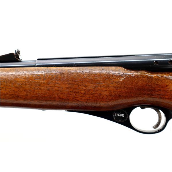 Main Description: Post front sight with ramp, adjustable u notched rear sight, blued finish, grooved receiver, round double sided bolt handle, safety buttons are present. One piece wood stock, pistol grip, cheek rest, grooved black polymer butt plate, stock is chipped and cracked on right side, swivel studs.