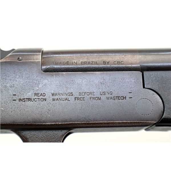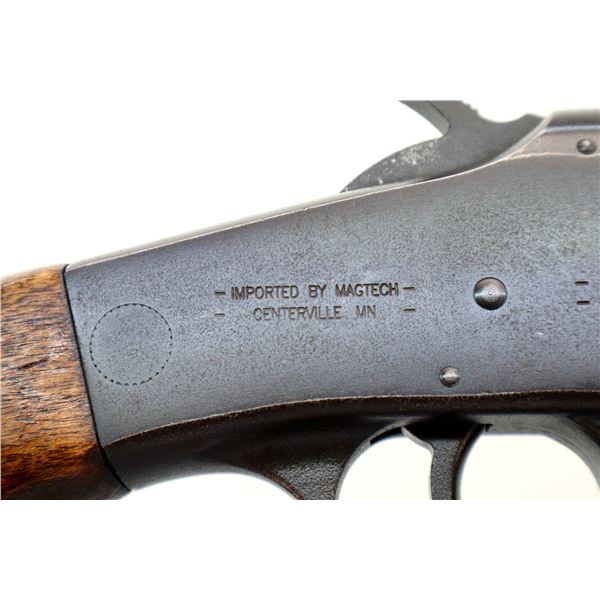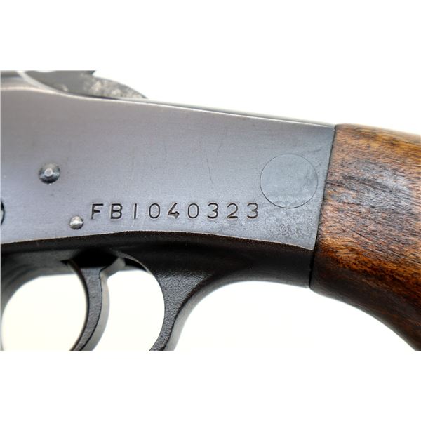 Main Description: Brass bead, blued finish, round barrel, grooved spur hammer and opening lever, extractor. Two piece wood stocks, pistol grip, grooved black polymer butt plate, black polymer forend spacer has a small crack.