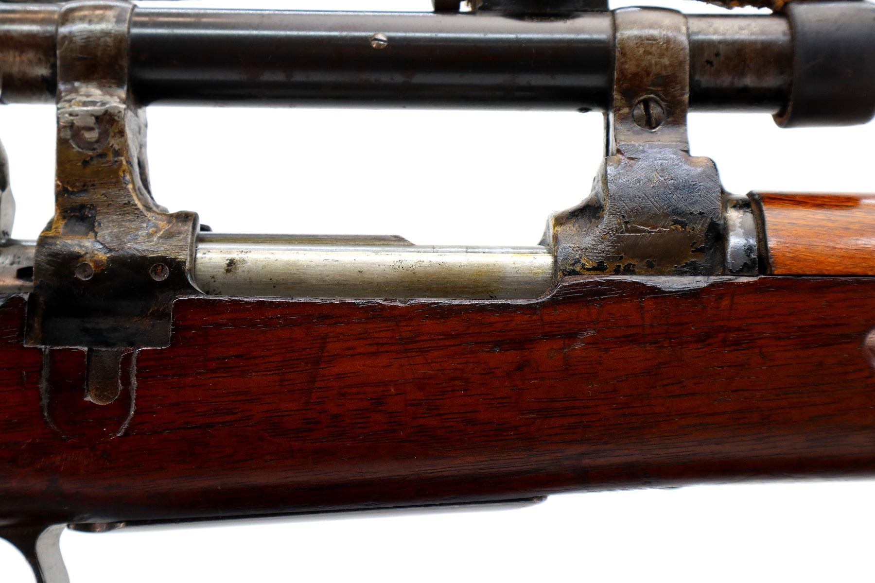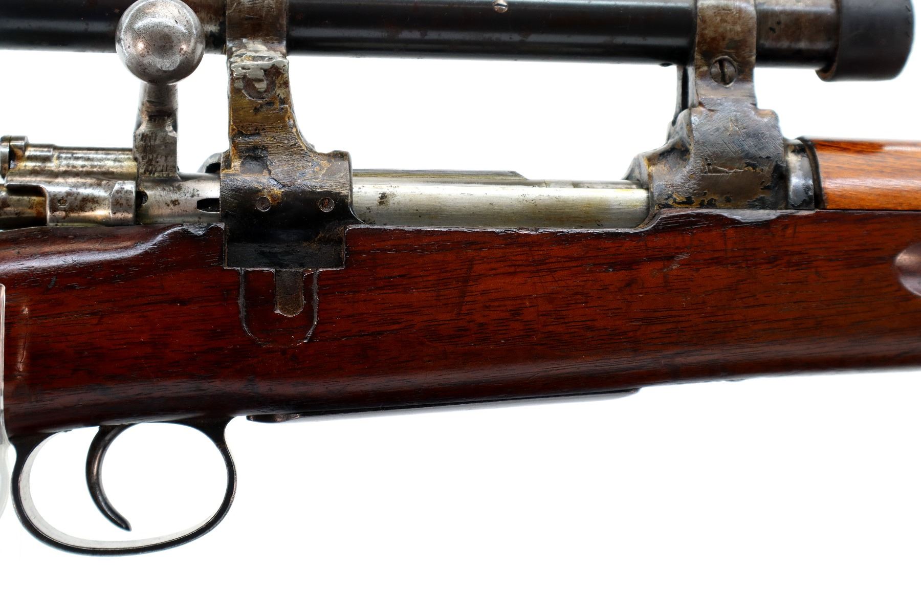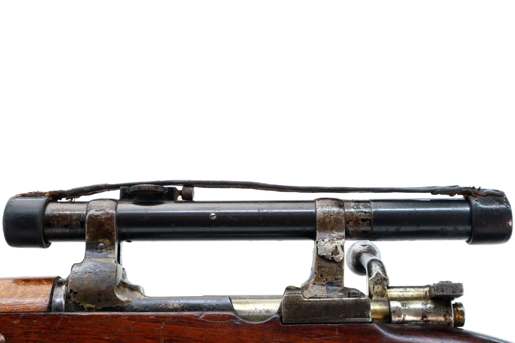 Main Description: Blade front sight with hood and ramp, no rear sight, blued finish, heavy barrel, receiver has been braised and welded with custom rings mounting a German A Jackenar low powered scope, clear optics with NO1 German reticle, modified bolt handle. Two piece target style wood stocks, finger grooved forearm, straight grip cracked behind receiver, smooth steel butt plate, missing stock disk, has sling swivels.