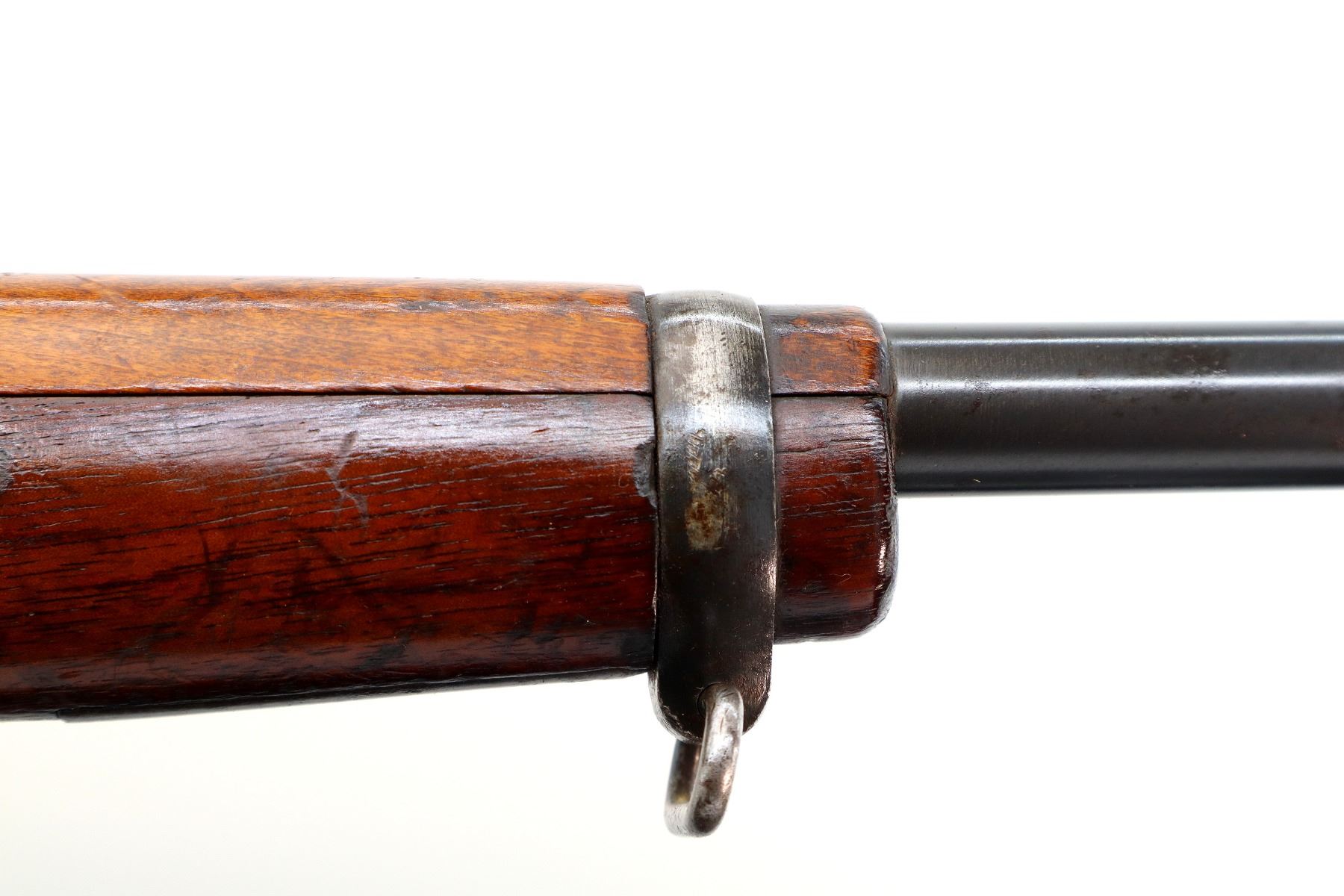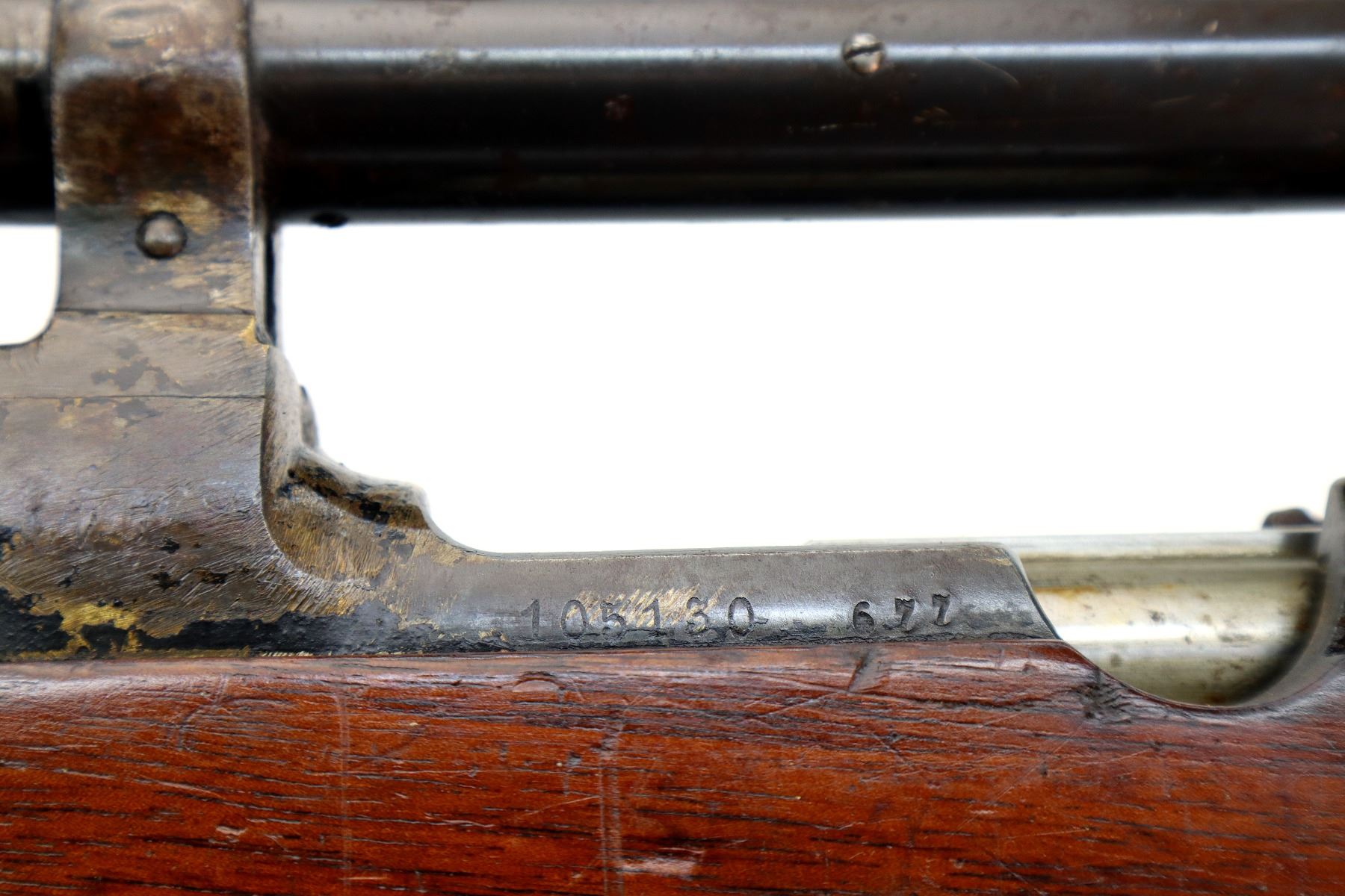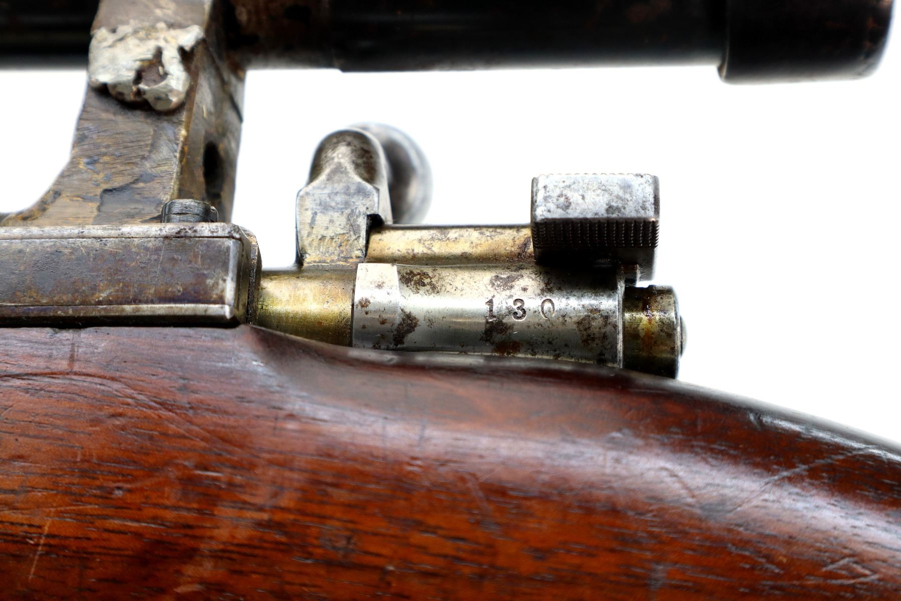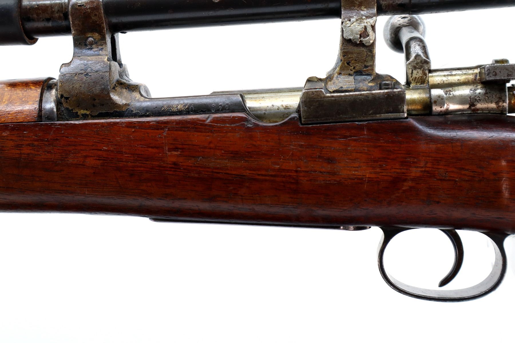 Main Description: Blade front sight with hood and ramp, no rear sight, blued finish, heavy barrel, receiver has been braised and welded with custom rings mounting a German A Jackenar low powered scope, clear optics with NO1 German reticle, modified bolt handle. Two piece target style wood stocks, finger grooved forearm, straight grip cracked behind receiver, smooth steel butt plate, missing stock disk, has sling swivels.