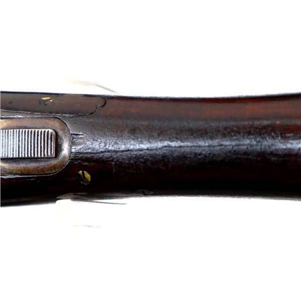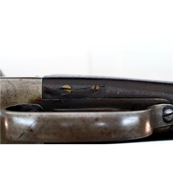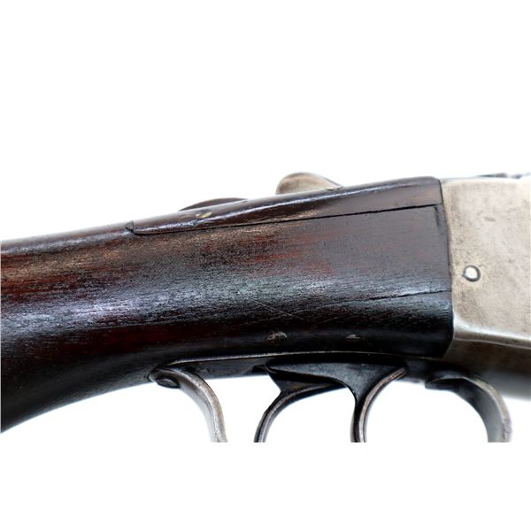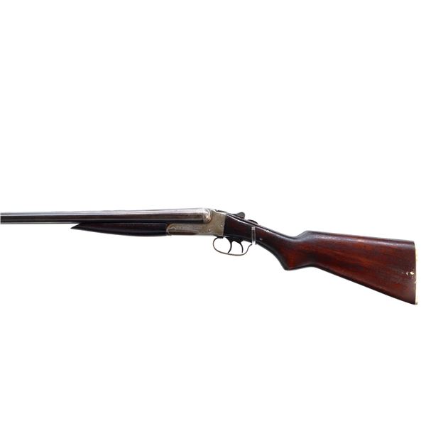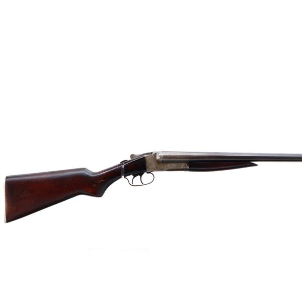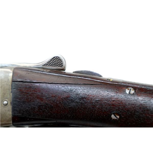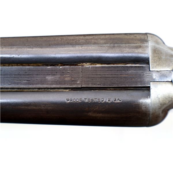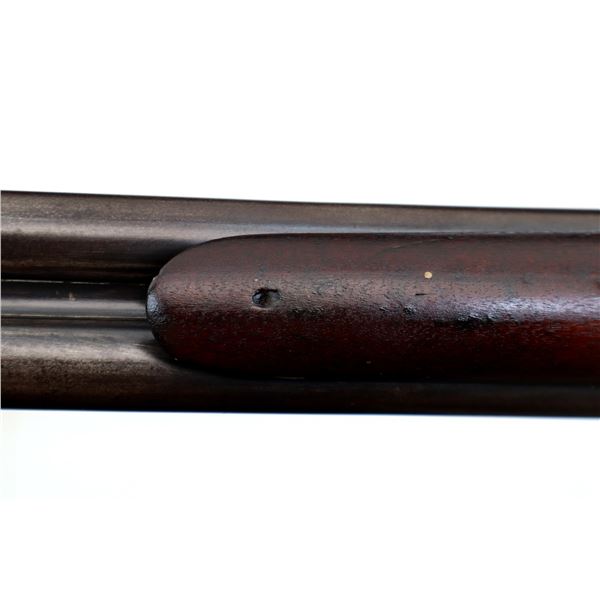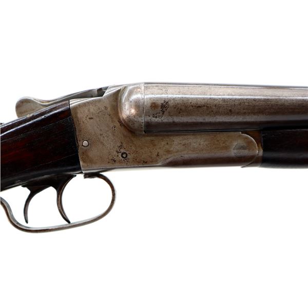 Main Description: Brass bead, blued finish, raised solid rib, automatic safety, extractor, double triggers. Two piece wood stocks, pistol grip, chipped cracked and broken behind receiver repaired with screws, replaced silver alloy butt plate and forearm has a hole in the tip.