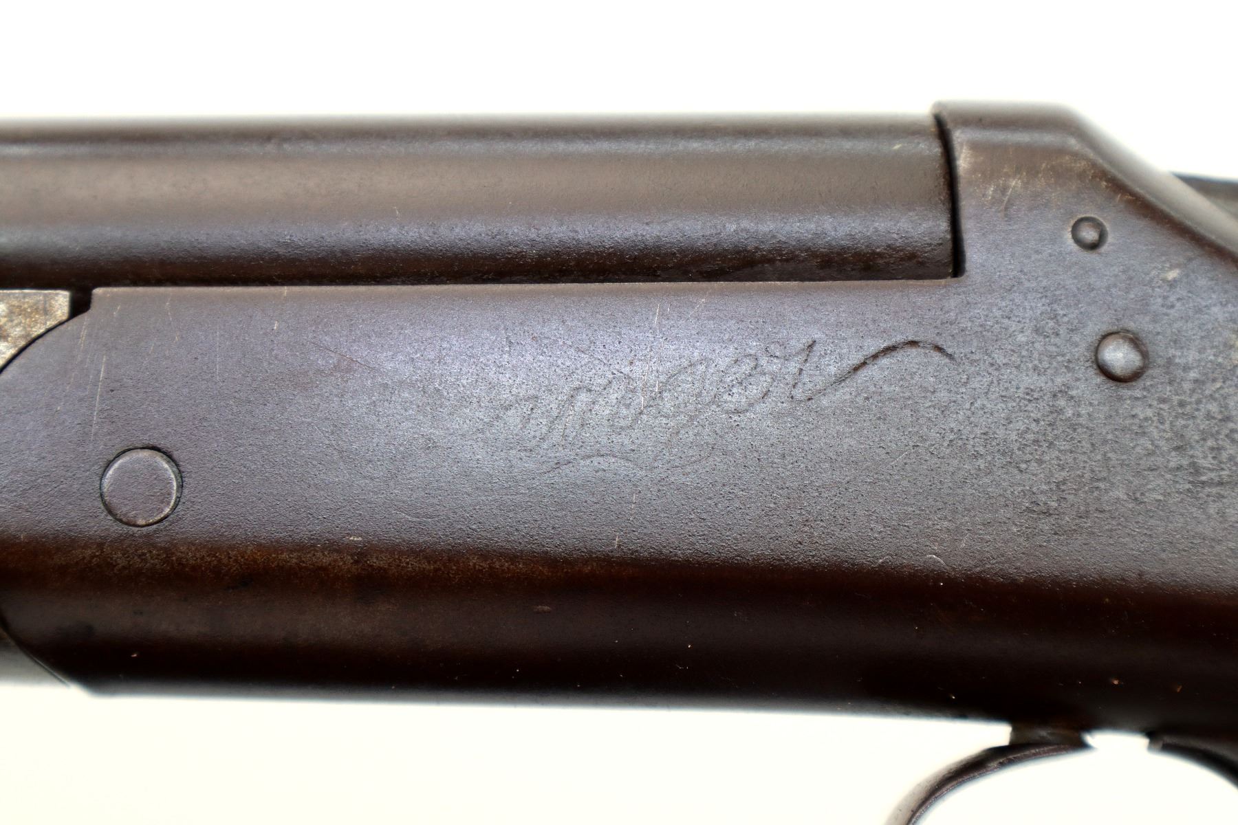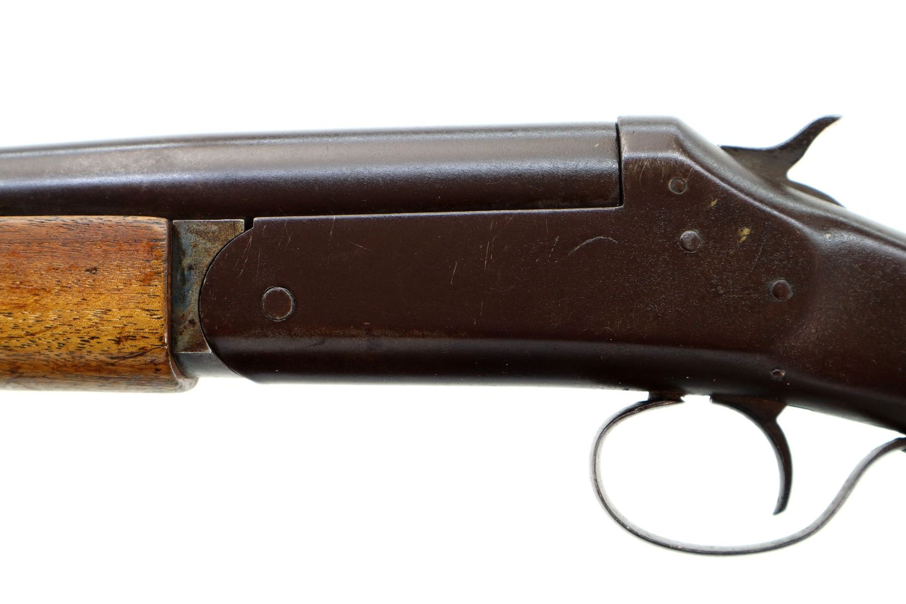 Main Description: Brass bead, round barrel, checkered spur hammer, ejector. Two piece wood stocks, forend tip is cracked, pistol grip, chipped and cracked behind receiver, black polymer butt plate