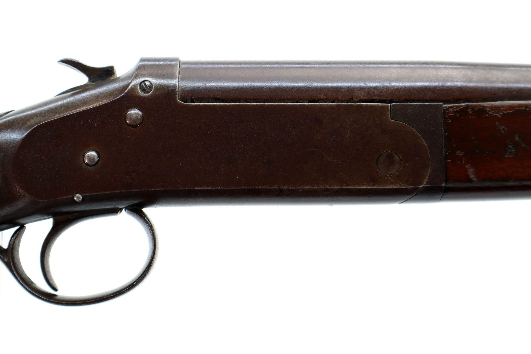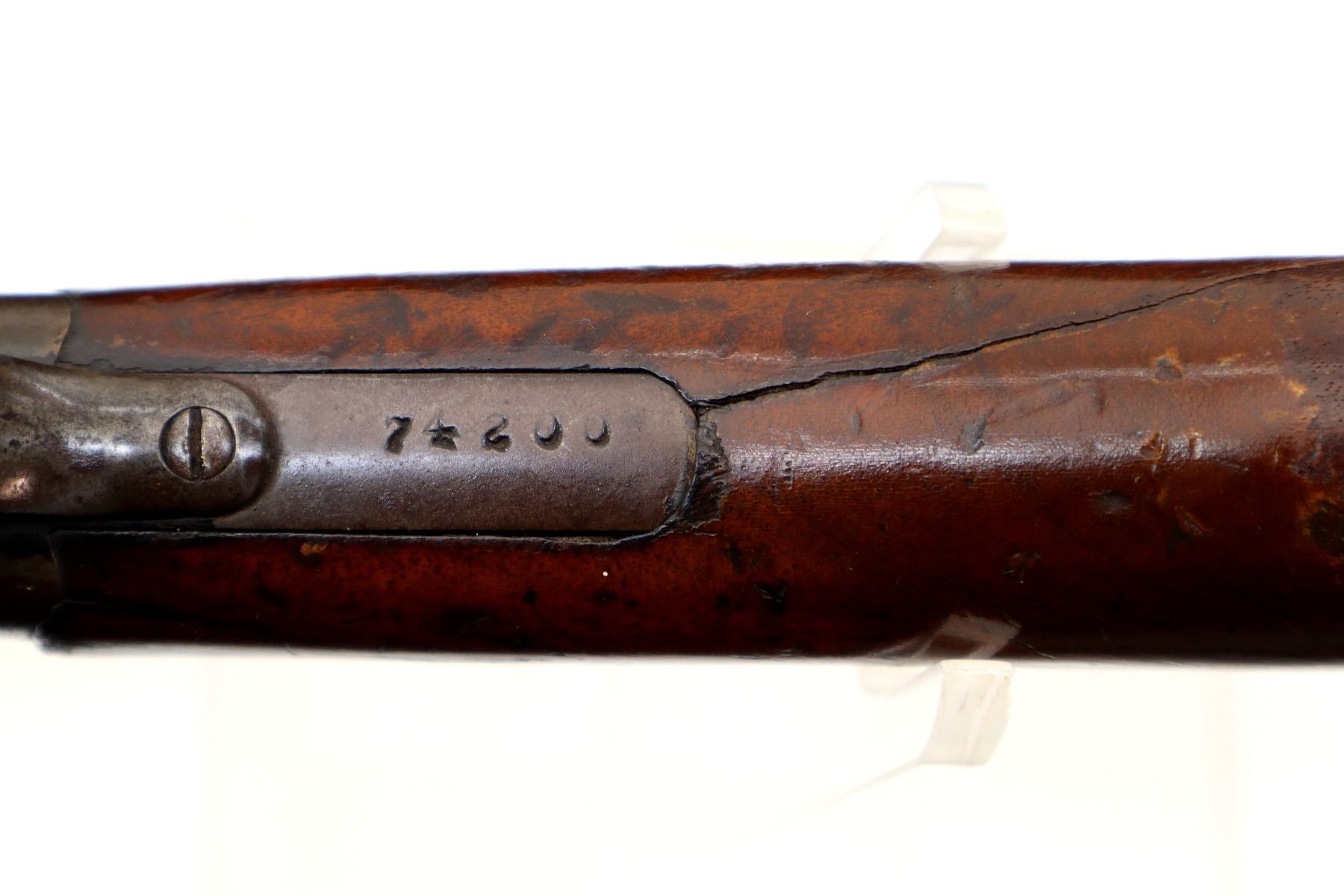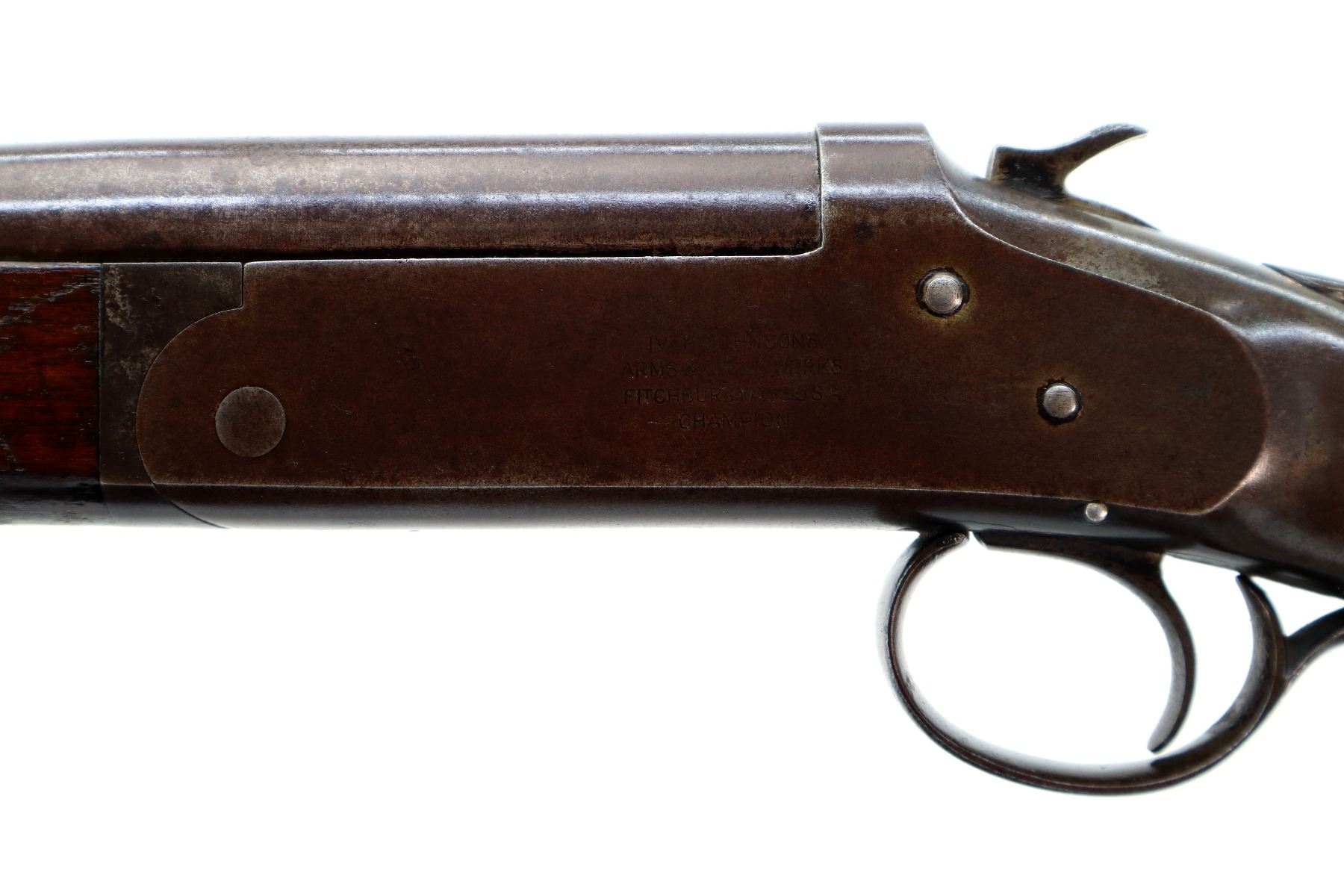 Main Description: White bead, round barrel, checkered spur hammer, extractor. Two piece wood stocks, forend cracked on left side, pistol grip, chipped and cracked behind receiver, upper and lower tangs, Grooved black polymer butt plate chipped at toe.