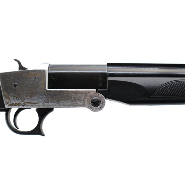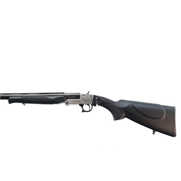 Main Description: Brass bead, blued vent rib barrel, engraved alloy receiver, grooved spur hammer, extractor, trigger guard opens action. Two piece black synthetic stocks, checkered forearm, pistol grip and black polymer butt plate, ambi cheek rest, sling swivels.