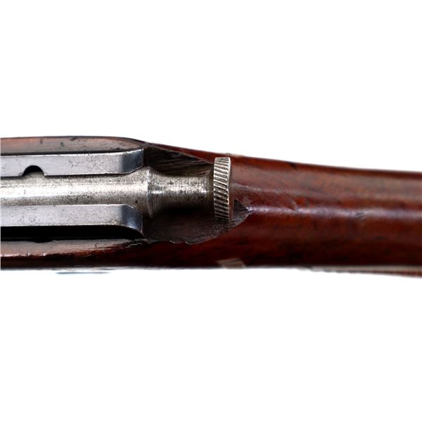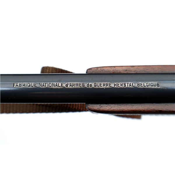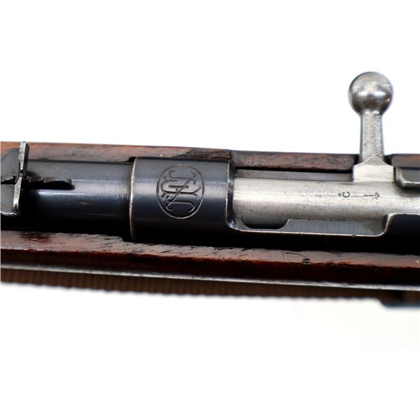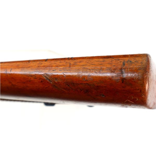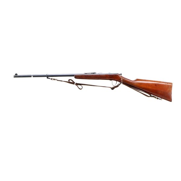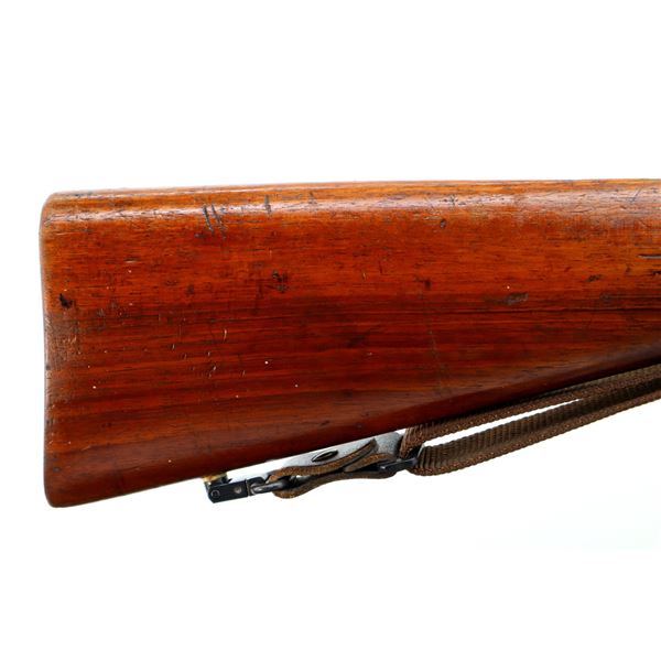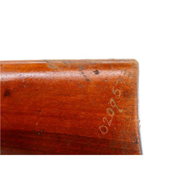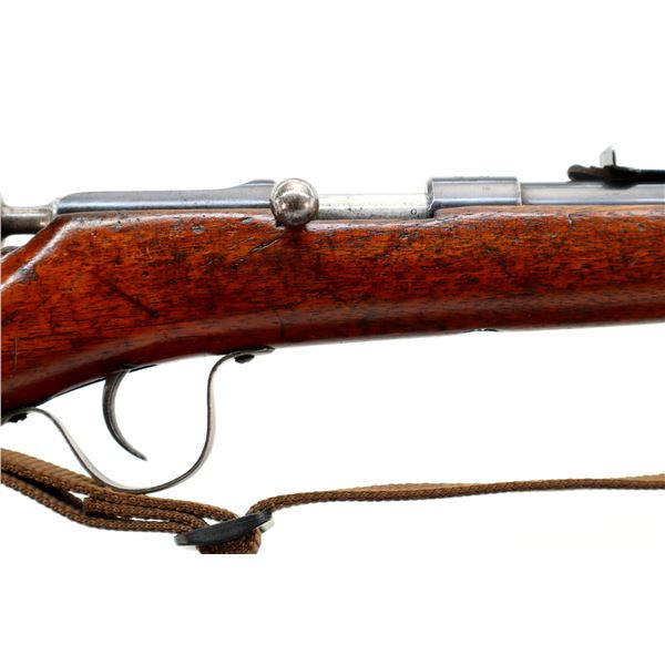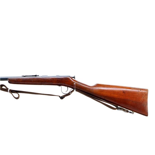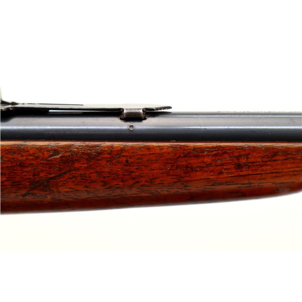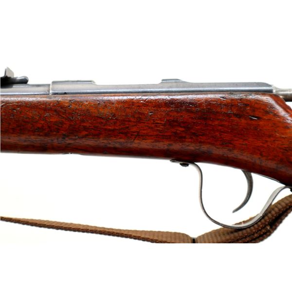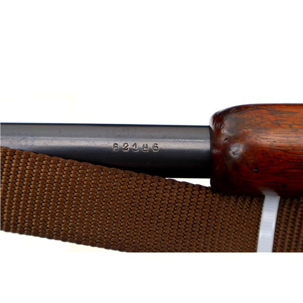 Main Description: Blade front sight, adjustable u notched rear sight, blued finish, straight bolt handle, extractor is present. One piece wood stock, straight grip chipped and cracked behind receiver, smooth butt, number etched on left side, sling swivels with brown nylon sling.