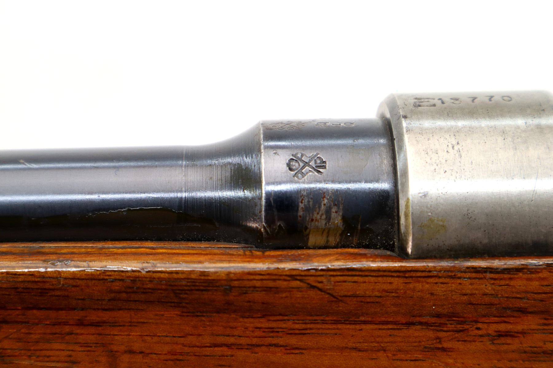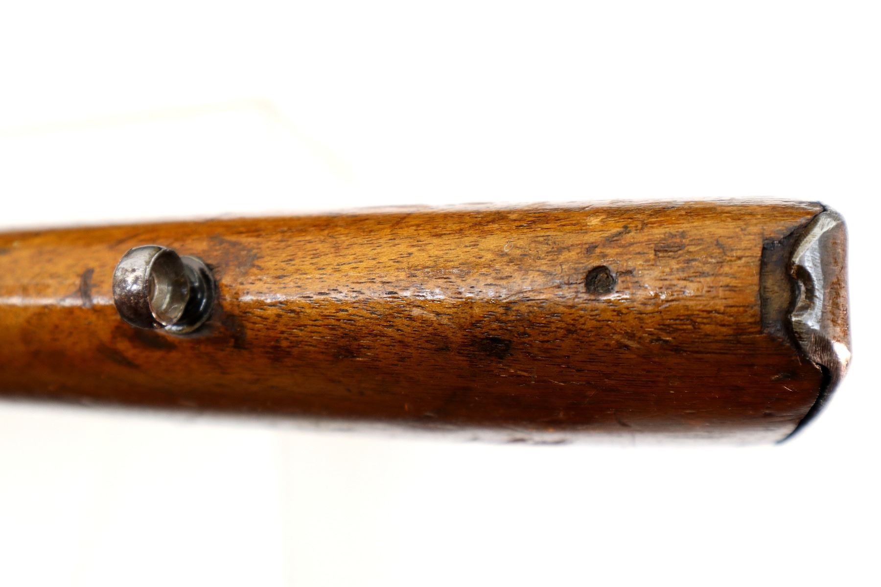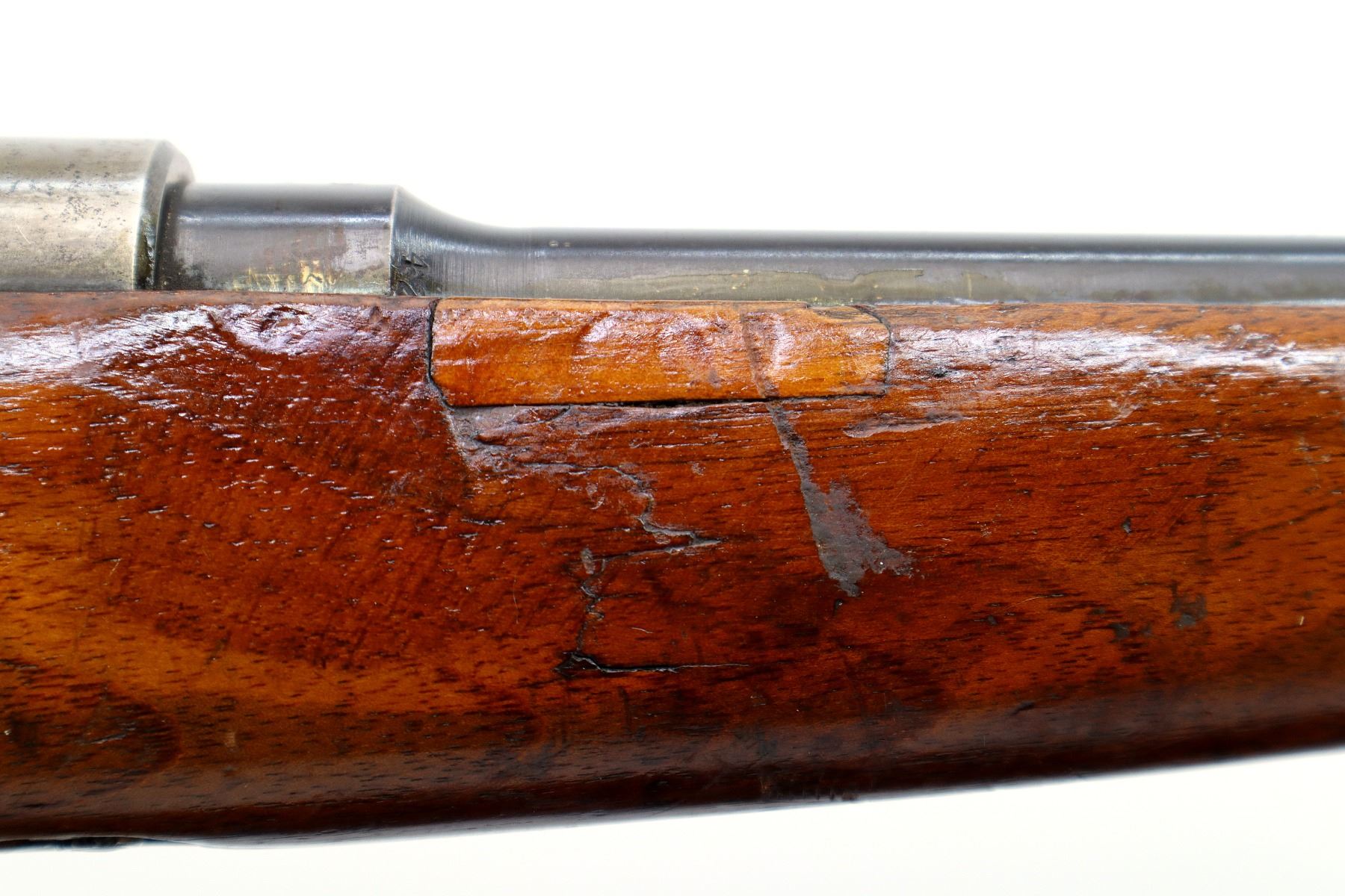 Main Description: No front sight, has the ramp, missing rear sight threaded holes are plugged, blued finish, bolt has a custom fixed peep sight installed, flag safety. One piece sporterized wood stock, forearm has some repair spots, pistol grip, smooth steel butt plate with brass trap, stock cracked in front of trigger guard, swivel studs.