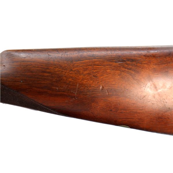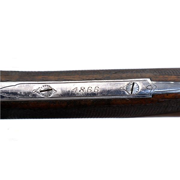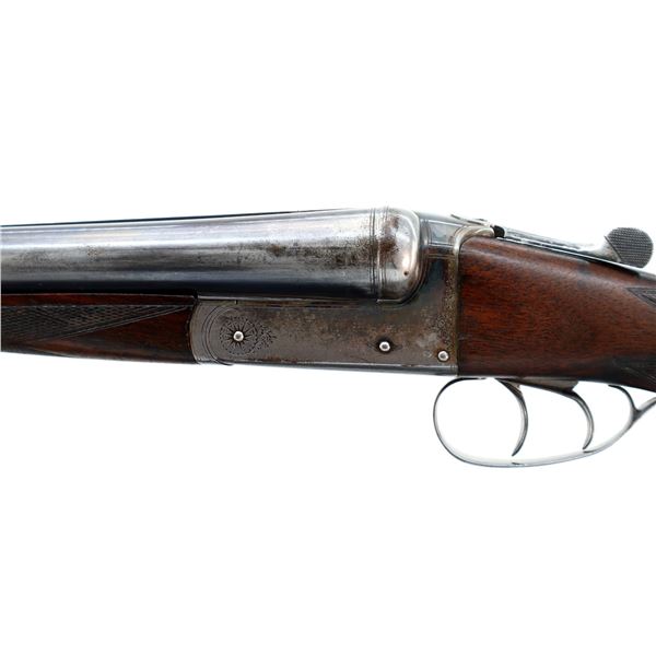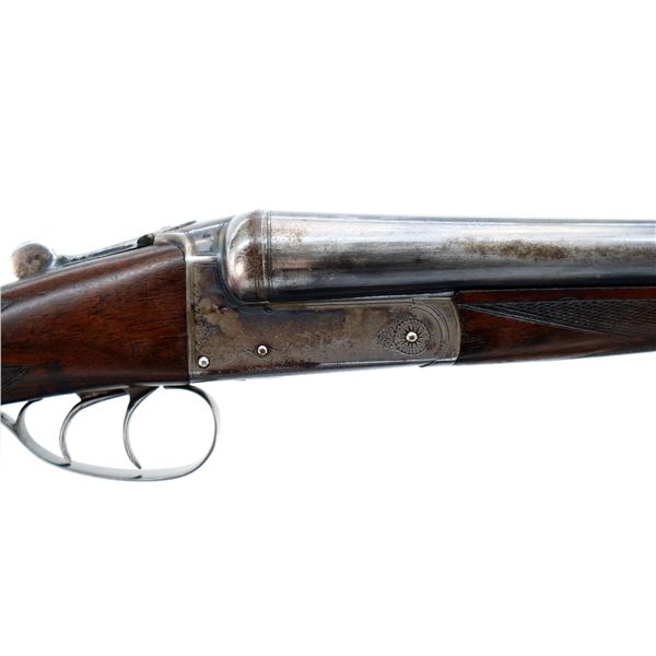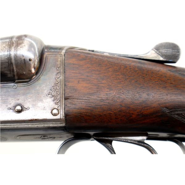 Main Description: Blued barrels with smooth rib that chime and are tight on face, border engraved colour case hardened receiver, automatic safety, extractor, double triggers. Note: opening lever requires repair or adjustment, slightly loose. Two piece wood stocks, checkered forearm and straight grip, stock cracked behind receiver, grooved butt, vanity plate