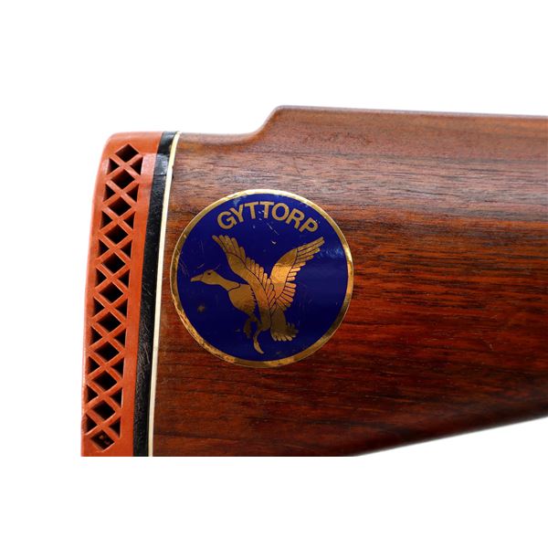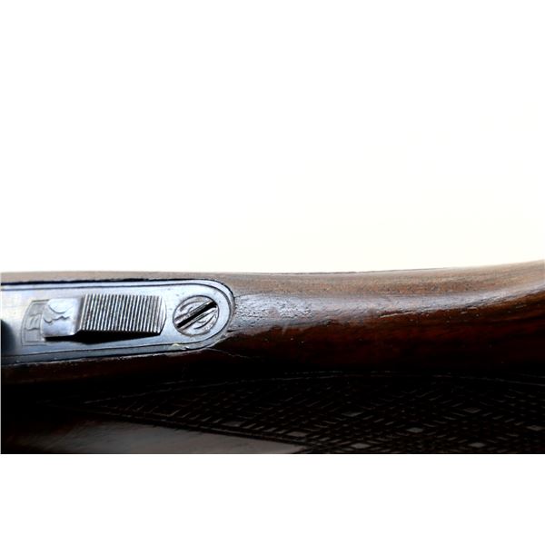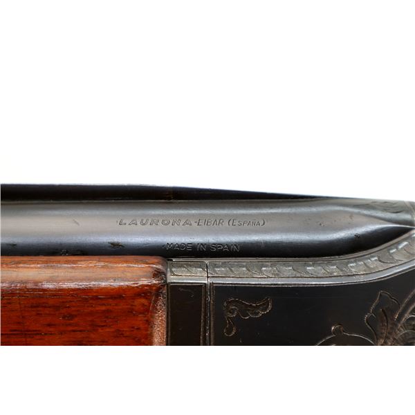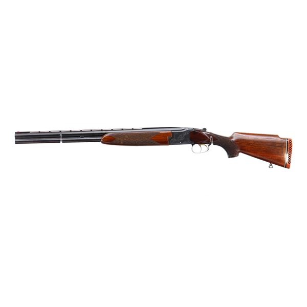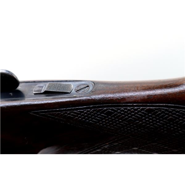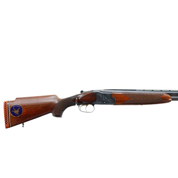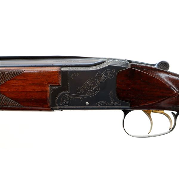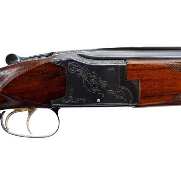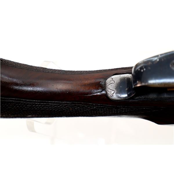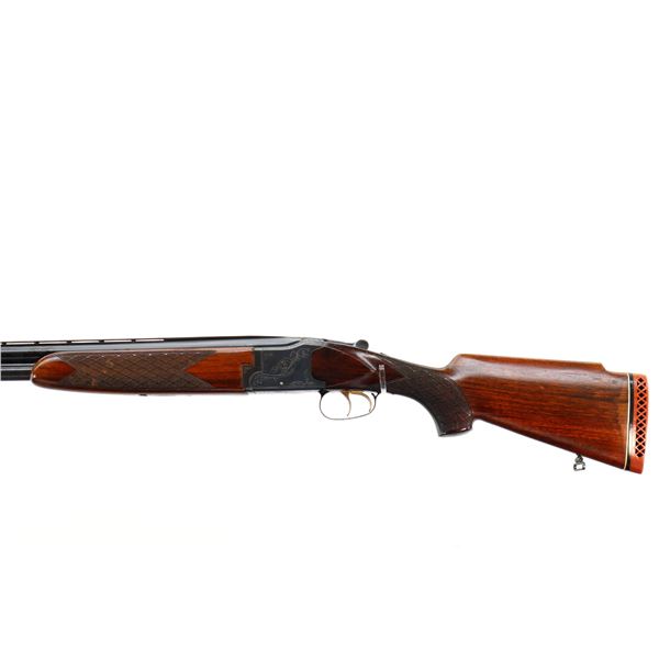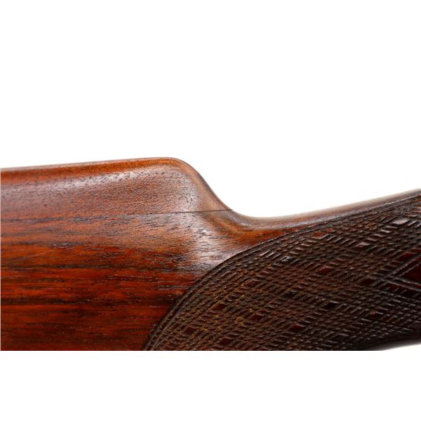 Main Description: Orange fiber optic front blade, blued finish, vent rib, engraved receiver, automatic safety, extractor, double triggers. Two piece wood stocks, checkered forearm and pistol grip, cracked behind trigger guard, modified raised comb, red vented rubber recoil pad, sticker on right side of stock, 14.25" LOP, has a rear sling swivel, front is broken off.