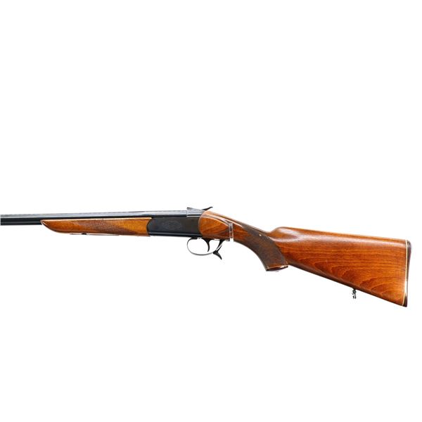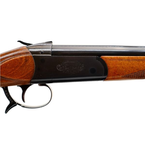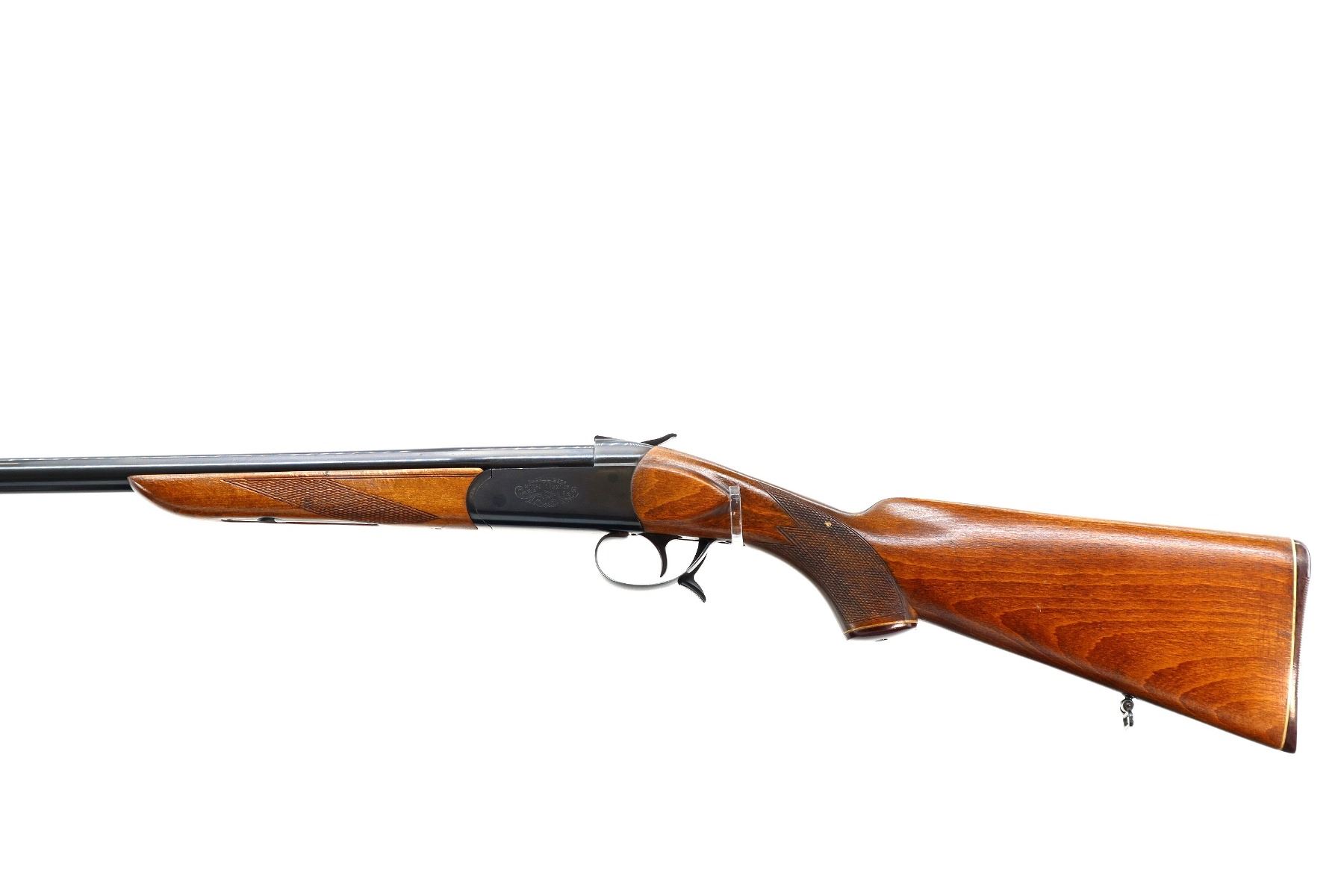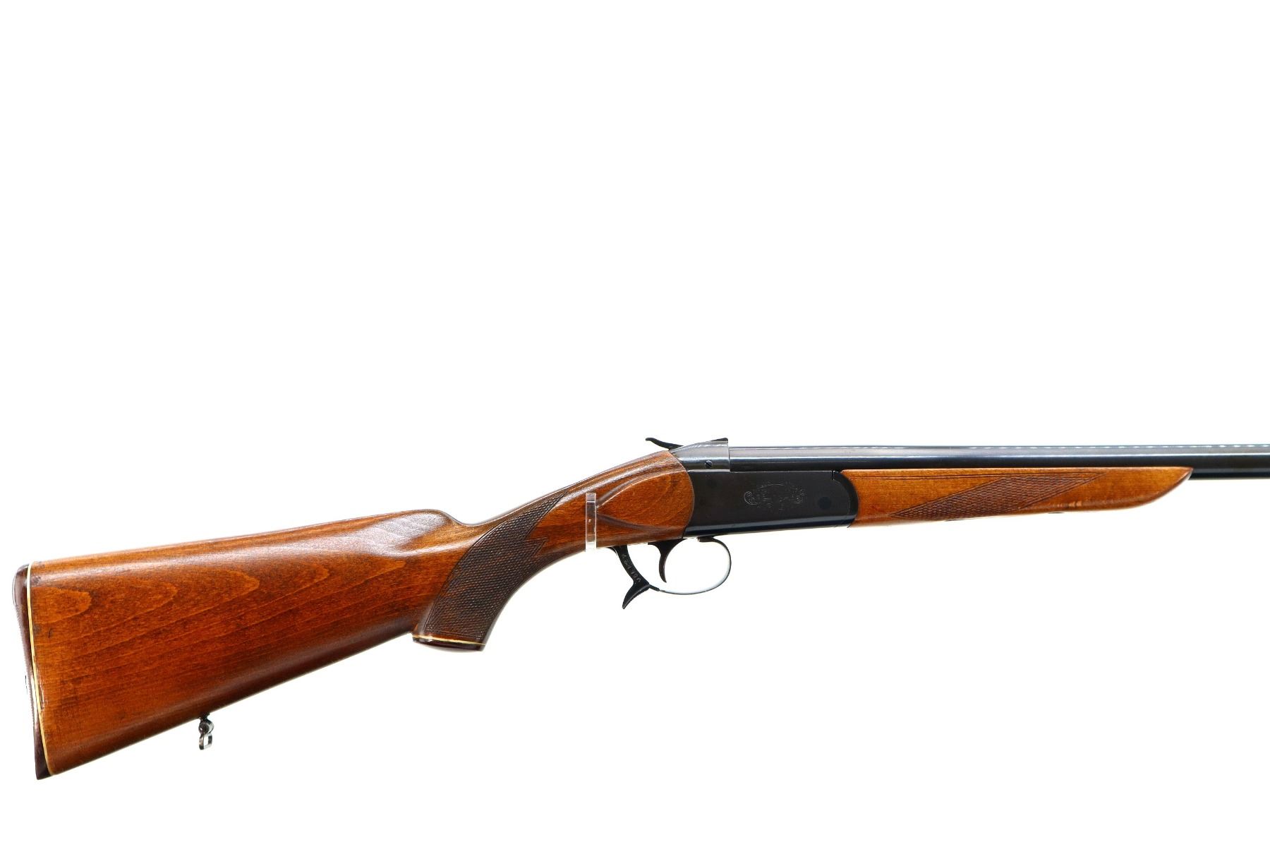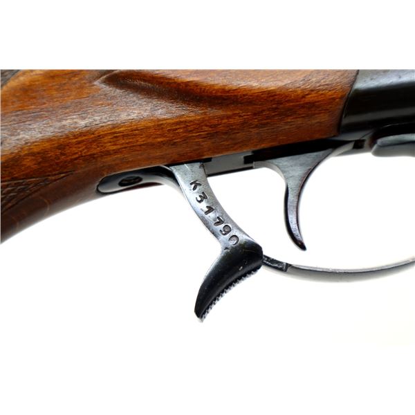 Main Description: Brass bead, blued finish, round barrel, engraved receiver, grooved spur hammer, extractor, opening lever behind trigger guard. Two piece wood stocks, checkered forearm and pistol grip, grooved brown polymer butt plate, grip cap, sling swivels.