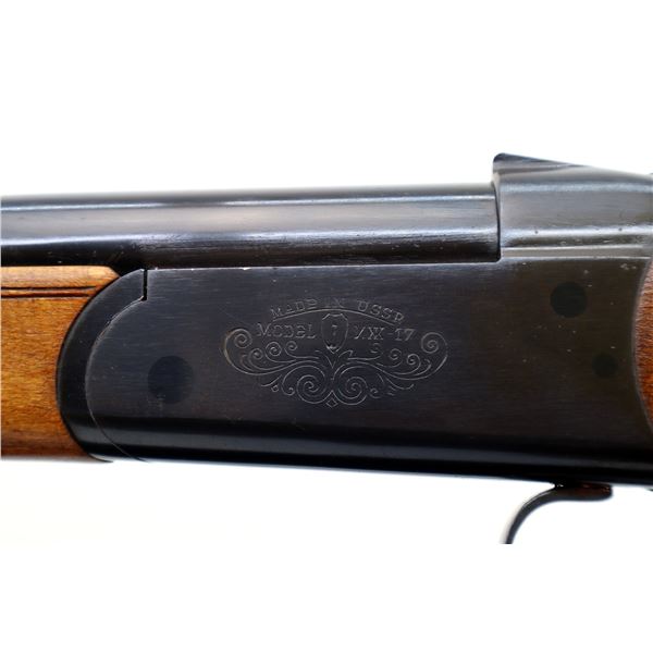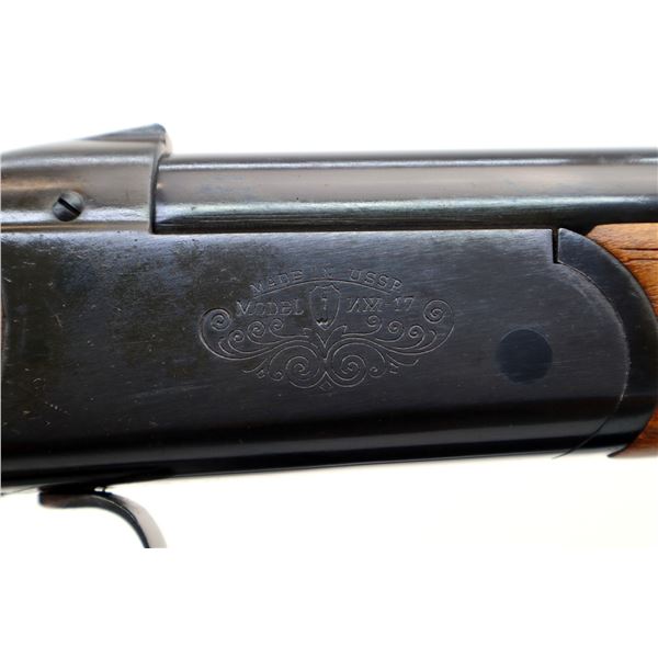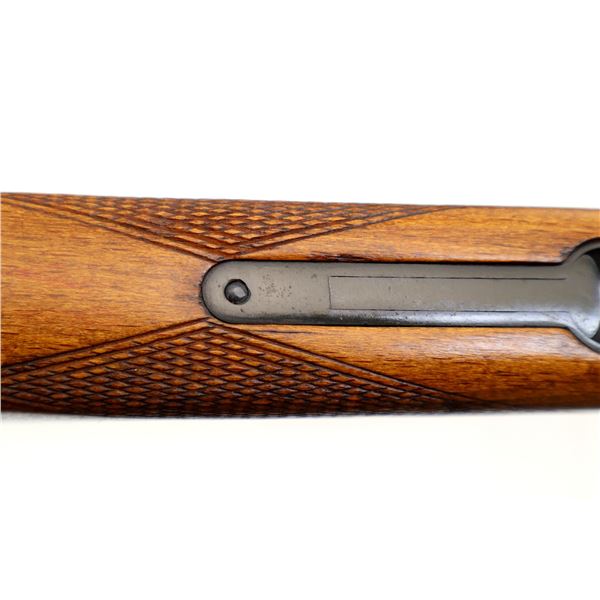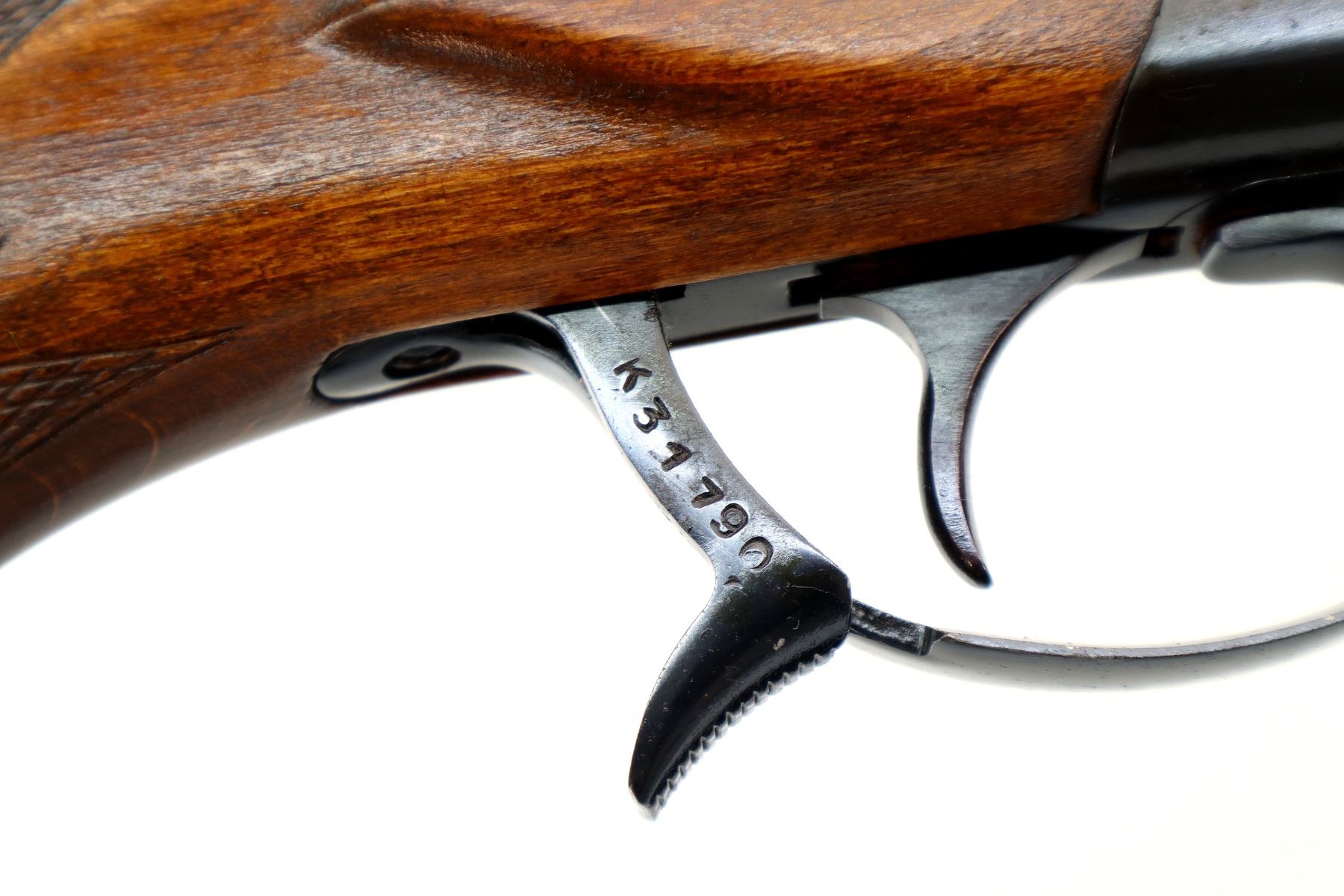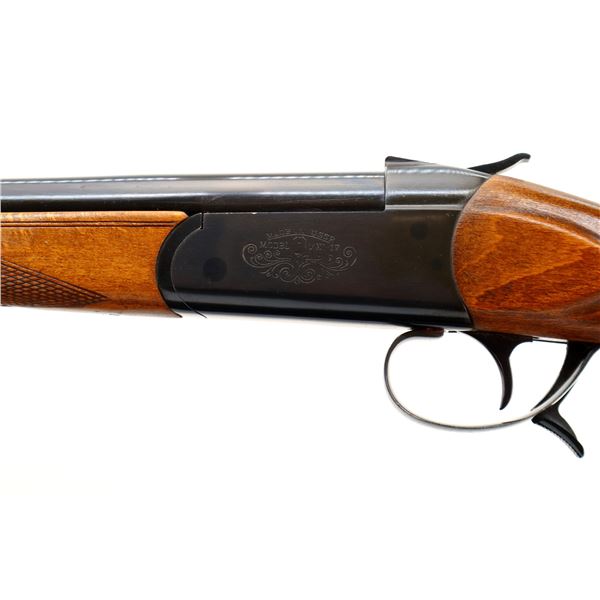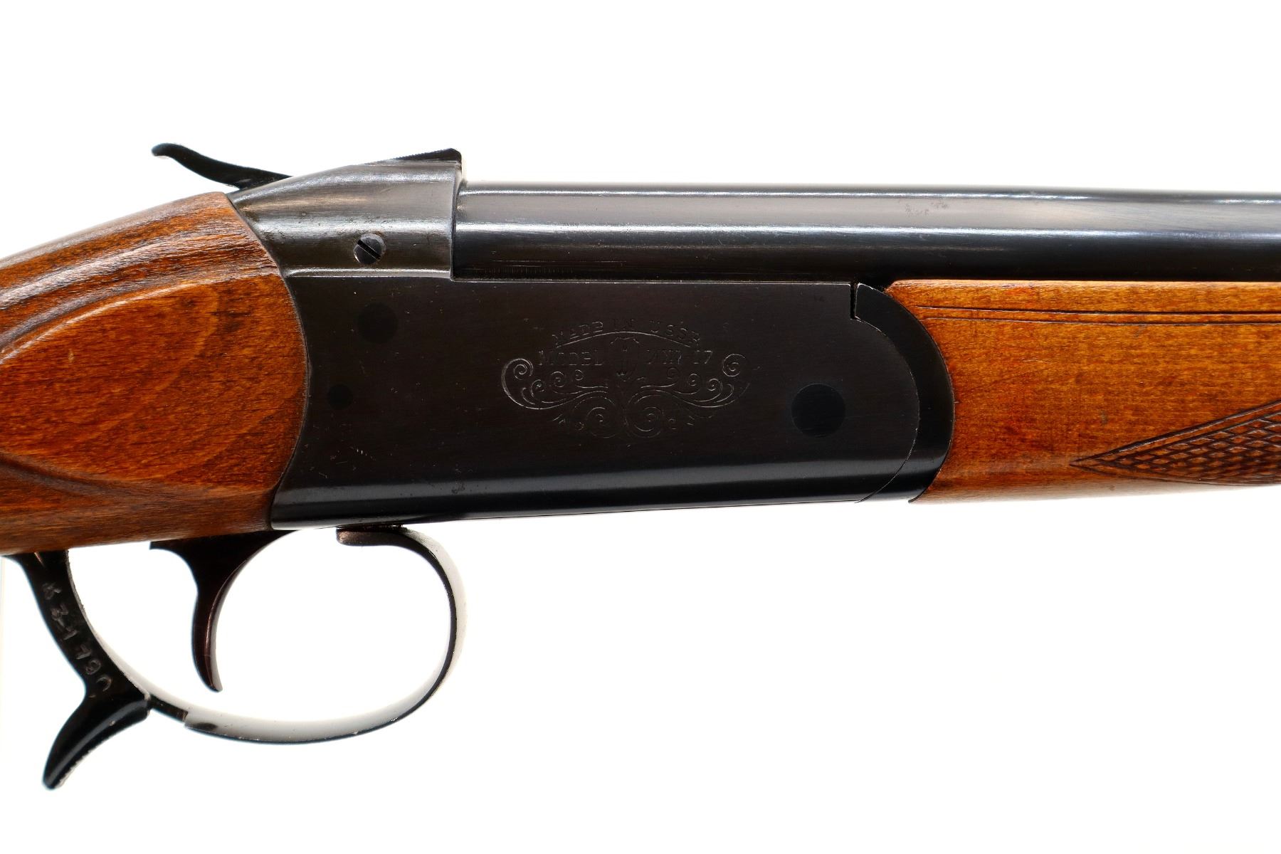 Main Description: Brass bead, blued finish, round barrel, engraved receiver, grooved spur hammer, extractor, opening lever behind trigger guard. Two piece wood stocks, checkered forearm and pistol grip, grooved brown polymer butt plate, grip cap, sling swivels.