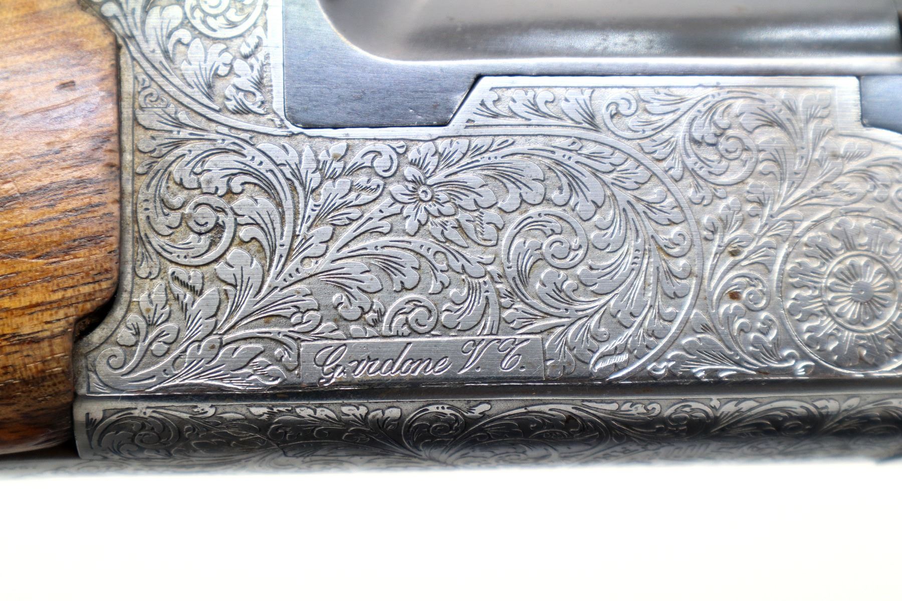Main Description: Blade front sight with ramp, adjustable folding u notched rear sight, blued barrels with solid rib drilled and tapped with unknown scope base at rear, engraved silver receiver, automatic safety, extractor, double triggers. Two piece wood stocks, checkered forearm and pistol grip, stock chipped, cracked and repaired behind receiver and tangs, stock is cast to the left, smooth wood butt plate, 14.25" LOP, sling swivels.