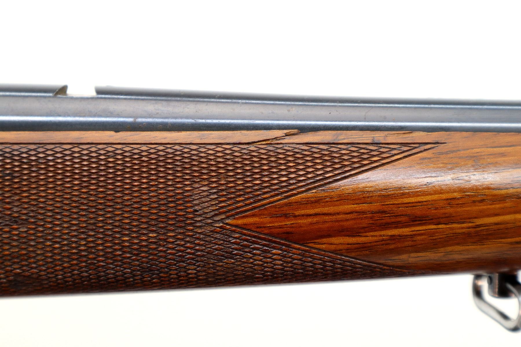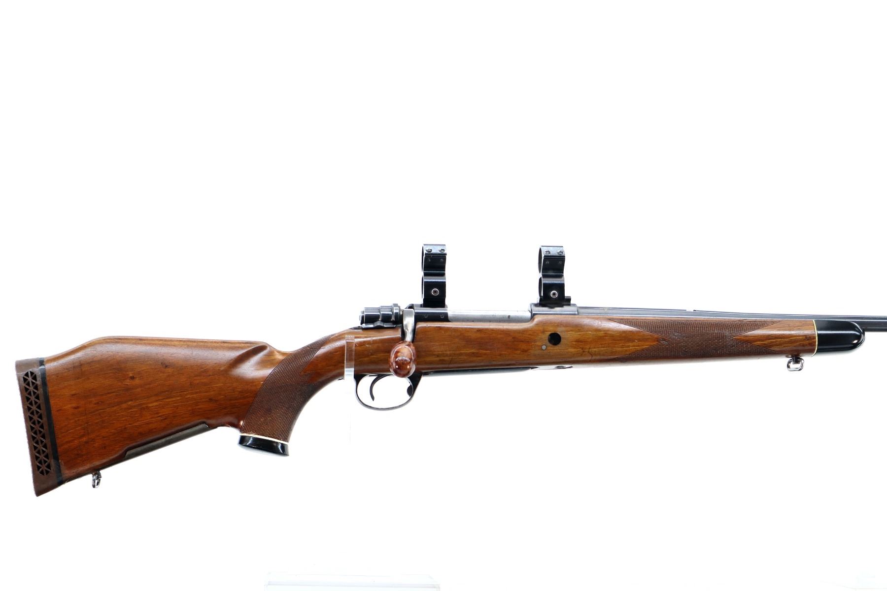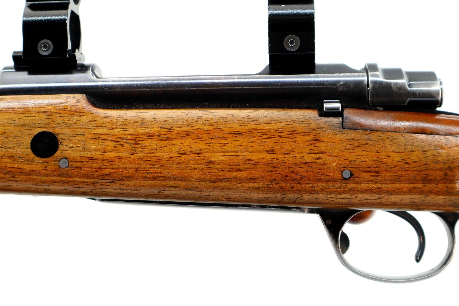 Main Description: Missing front and rear sights, rear dovetail present, blued finish, receiver drilled and tapped with two piece 1" see thru rings installed, large wood bolt knob. One piece wood stock, black polymer forend and pistol grip caps, checkered forearm and pistol grip chipped and cracked behind receiver, cheek rest, brown vented rubber recoil pad, 12.75" LOP, hinged floor plate, four round shell holder in bottom of stock, sling swivels, also has three Anschutz Biathlon sling points installed