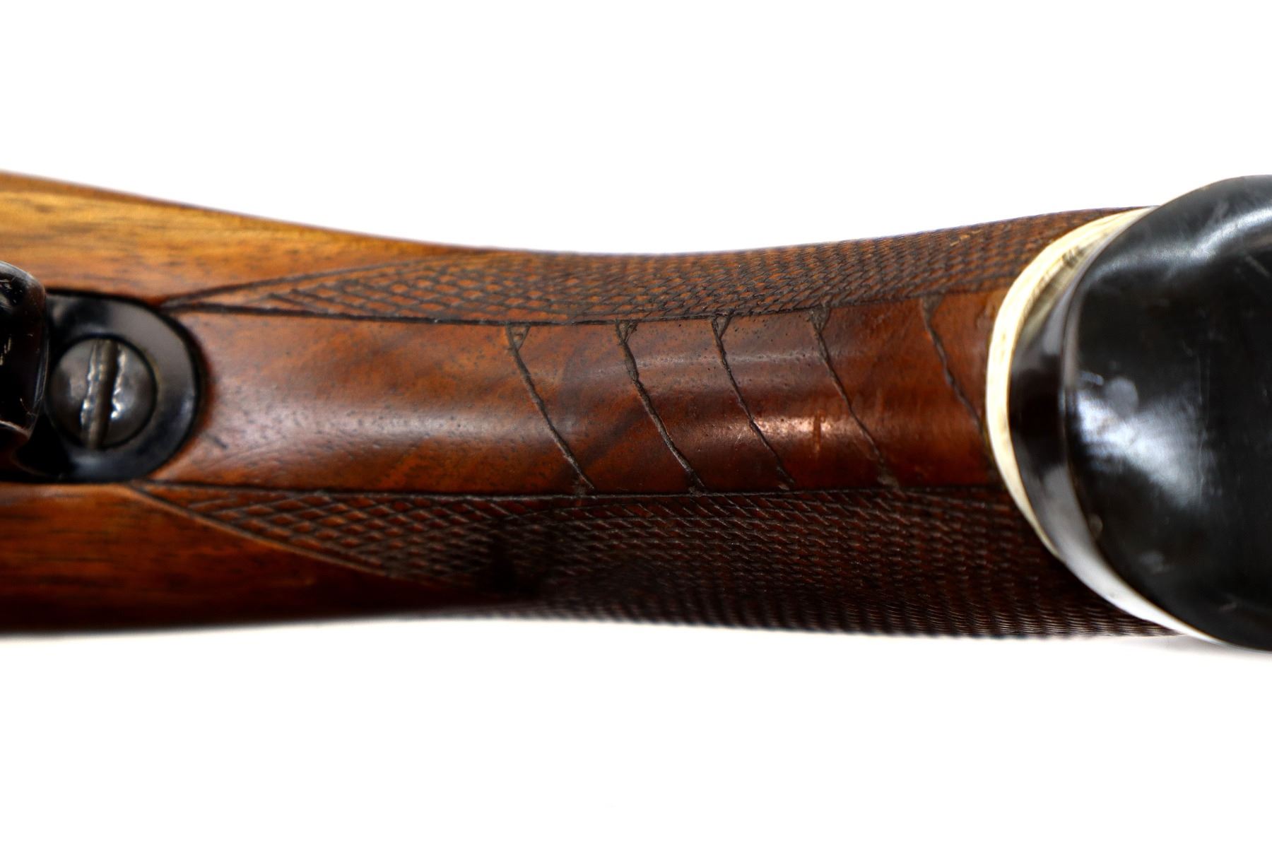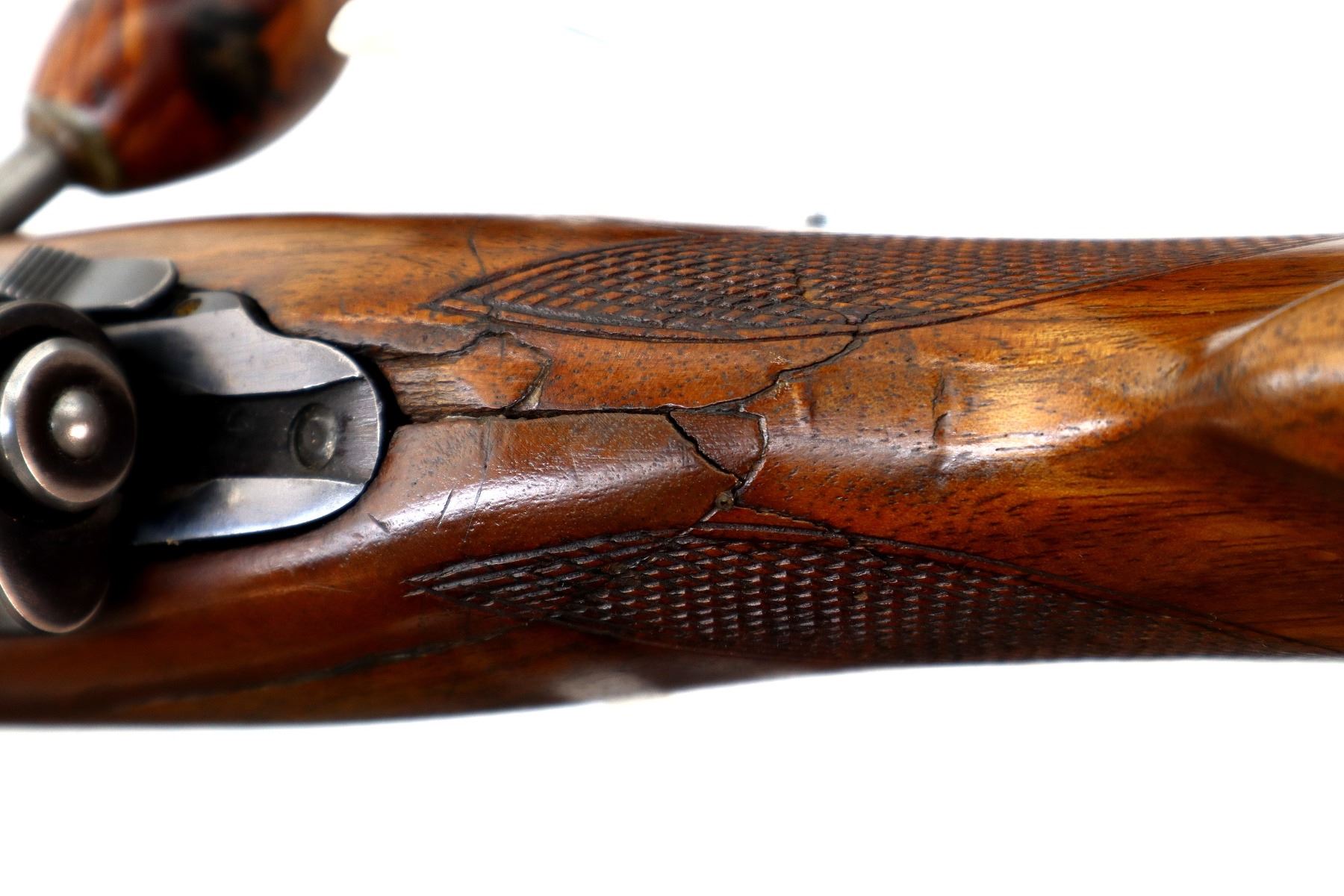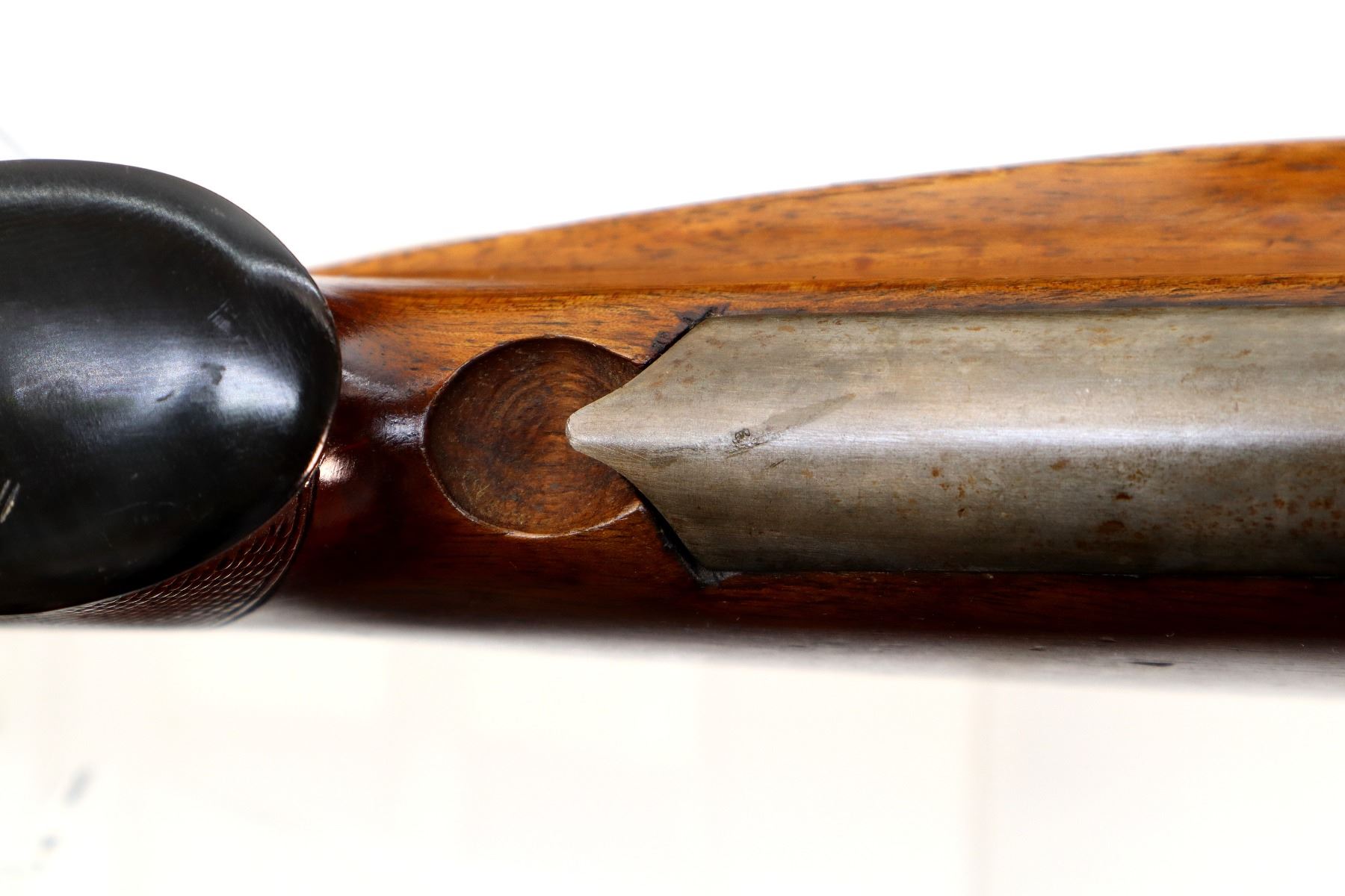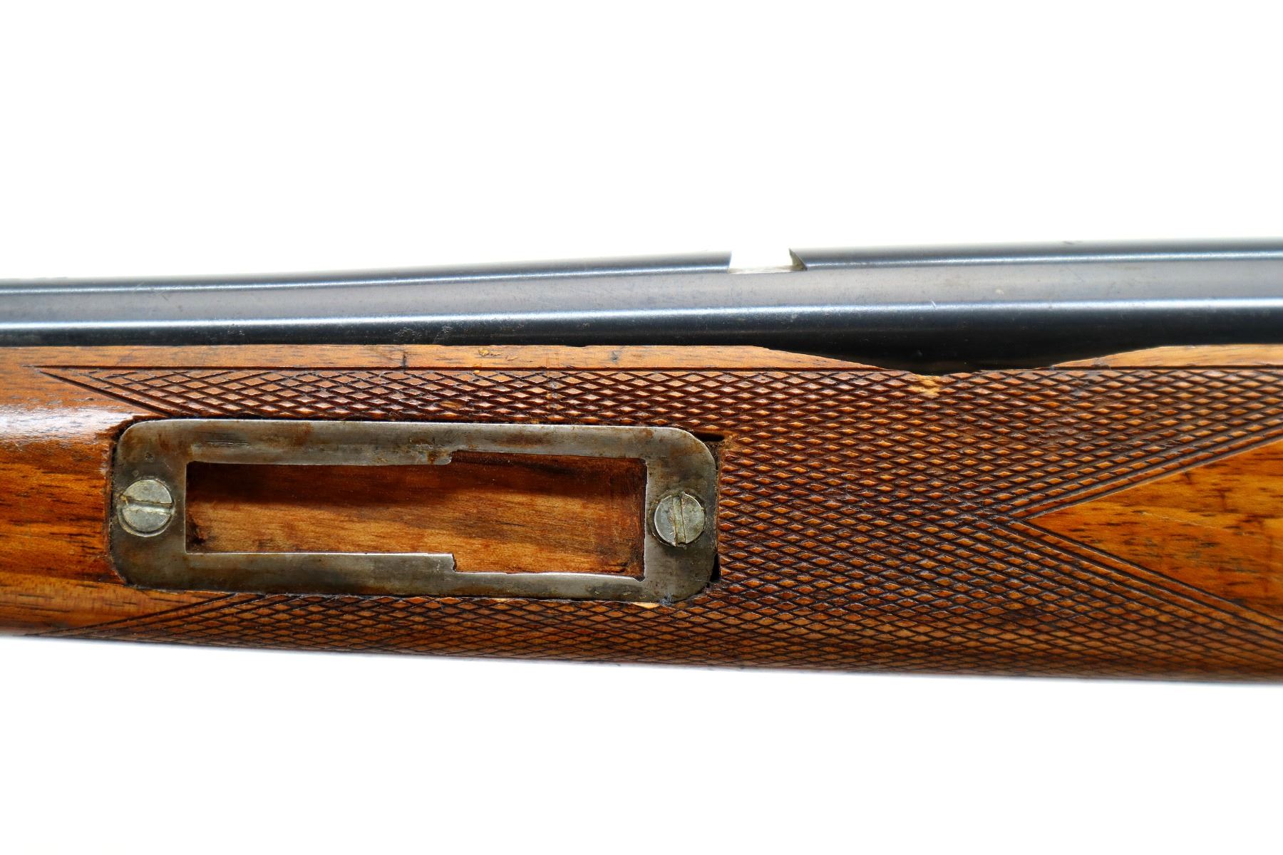 Main Description: Missing front and rear sights, rear dovetail present, blued finish, receiver drilled and tapped with two piece 1" see thru rings installed, large wood bolt knob. One piece wood stock, black polymer forend and pistol grip caps, checkered forearm and pistol grip chipped and cracked behind receiver, cheek rest, brown vented rubber recoil pad, 12.75" LOP, hinged floor plate, four round shell holder in bottom of stock, sling swivels, also has three Anschutz Biathlon sling points installed