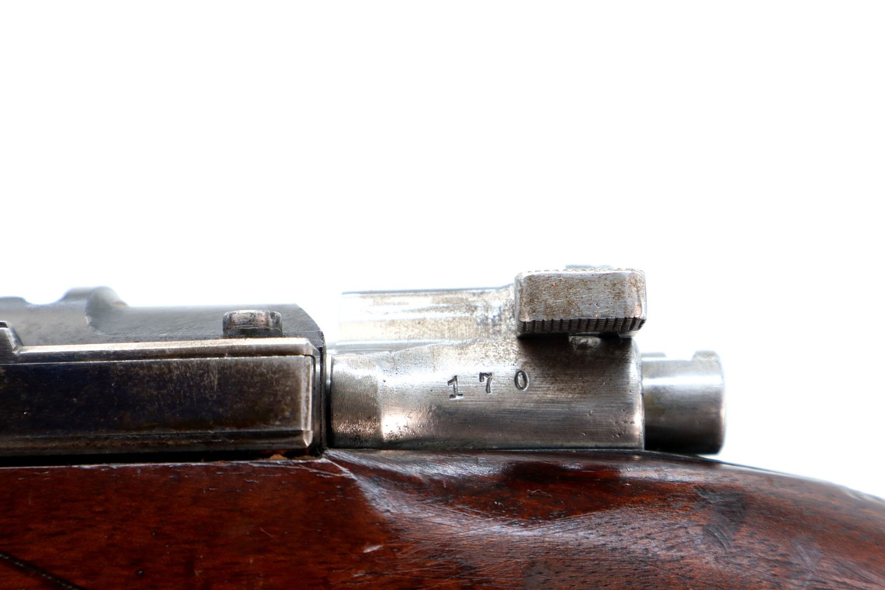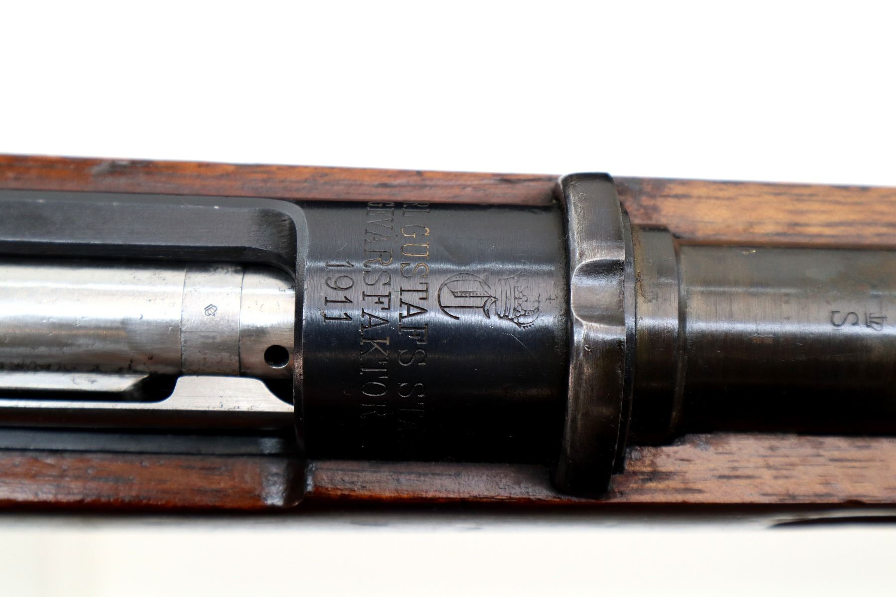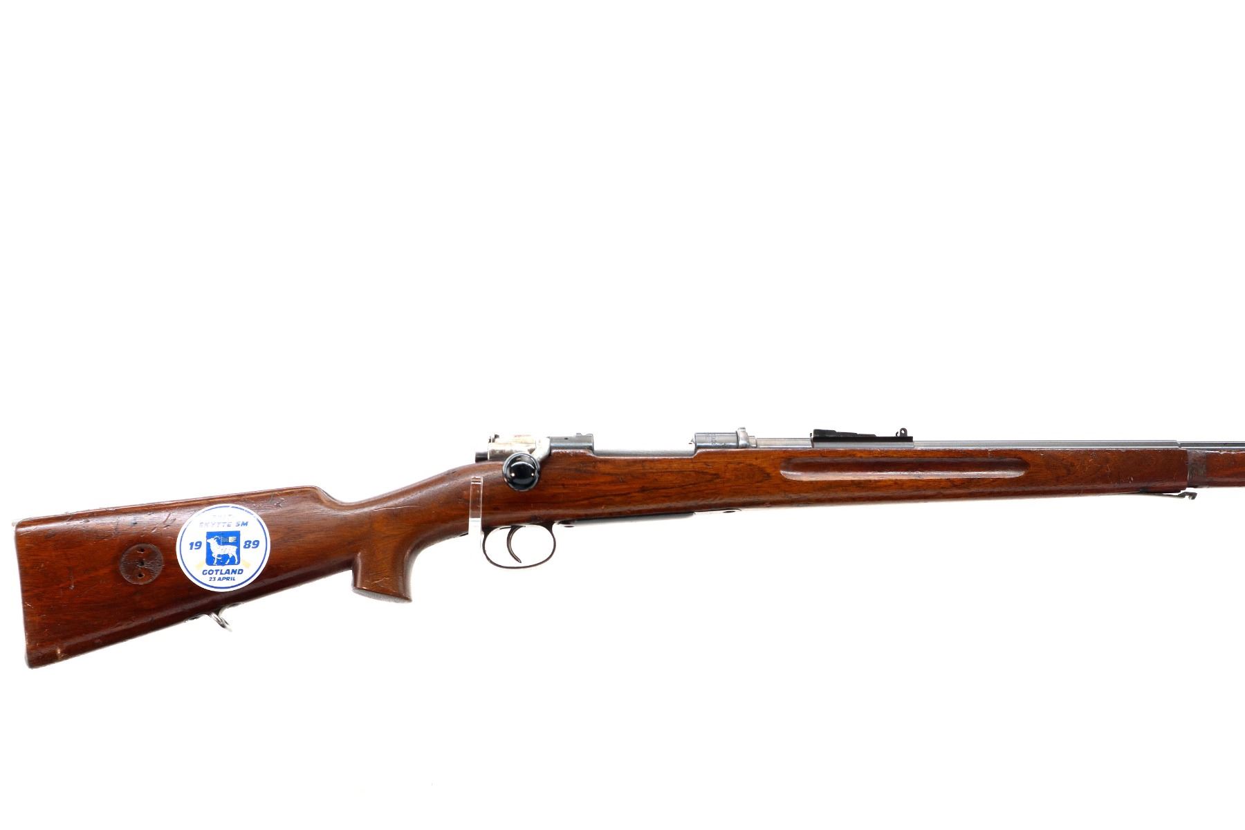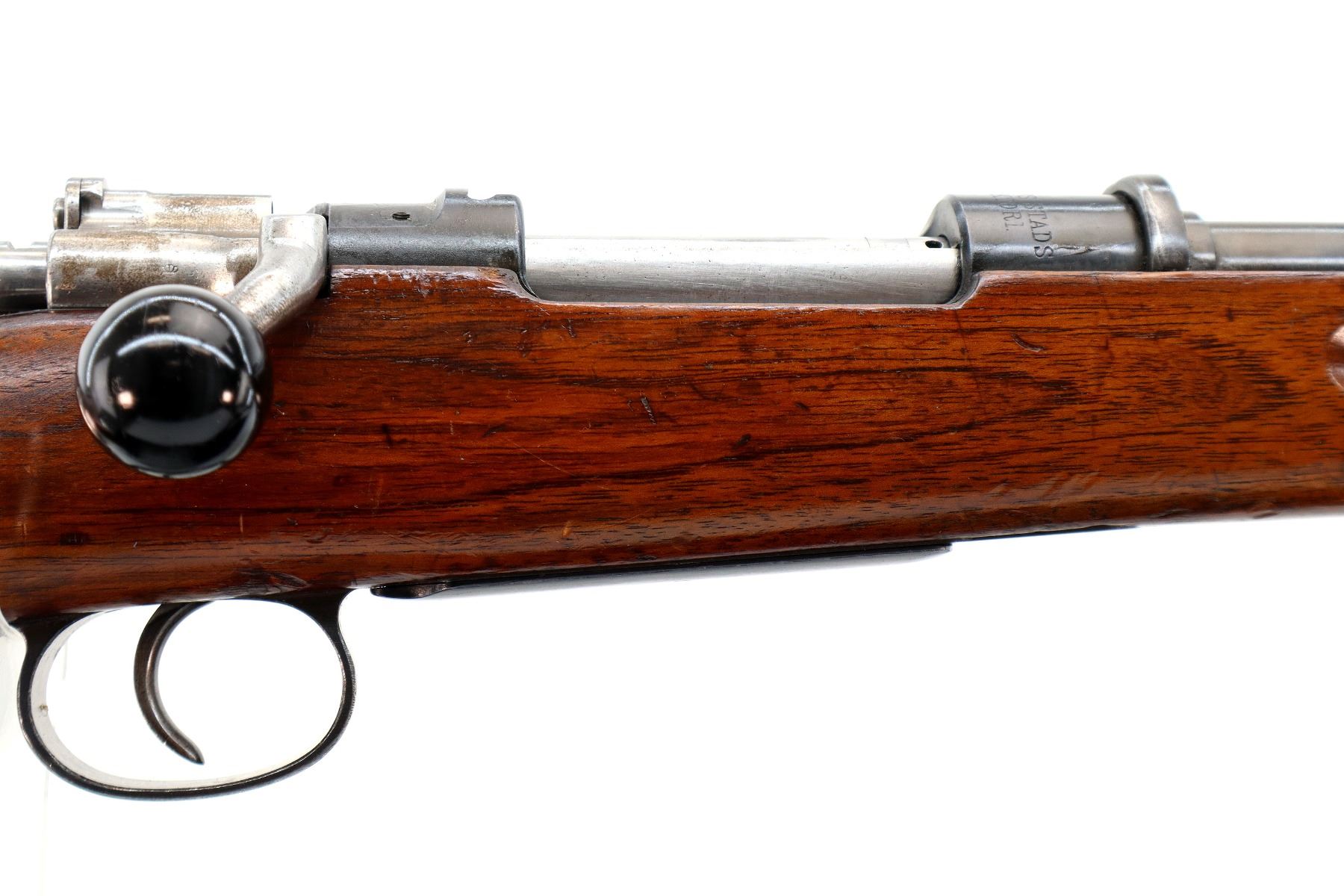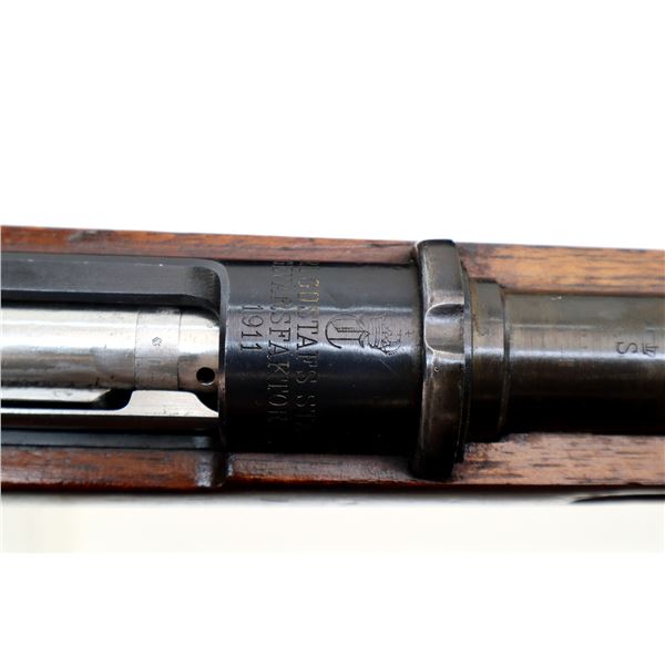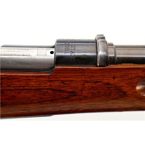 Main Description: Manufactured by Carl Gustafs 1911, serial numbers mismatched. This rifle is missing front sight, rear sight leaf and spring, rear handguard, barrel bands, stock disk and front trigger guard screw. Has front sight and rear sight ramps, blued finish, receiver bridge drilled and tapped with no plug screws, silver bolt with modified handle and black polymer knob, action does not fire requires parts or repair. One piece full military wood stock, finger grooved forearm, modified pistol grip, smooth steel butt plate, sticker on right side of stock, rear sling swivel only.