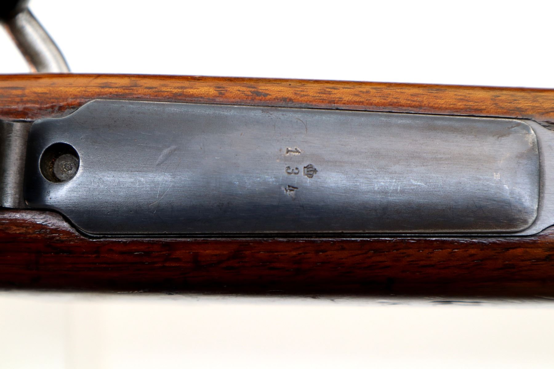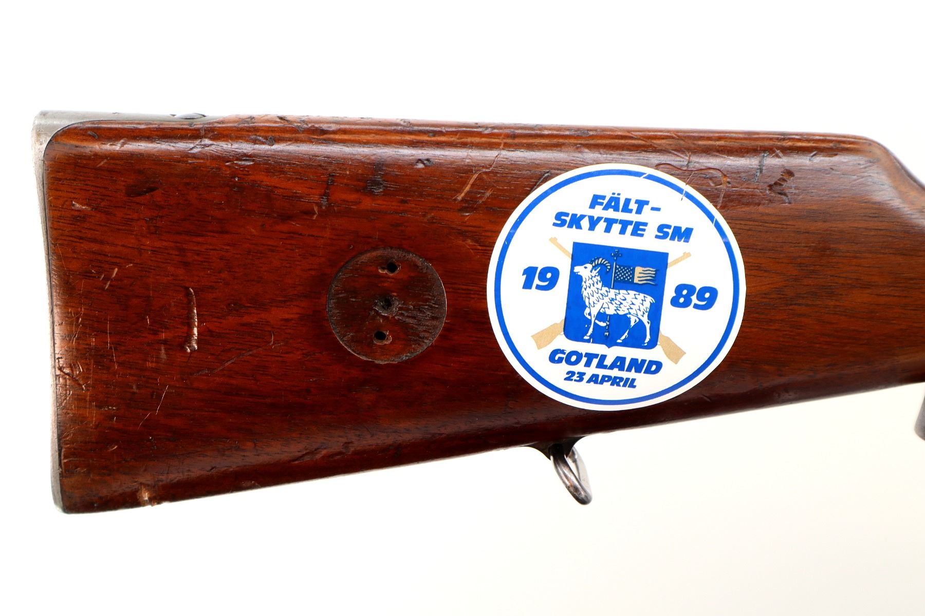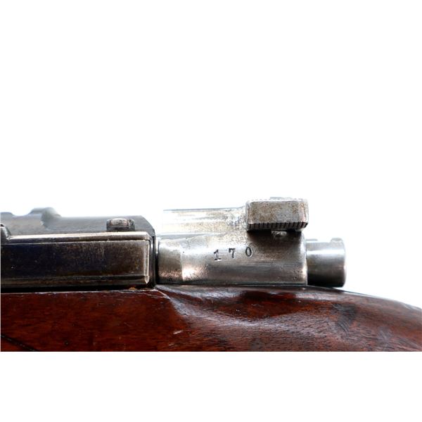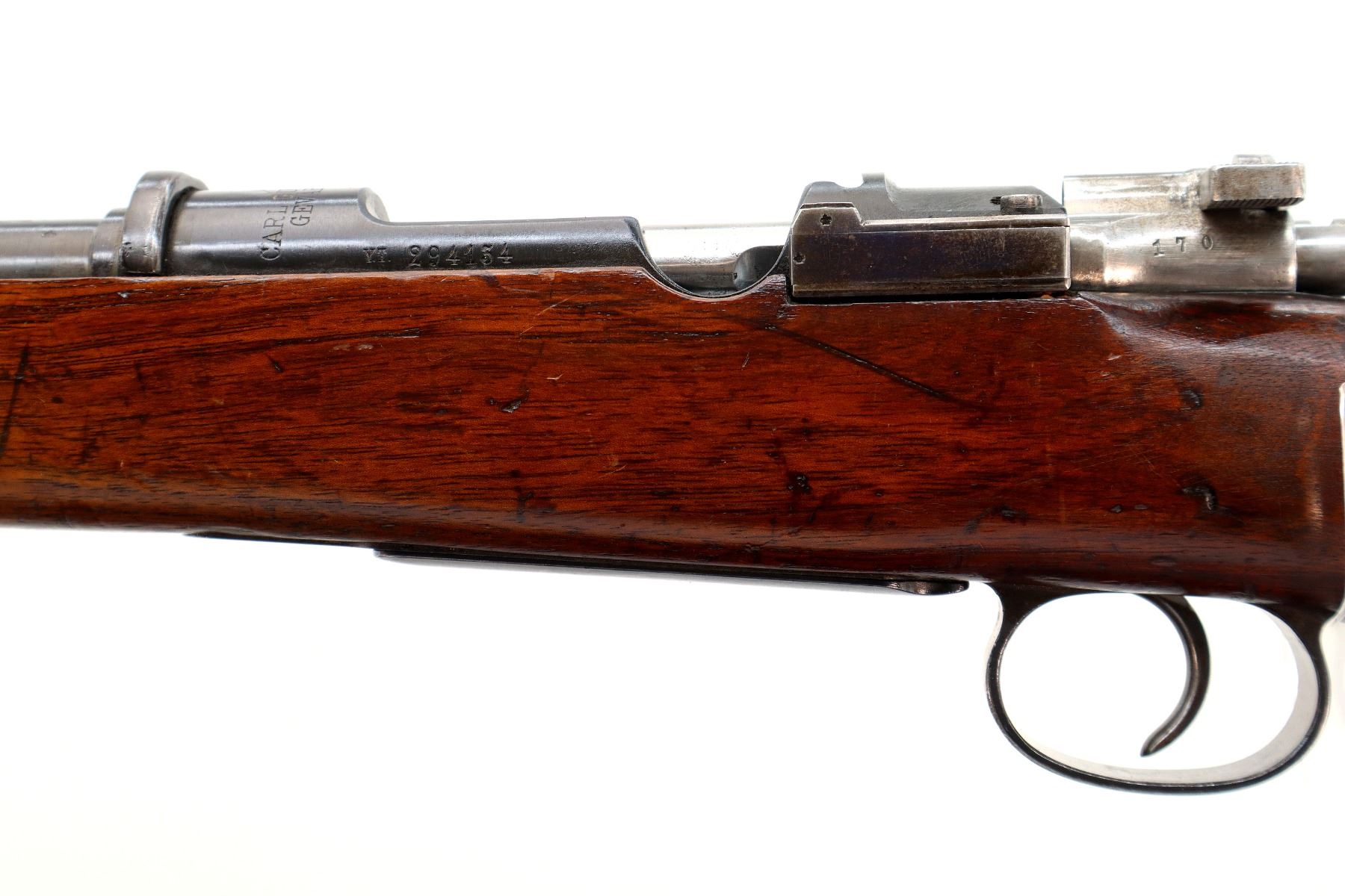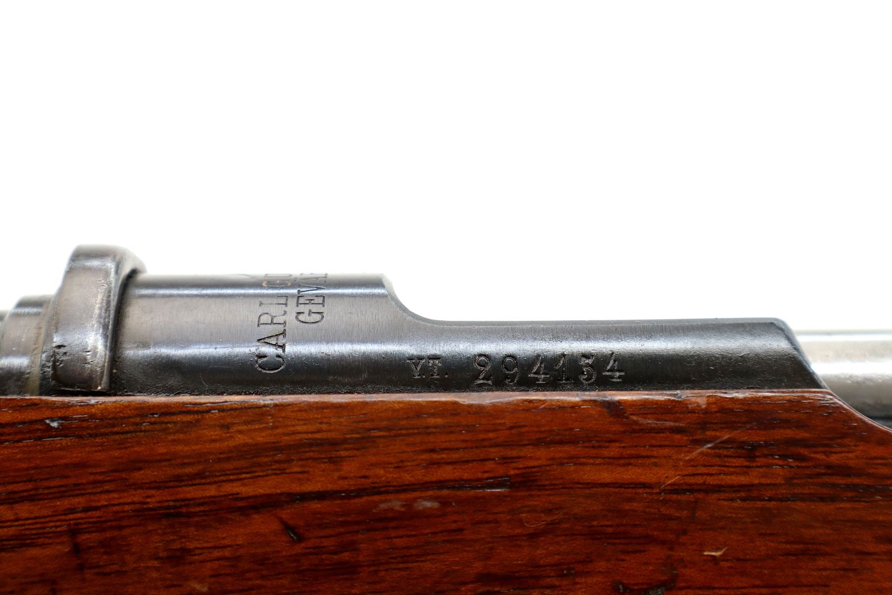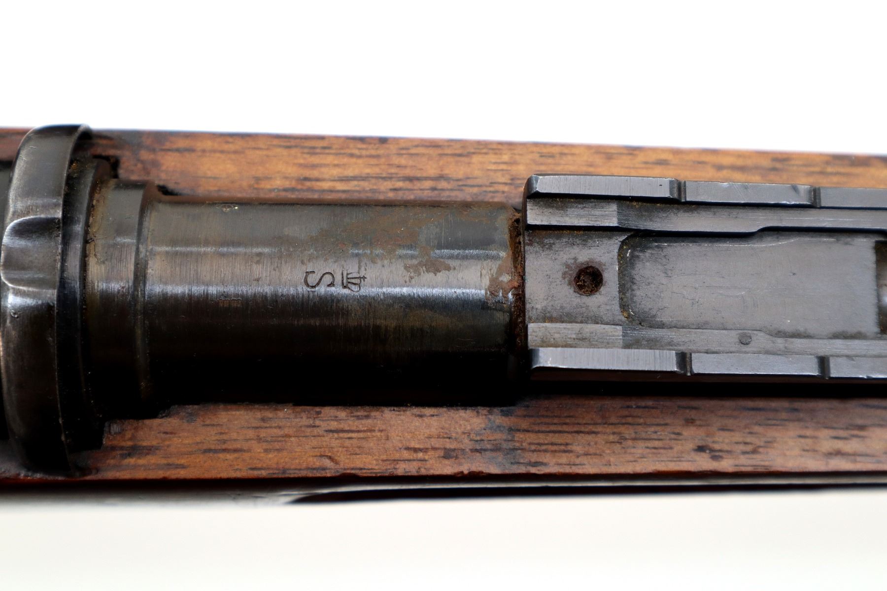 Main Description: Manufactured by Carl Gustafs 1911, serial numbers mismatched. This rifle is missing front sight, rear sight leaf and spring, rear handguard, barrel bands, stock disk and front trigger guard screw. Has front sight and rear sight ramps, blued finish, receiver bridge drilled and tapped with no plug screws, silver bolt with modified handle and black polymer knob, action does not fire requires parts or repair. One piece full military wood stock, finger grooved forearm, modified pistol grip, smooth steel butt plate, sticker on right side of stock, rear sling swivel only.