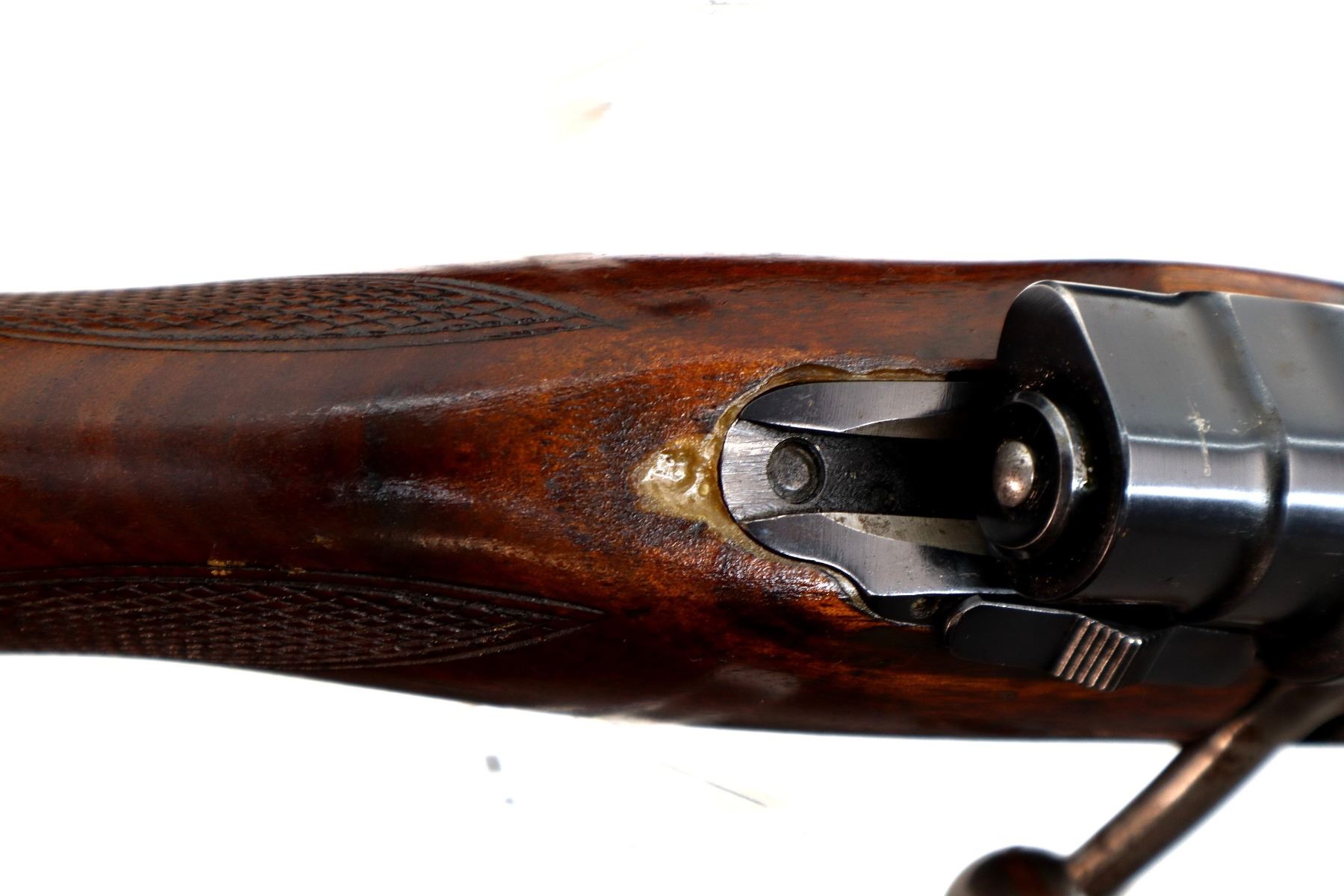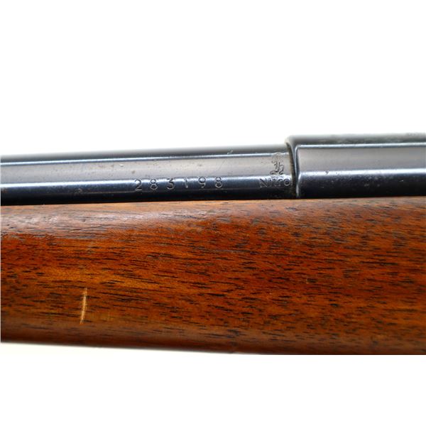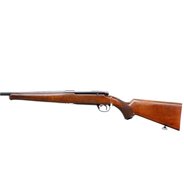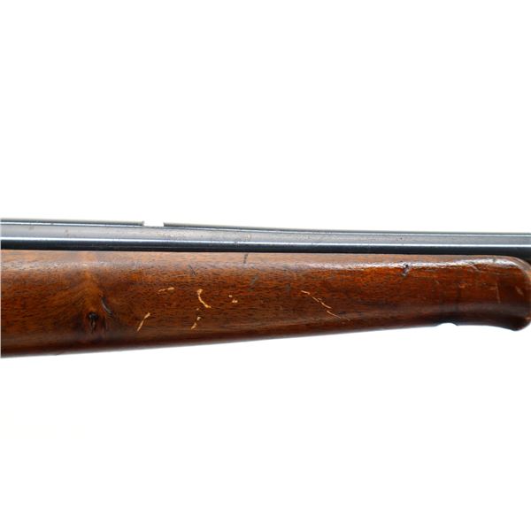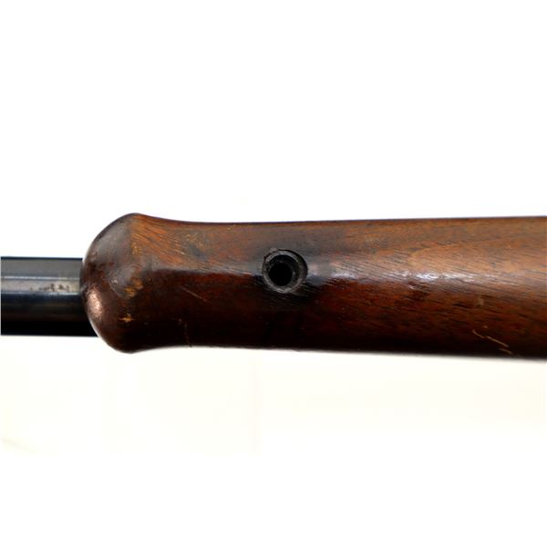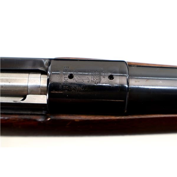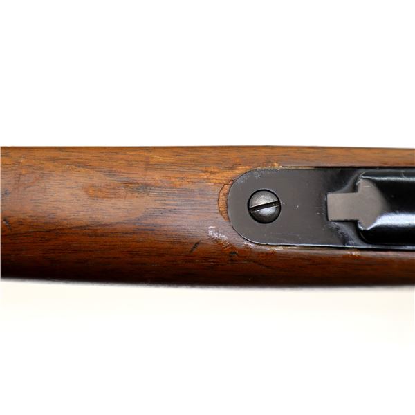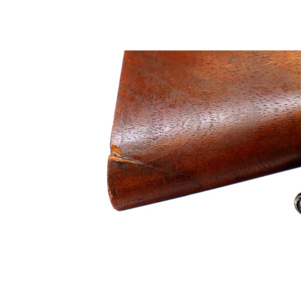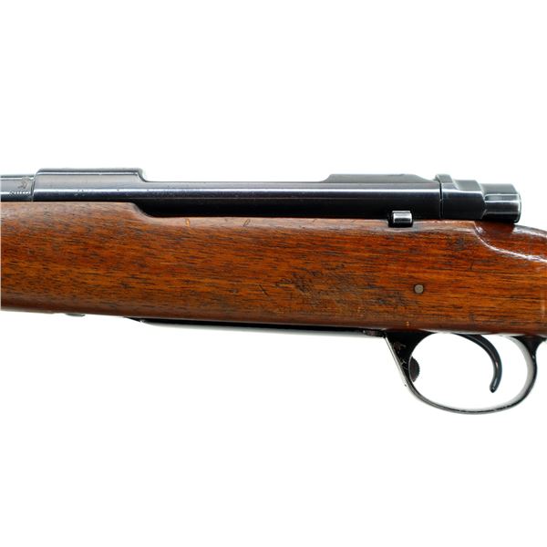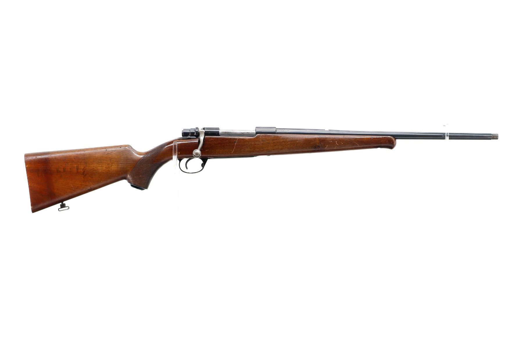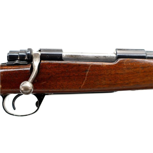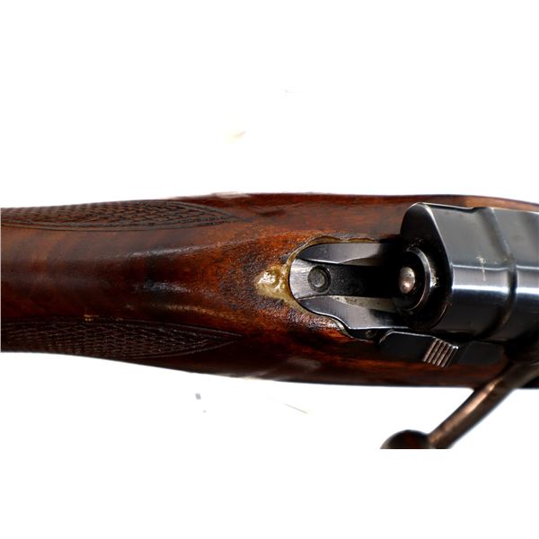 Main Description: Missing front and rear sights, rear dovetail present, blued finish, threaded muzzle with no cap, receiver drilled and tapped with no plug screws installed, silver bolt with swept back low scope handle and smooth knob. One piece wood stock, Schnabel forend tip, checkered pistol grip, missing butt plate and screws, 13.5" LOP, grip cap, hinged floor plate, has a rear swivel missing the front hole is present.