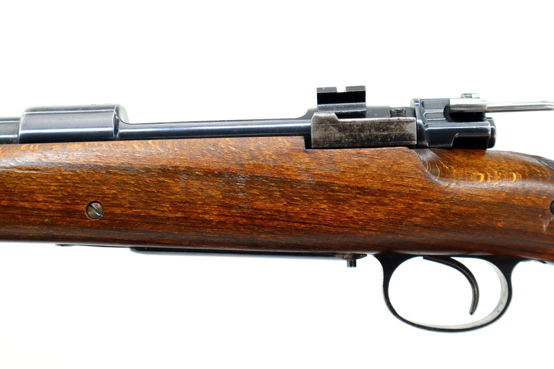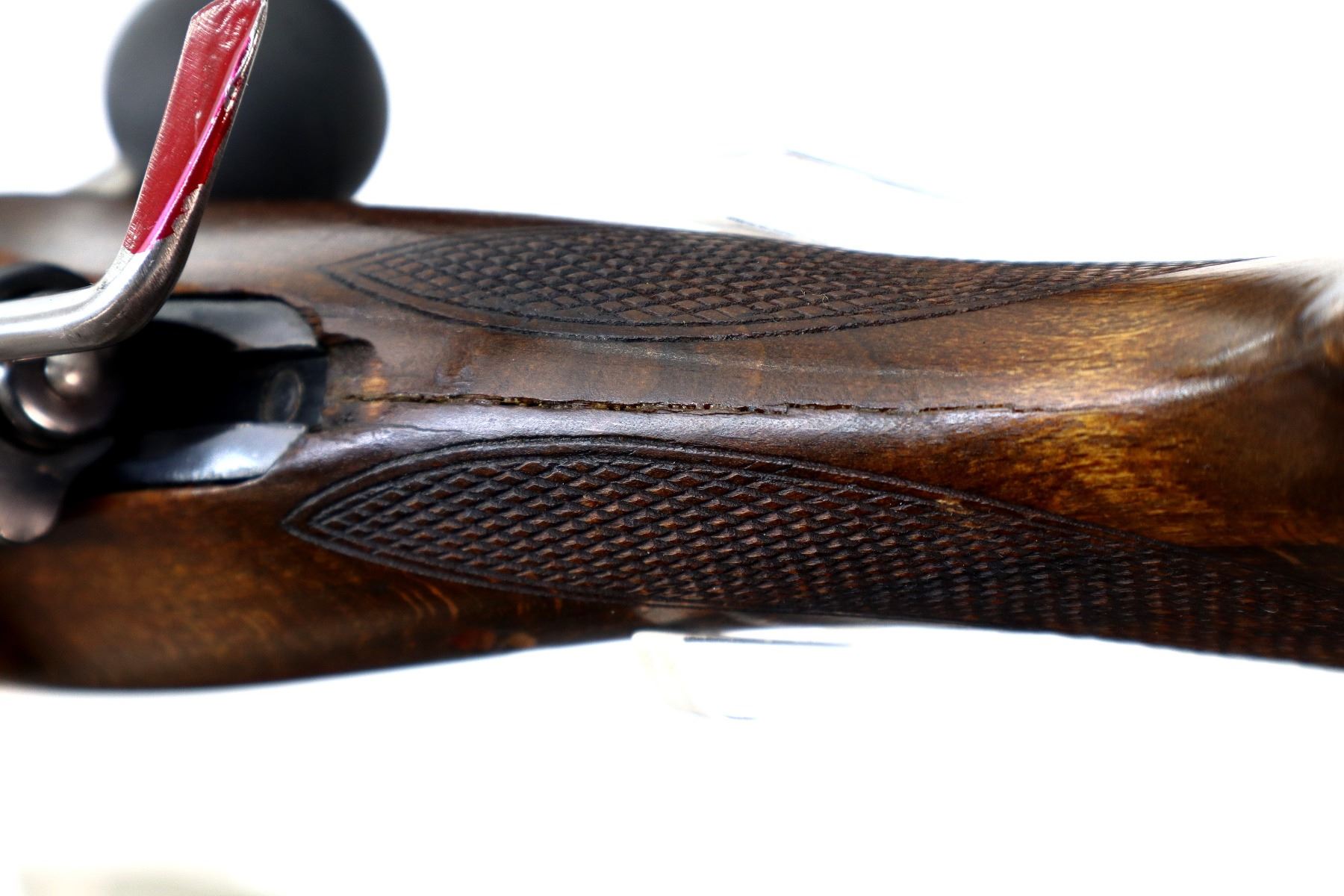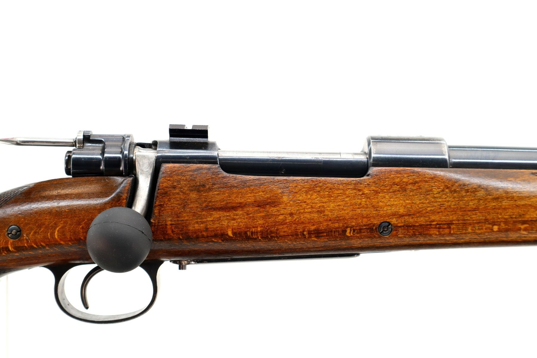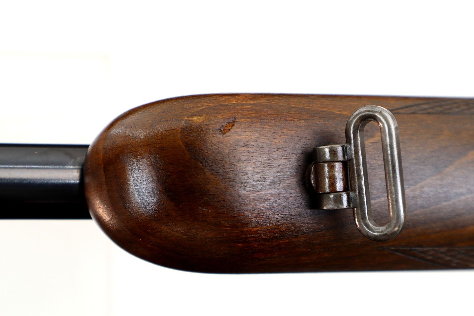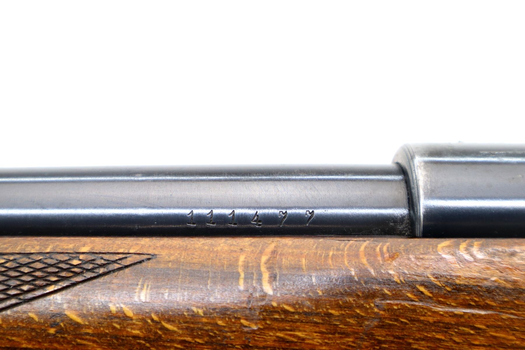 Main Description: Blade front sight with ramp, adjustable u notched rear sight, blued finish, receiver drilled and tapped with rear scope base only installed, large black rubber bolt knob, modified extended safety. One piece wood stock, checkered forearm and pistol grip, stock cracked behind receiver repaired with screws, brown rubber recoil pad, 14" LOP, grip cap, sling swivels.