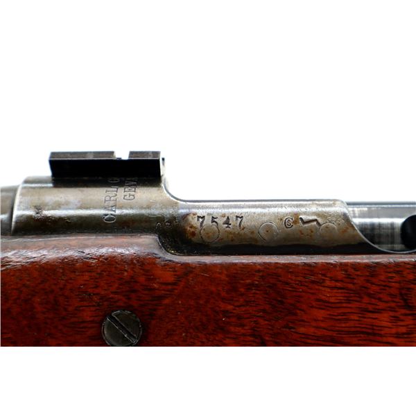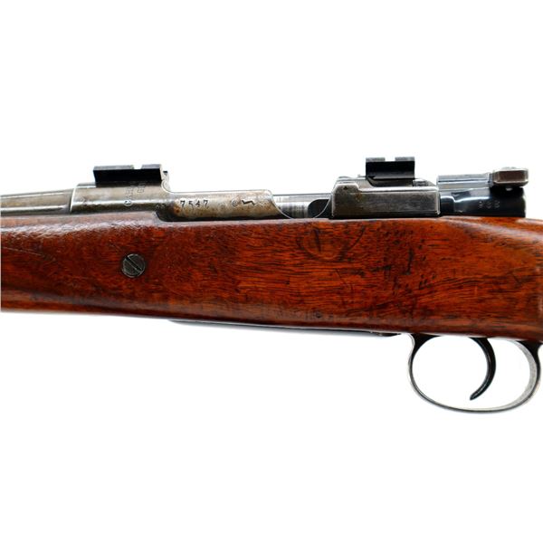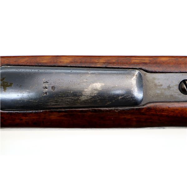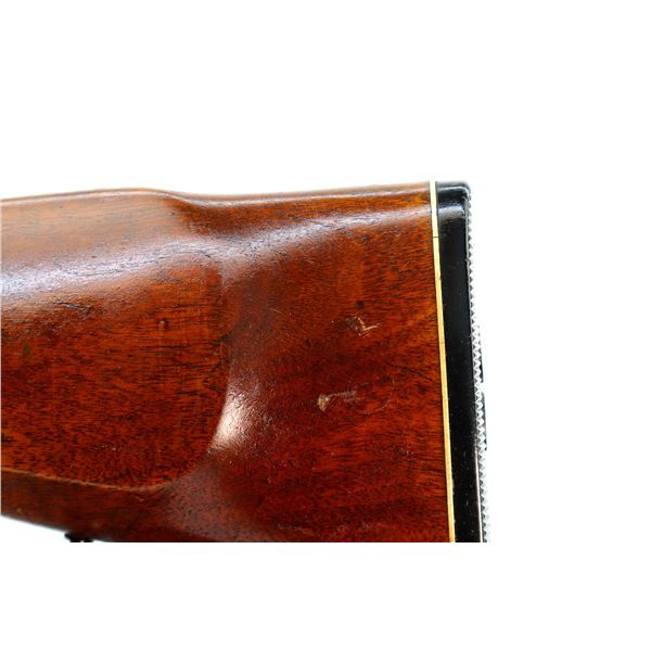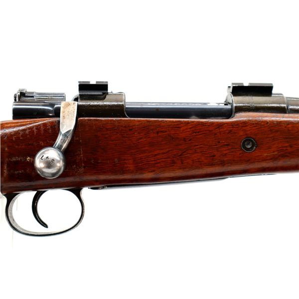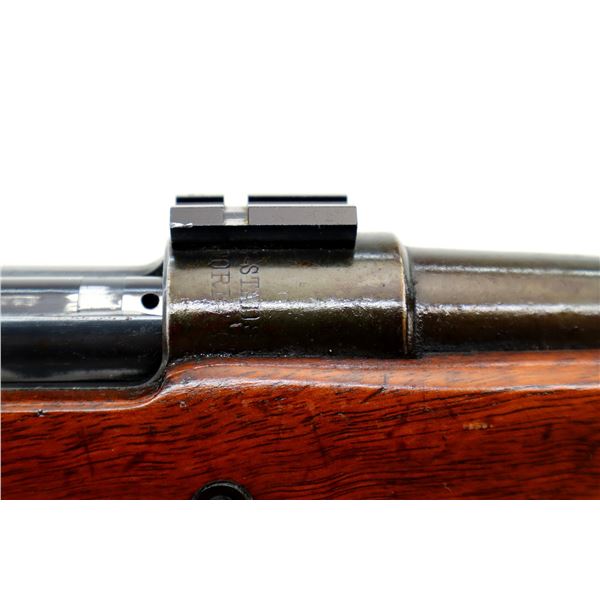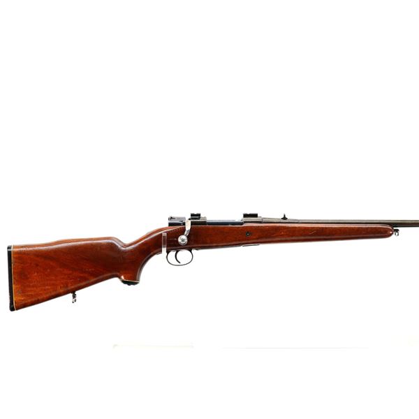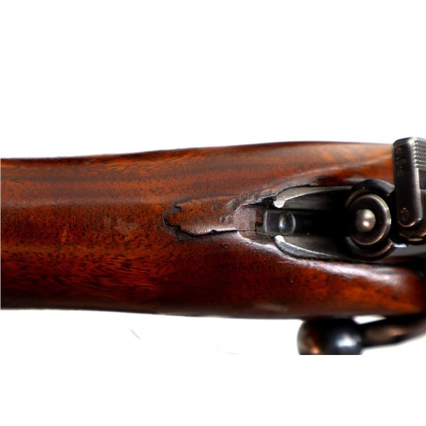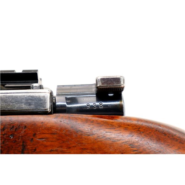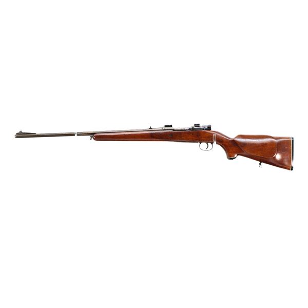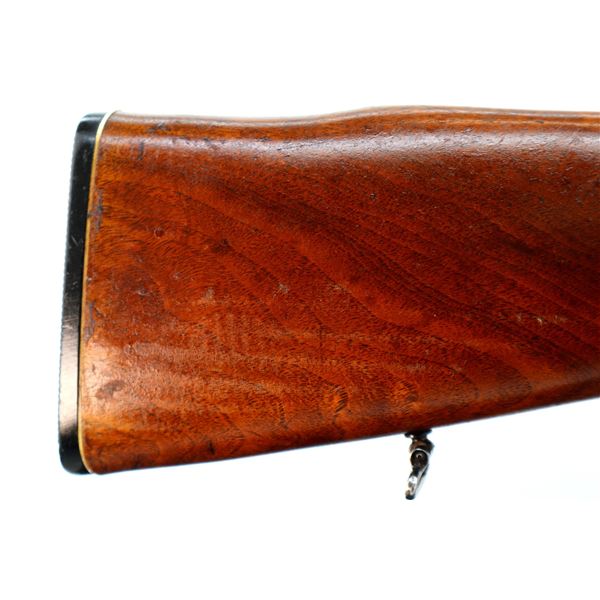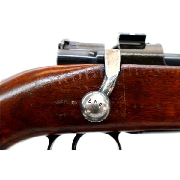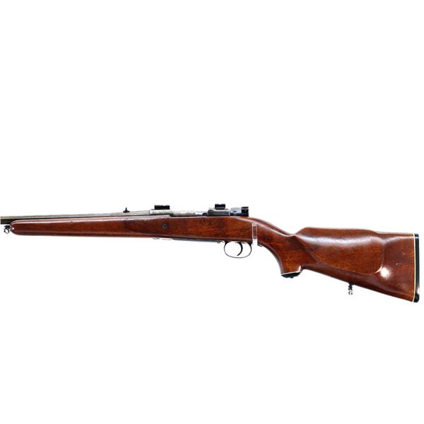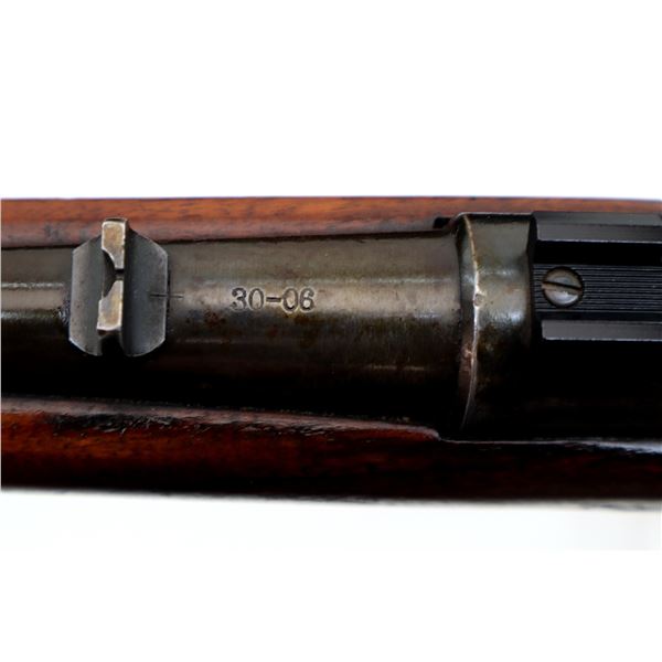 Main Description: Blade front sight with ramp, u notched rear sight, receiver drilled and tapped with two piece scope bases installed, modified bolt handle with flat bottomed knob. One piece wood stock, pistol grip cracked behind receiver, cheek rest, grooved black polymer butt plate, grip cap, sling swivels.
