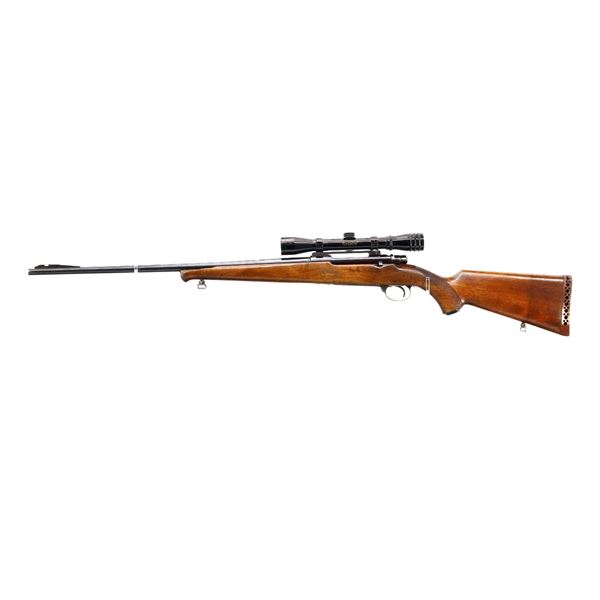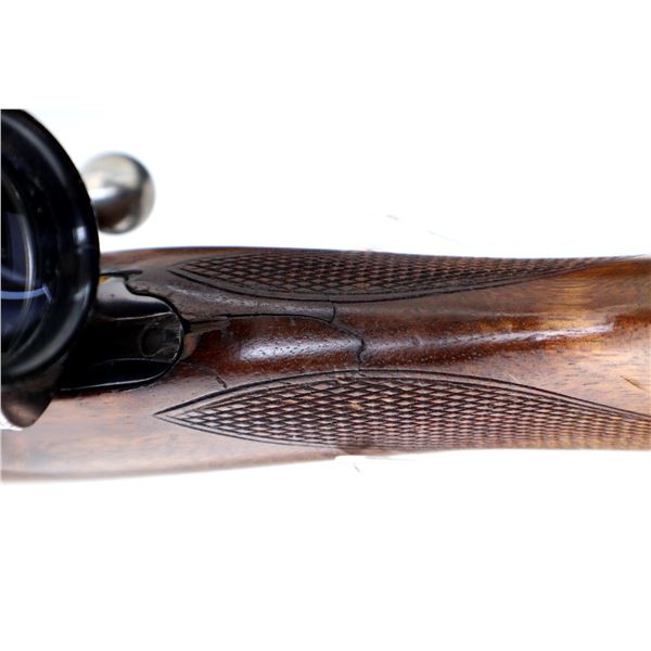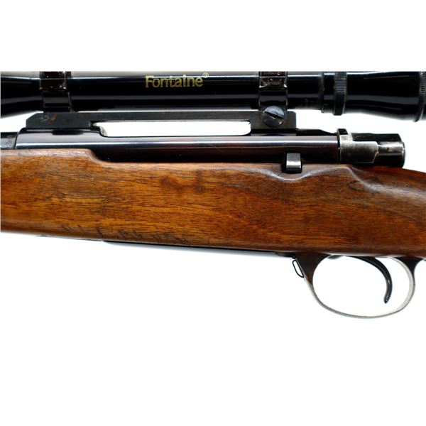 Main Description: Missing front sight ramp present, no rear sight dovetail present, blued finish, receiver drilled and tapped with Fontaine 4x32 scope installed, clear optics with duplex crosshair. Smooth bolt knob. One piece wood stock, Schnabel forend tip which is chipped, checkered pistol grip chipped and cracked behind receiver, brown vented rubber recoil pad which requires fitting, grip cap, hinged floor plate, sling swivels, extra hole in toe of stock.