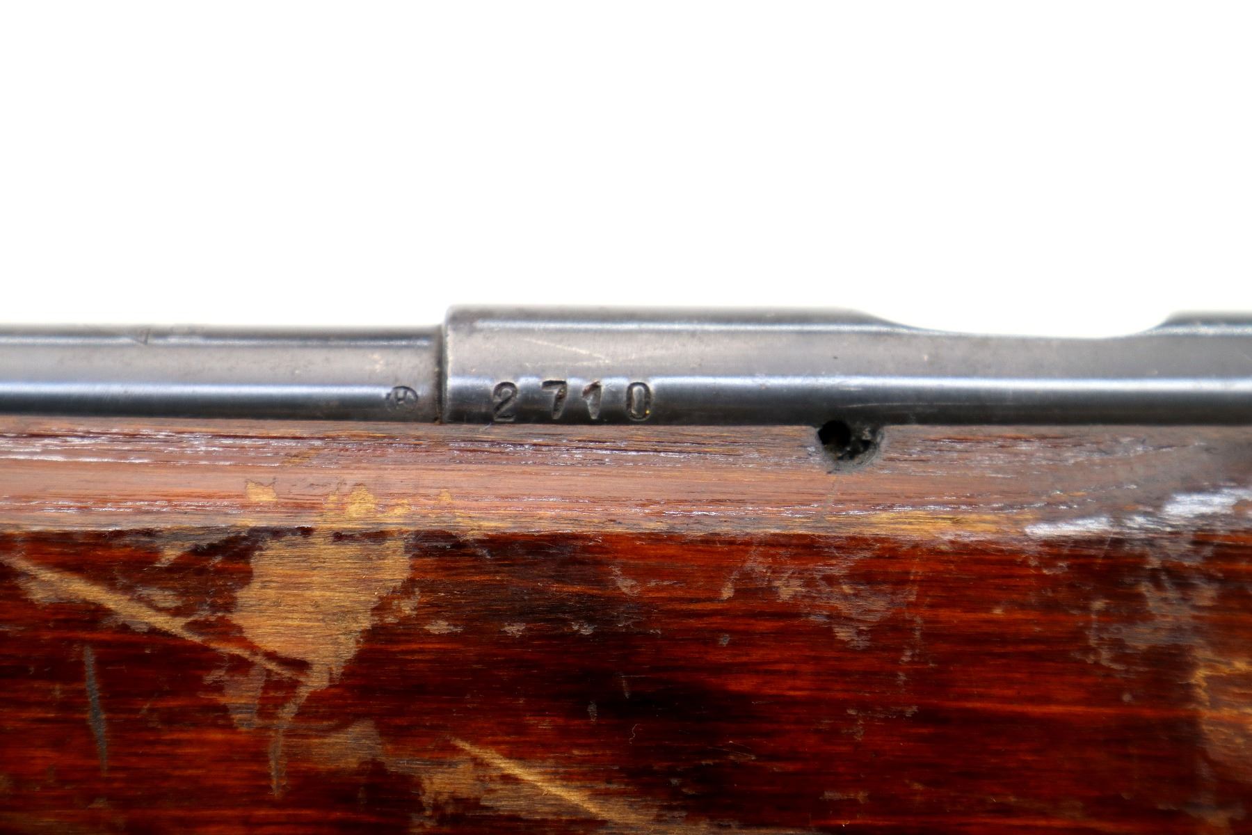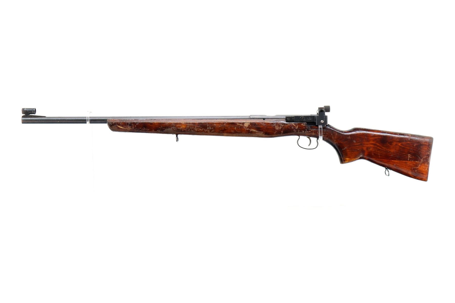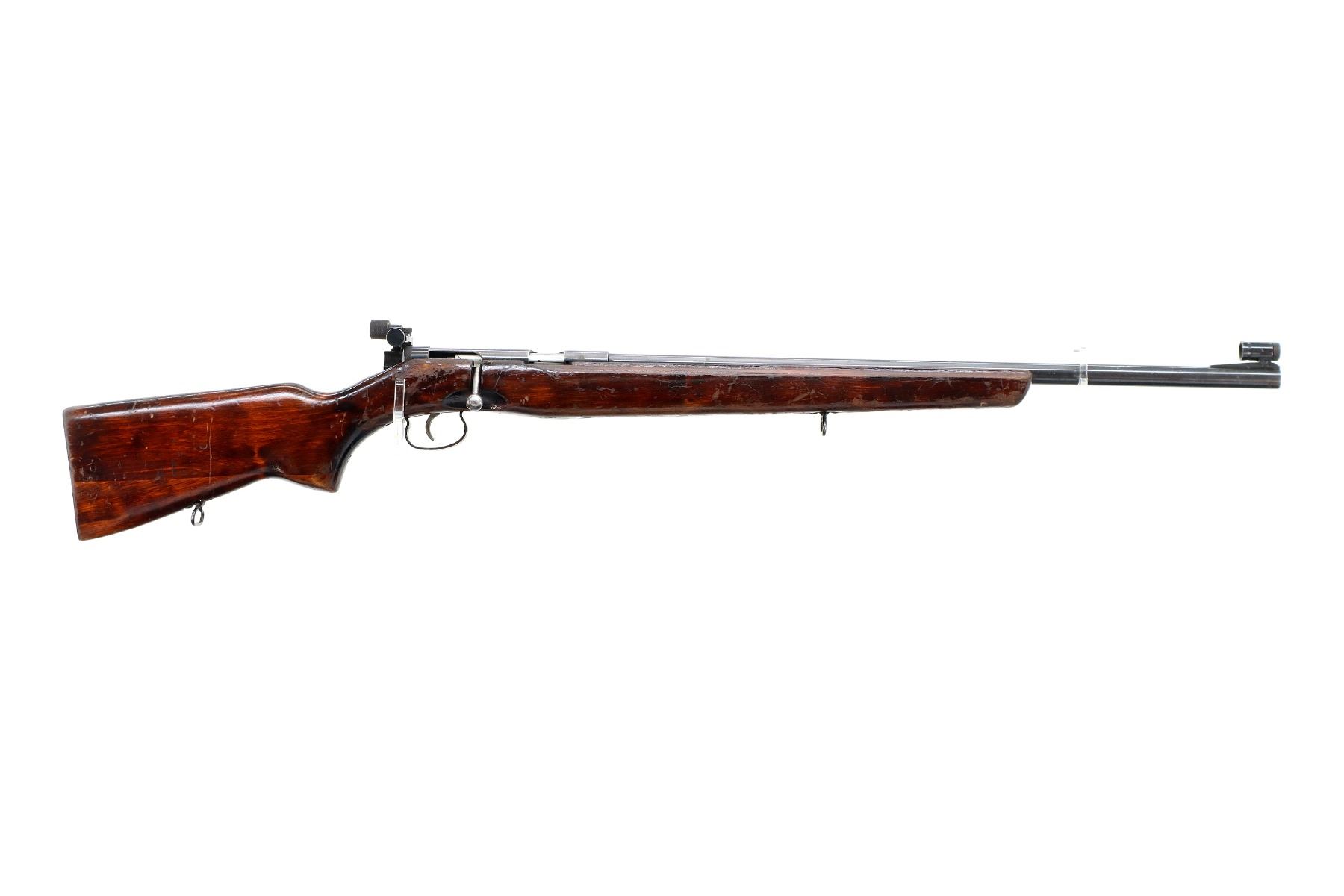 Main Description: Dated 1960, bolt matches. Globe front sight with post and ramp, adjustable rear peep sight with replaced screw, blued finish, heavy barrel, silver bolt with smooth knob. One piece target style wood stock, pistol grip, smooth steel butt plate, sling swivels.