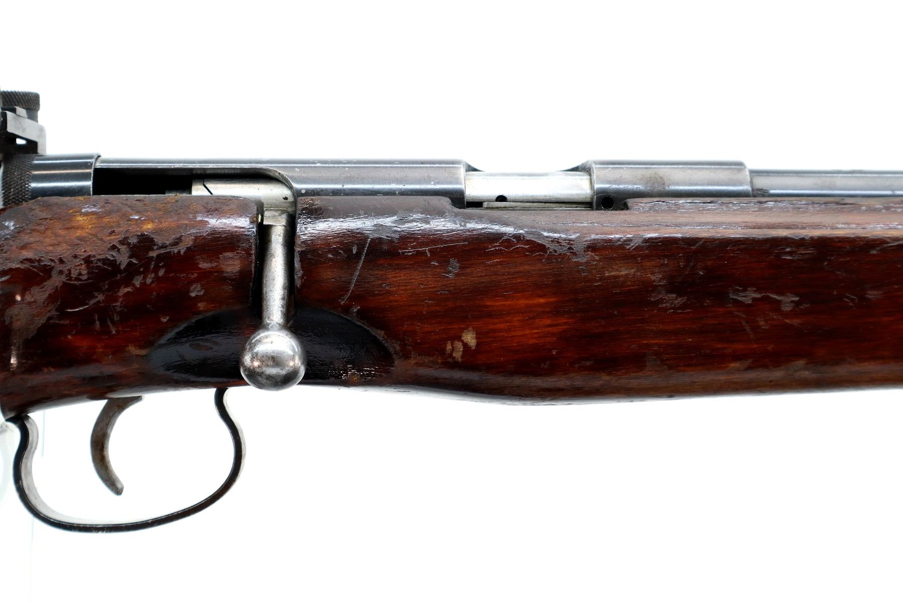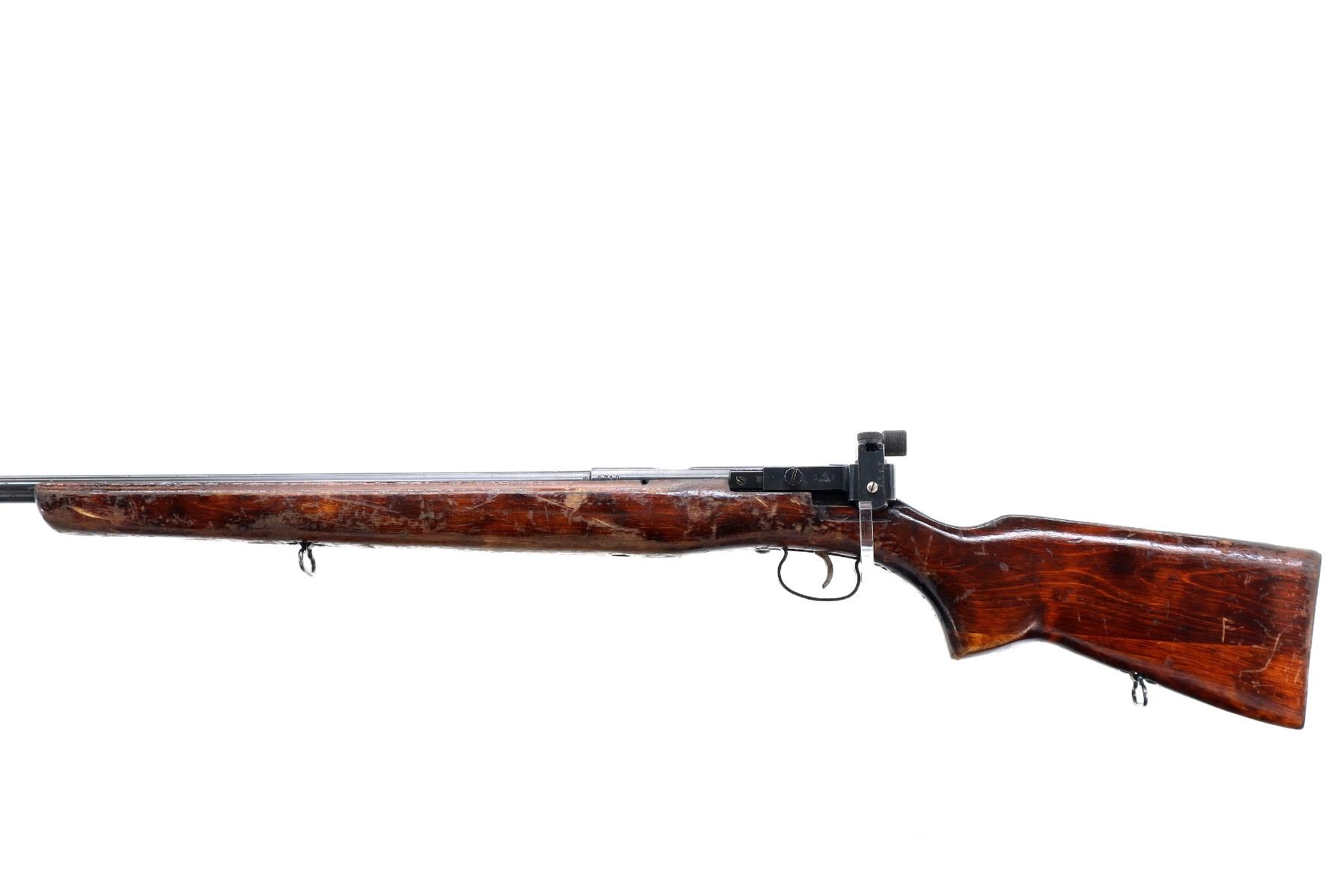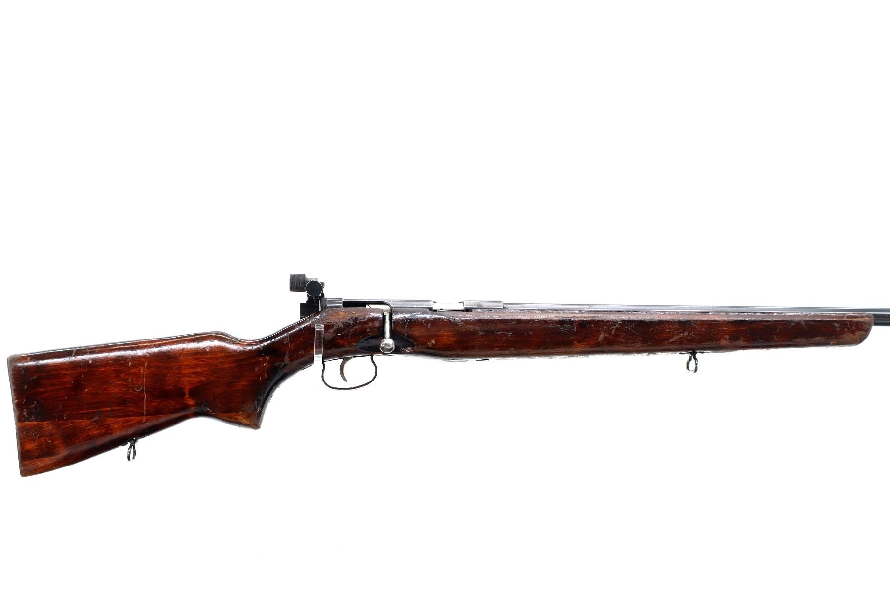 Main Description: Dated 1960, bolt matches. Globe front sight with post and ramp, adjustable rear peep sight with replaced screw, blued finish, heavy barrel, silver bolt with smooth knob. One piece target style wood stock, pistol grip, smooth steel butt plate, sling swivels.