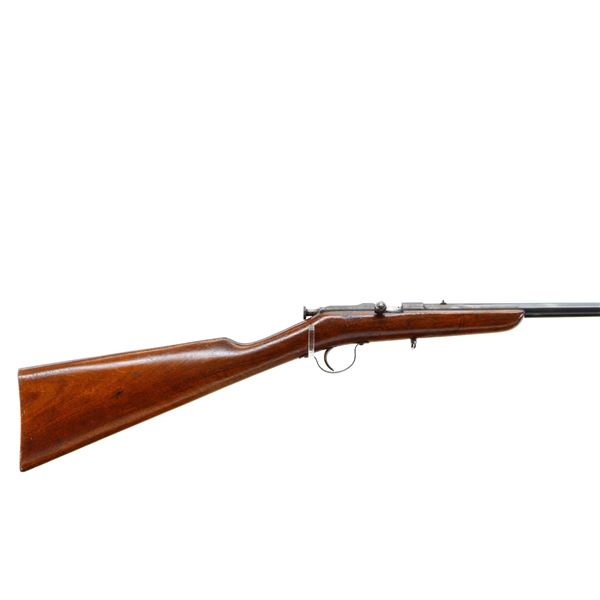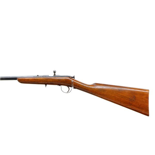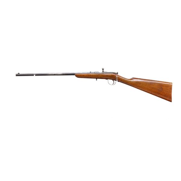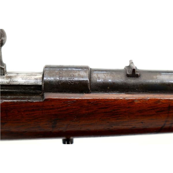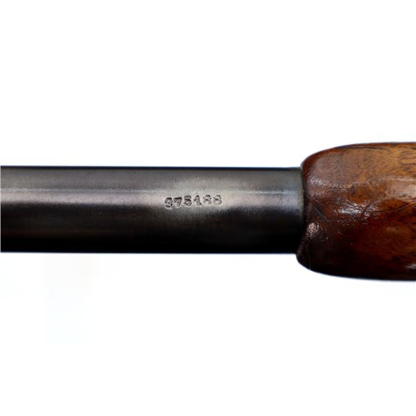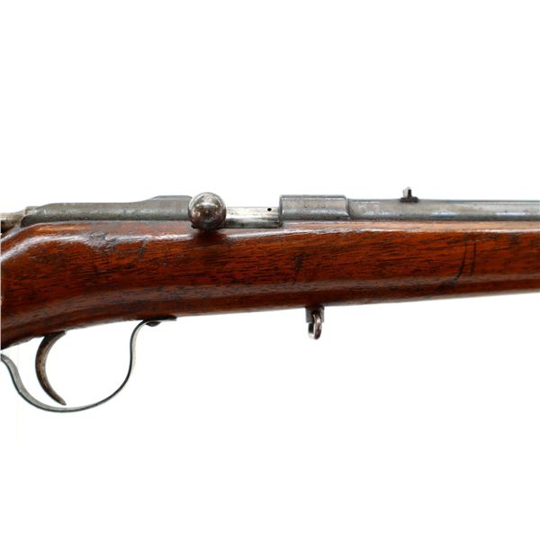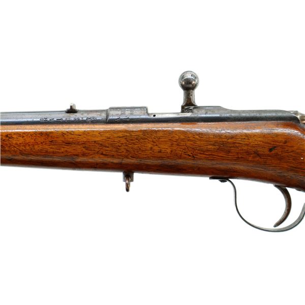 Main Description: Blade front sight, u notched rear sight, blued finish, small bolt knob, extractor is present. One piece wood stock, straight grip, smooth butt, has a takedown loop in front of trigger guard.