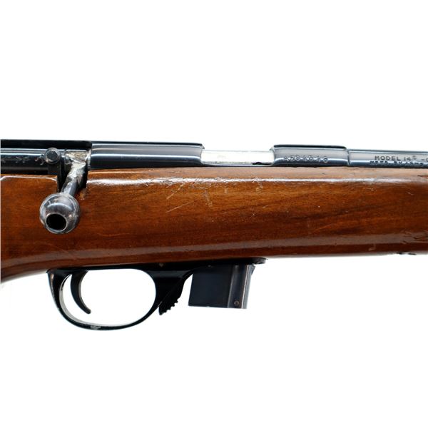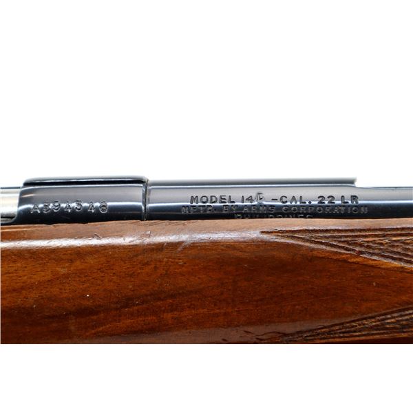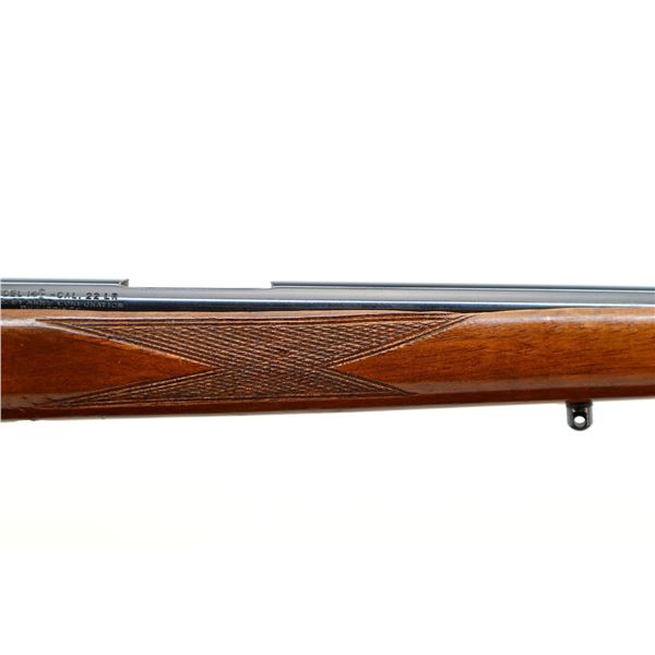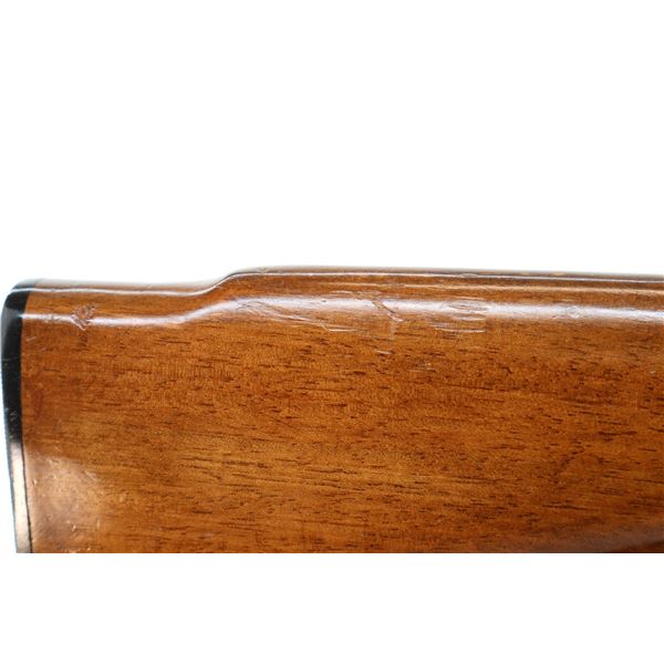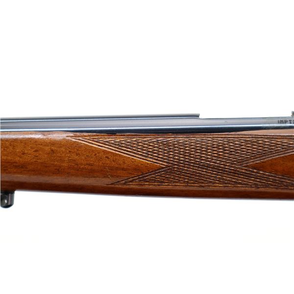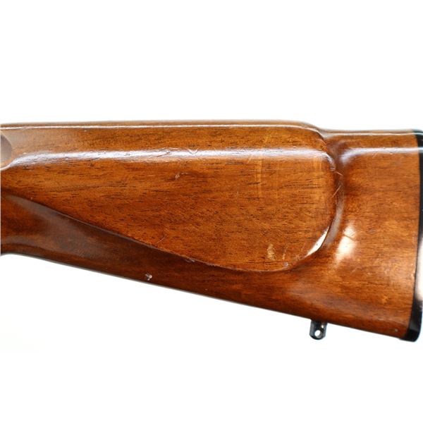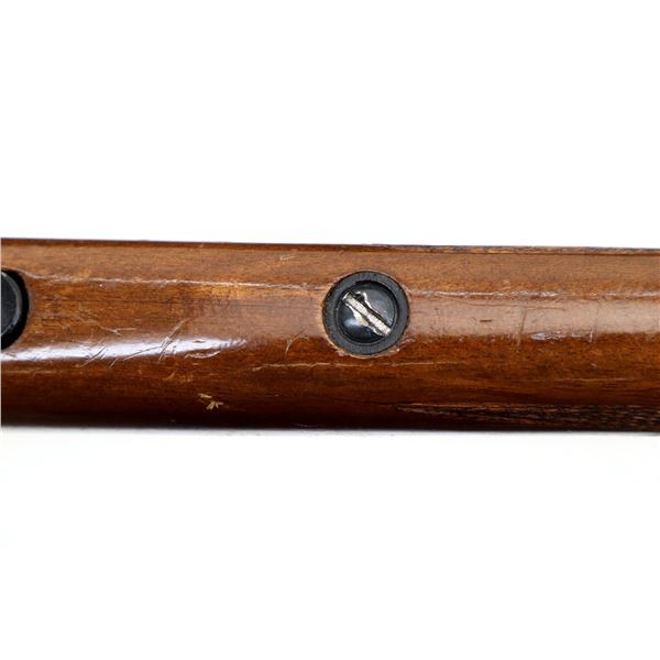 Main Description: Missing front and rear sights, threaded hole and rear dovetail present, blued finish, grooved receiver, bolt handle has been welded and repaired. One piece wood stock, barrel channel has been carved out, checkered forearm and pistol grip, cracked on left side beside receiver, cheek rest, grooved black polymer butt plate, grip cap, swivel studs.