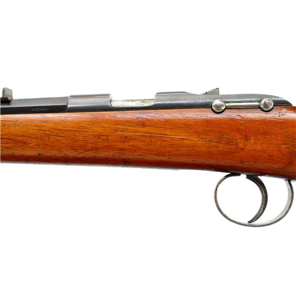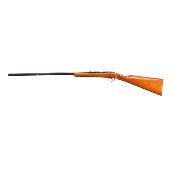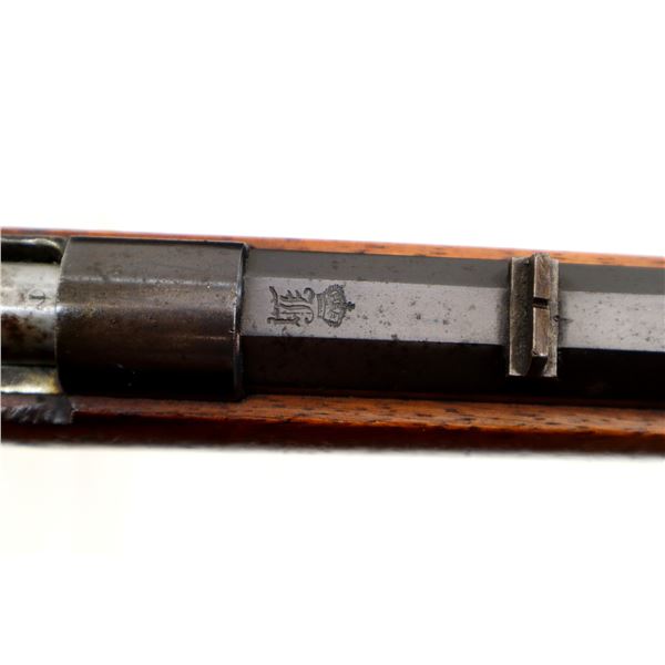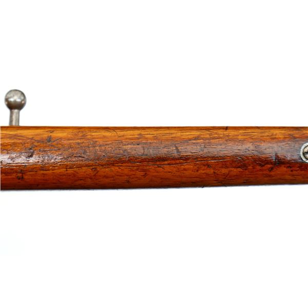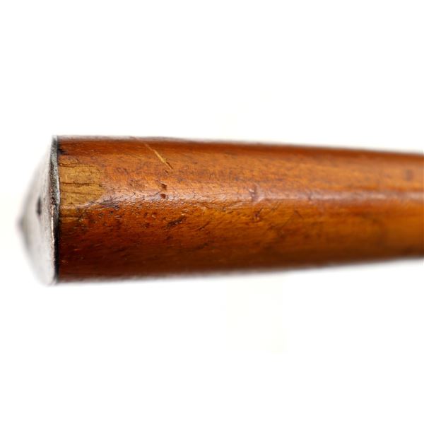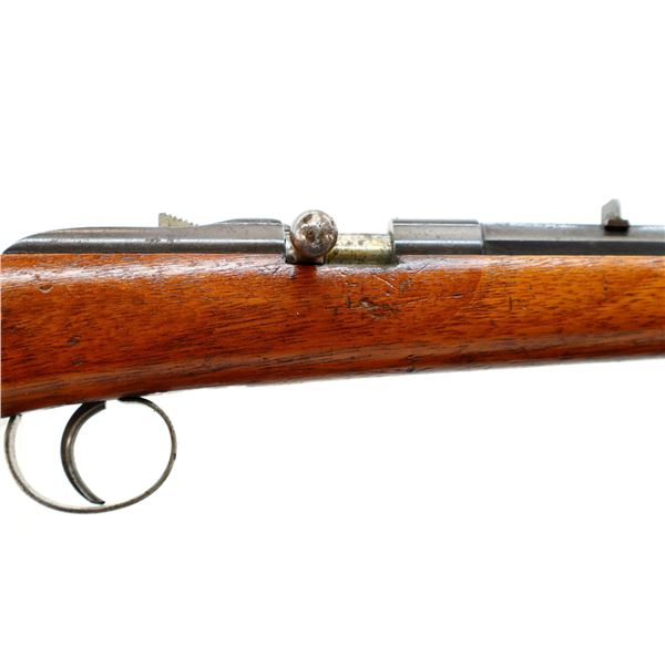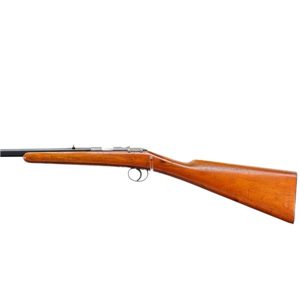 Main Description: Blade front sight, u notched rear sight, blued finish, octagon barrel, straight bolt handle, extractor is present. One piece wood stock, straight grip, smooth steel butt plate, stock chipped at toe.