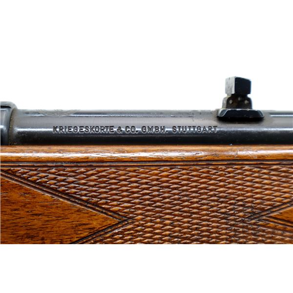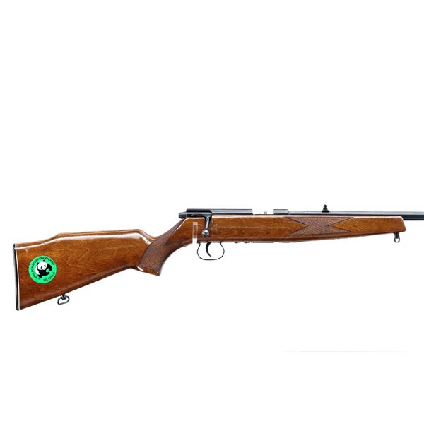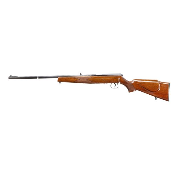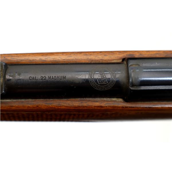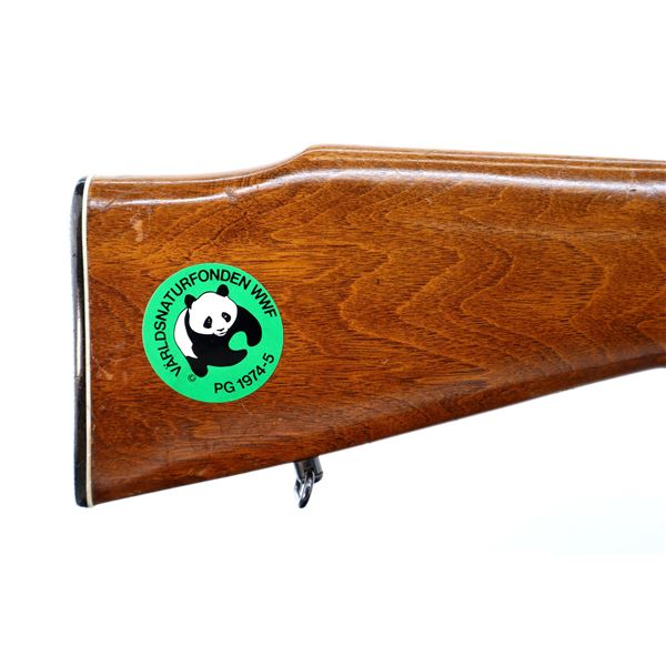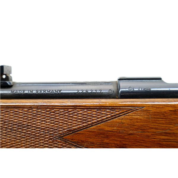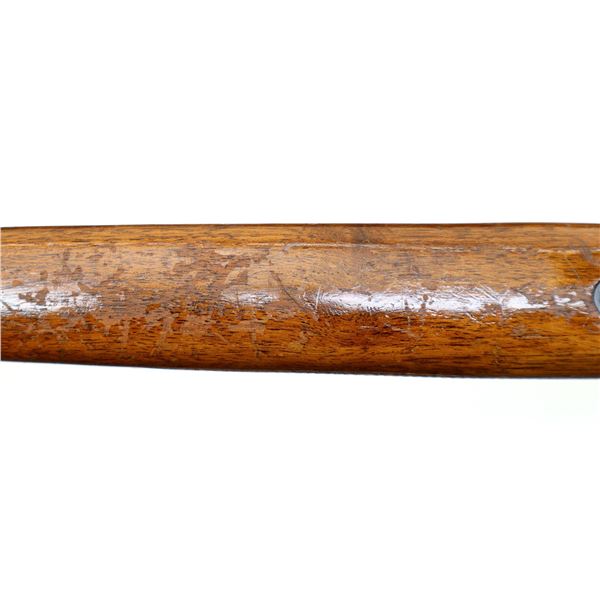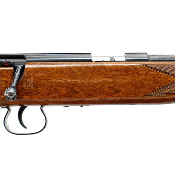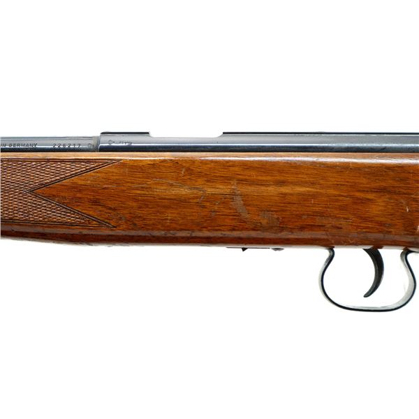 Main Description: Blade front sight with ramp, u notched rear sight missing two folding leafs, blued finish, grooved receiver, smooth bolt knob. One piece wood stock, checkered forearm and pistol grip, cheek rest, checkered black polymer butt plate, sticker on right side of stock, sling swivels.