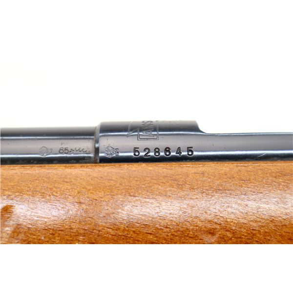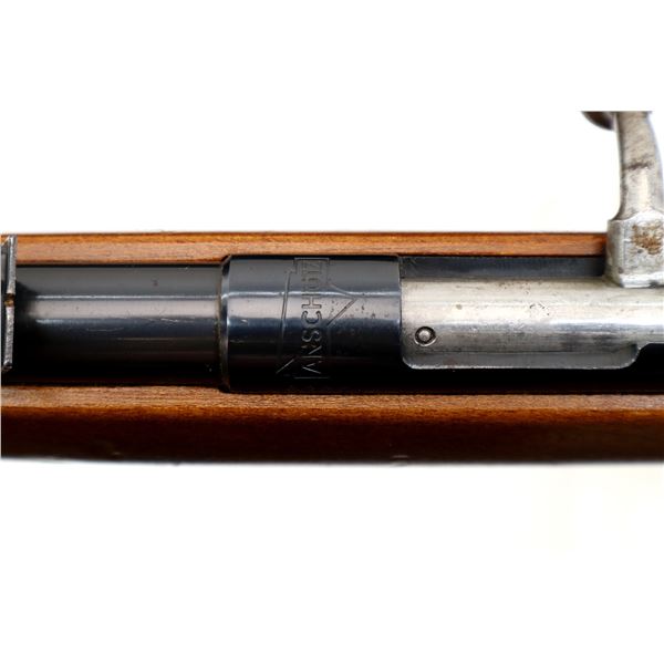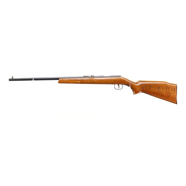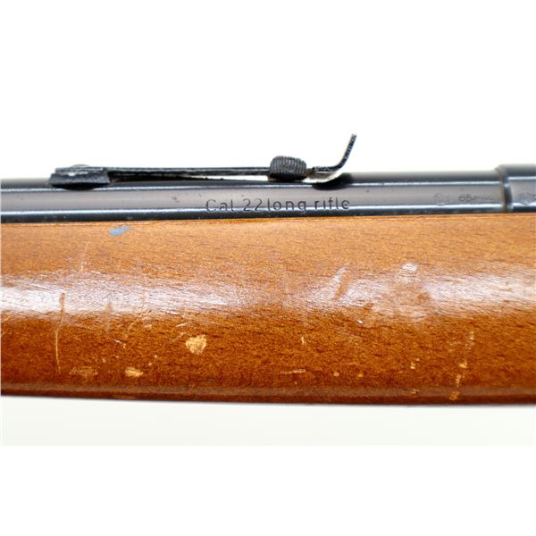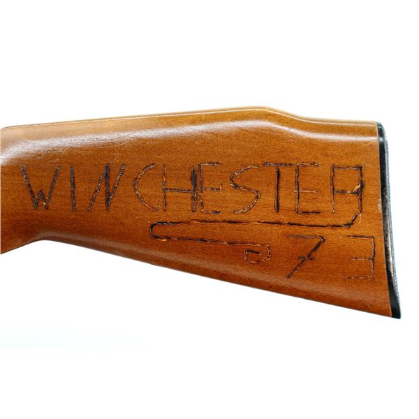 Main Description: Blade front sight with hood, adjustable u notched rear sight, blued finish, extractor is present. One piece wood stock, pistol grip, checkered black polymer butt plate, left side of stock carved with Winchester 73