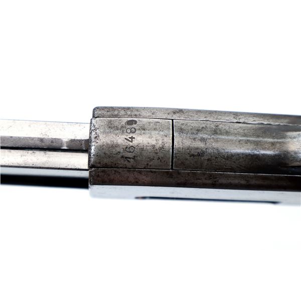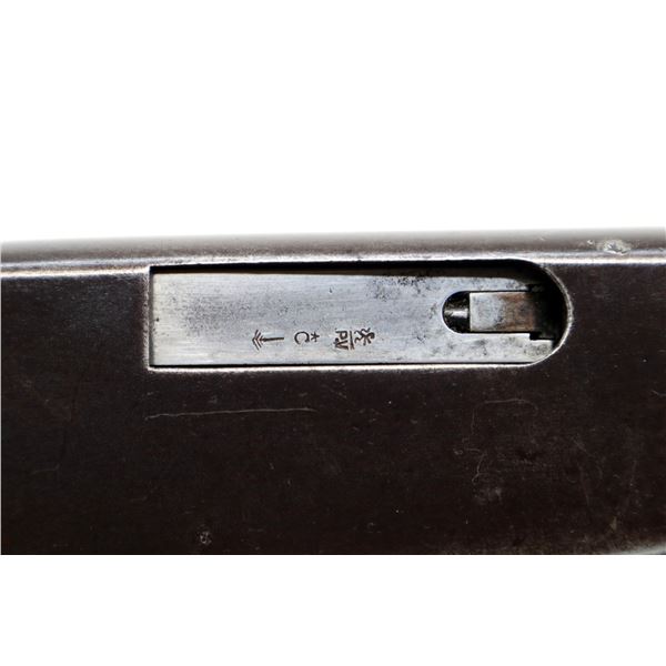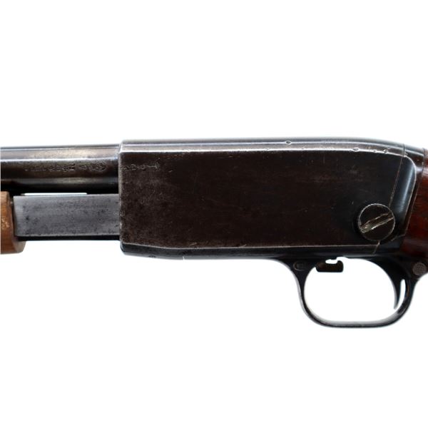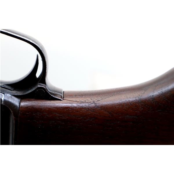 Main Description: Blade front sight, adjustable u notched rear sight, round barrel. Two piece wood stocks, custom grooved forearm with replaced screws, pistol grip cracked behind trigger guard, grooved black polymer butt plate