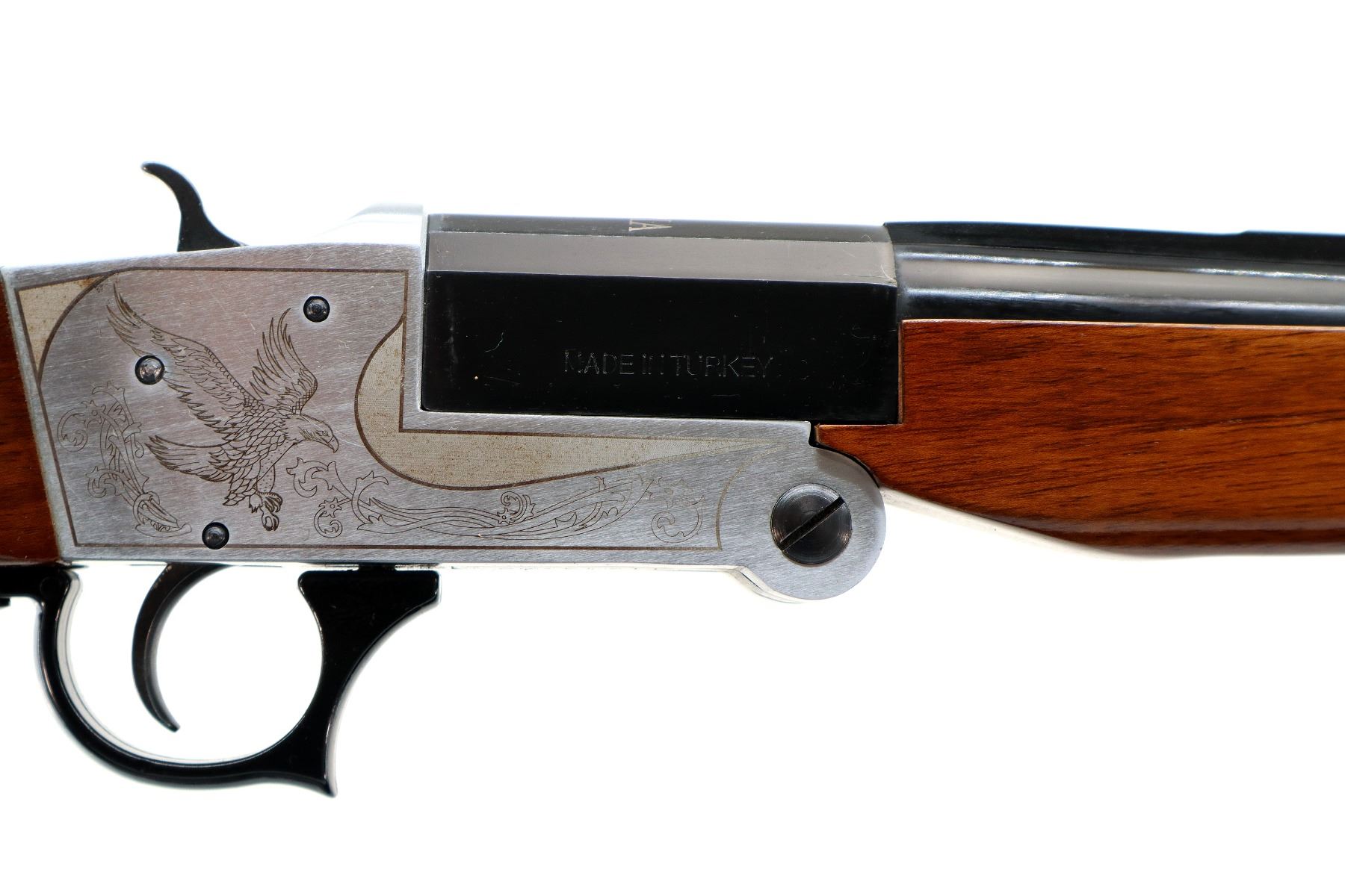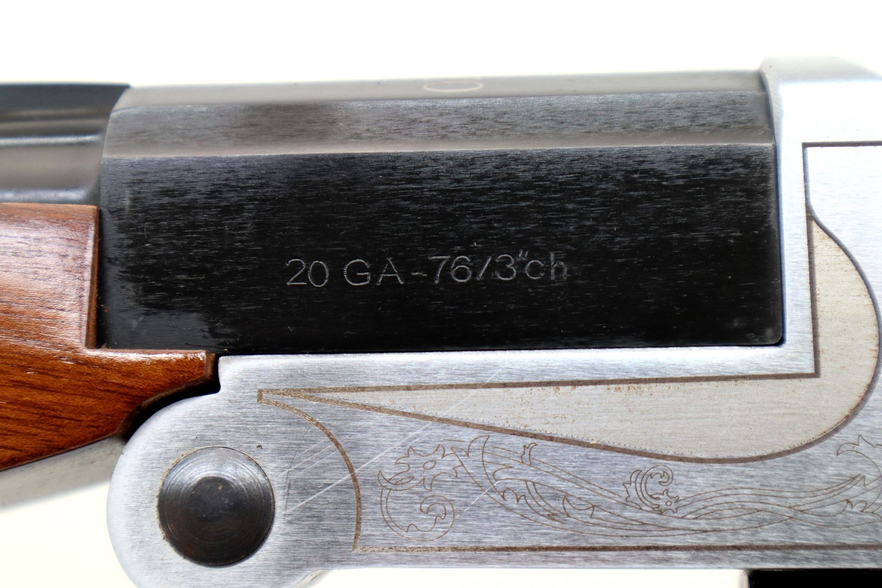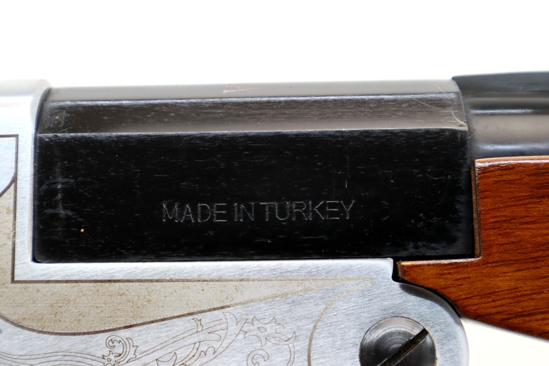 Main Description: Brass bead, blued vent rib barrel, engraved silver receiver, grooved spur hammer, extractor, trigger guard opens action. Two piece wood stocks, checkered pistol grip, textured black polymer butt plate, sling swivels.
