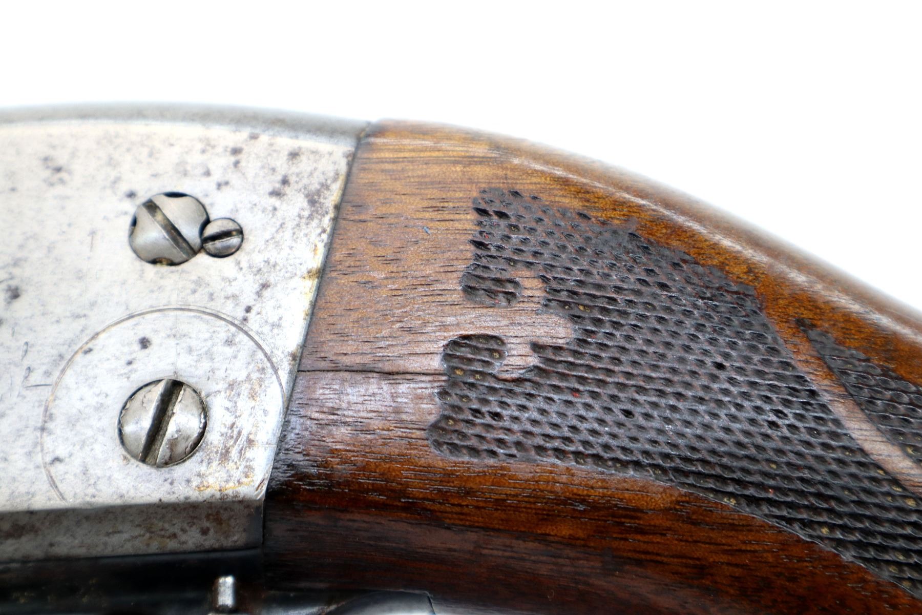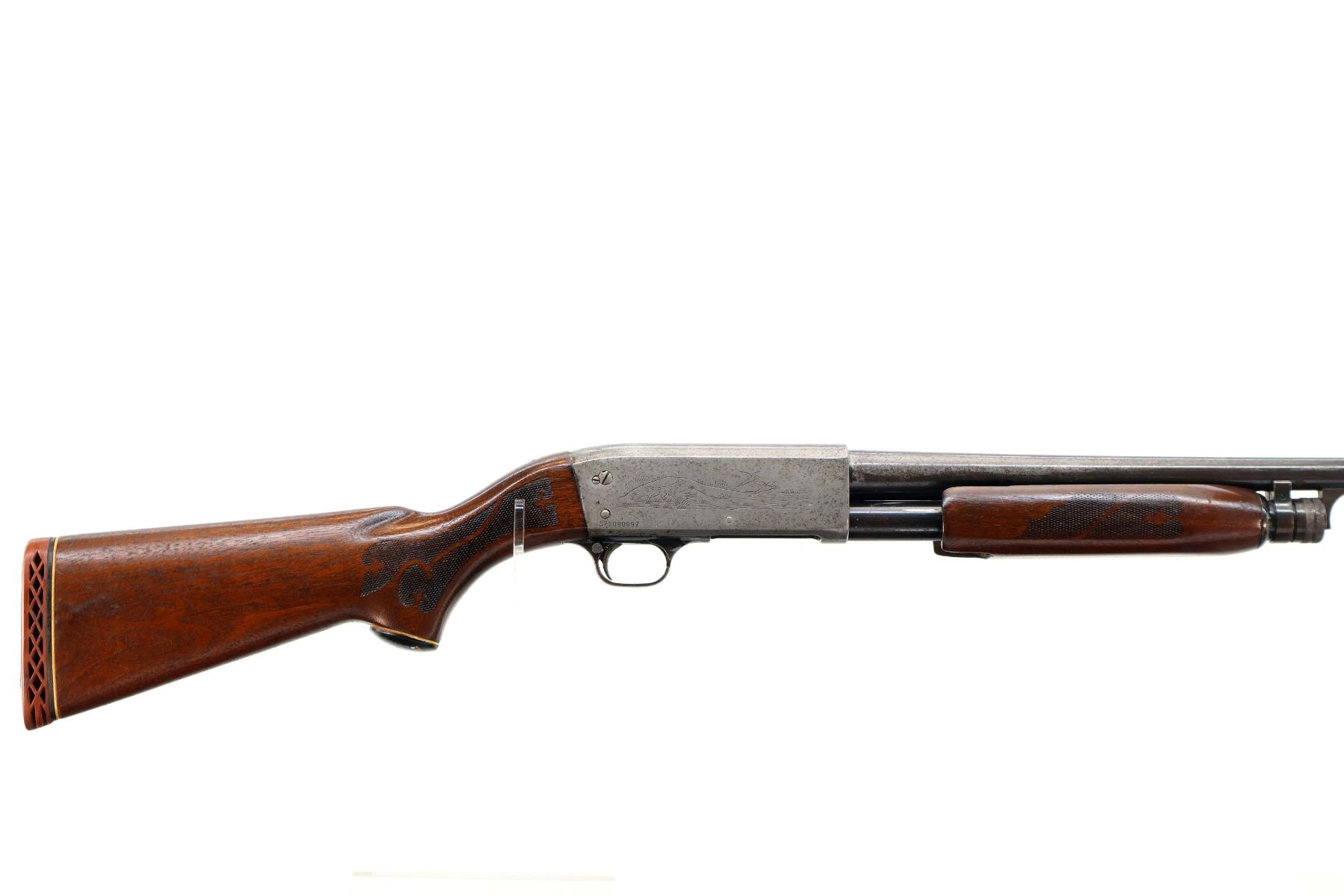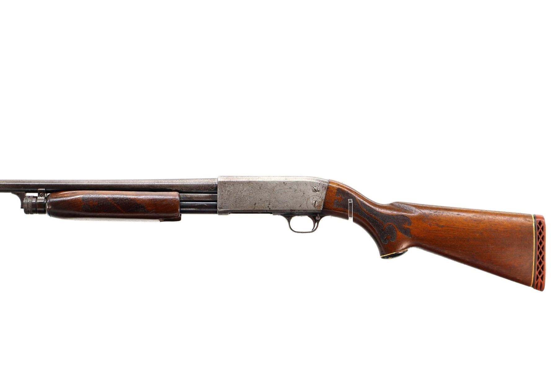 Main Description: Broken bead, round barrel, engraved receiver. Two piece wood stocks, checkered forearm and pistol grip cracked behind receiver, red vented rubber recoil pad, 14.25" LOP, grip cap.