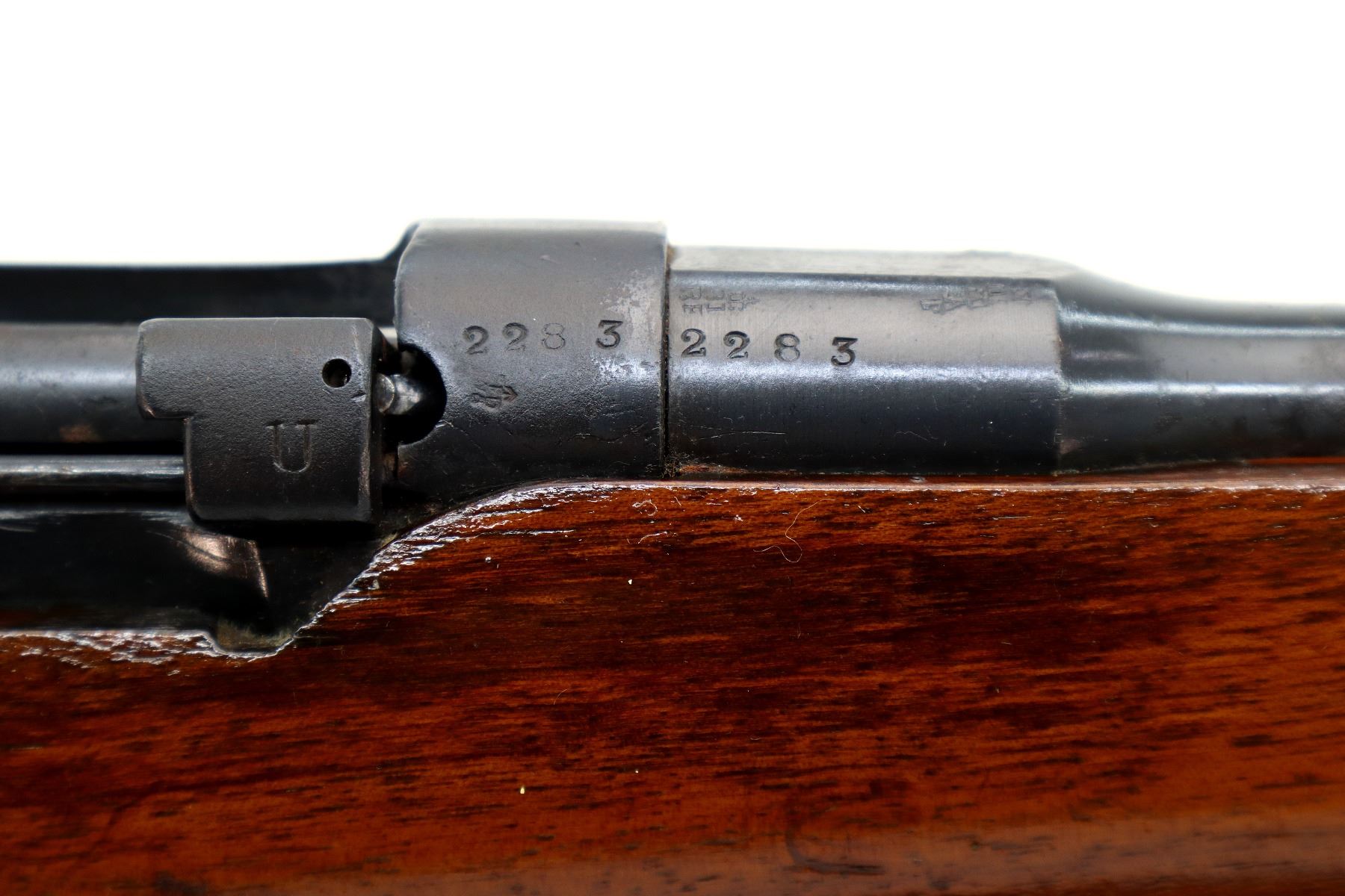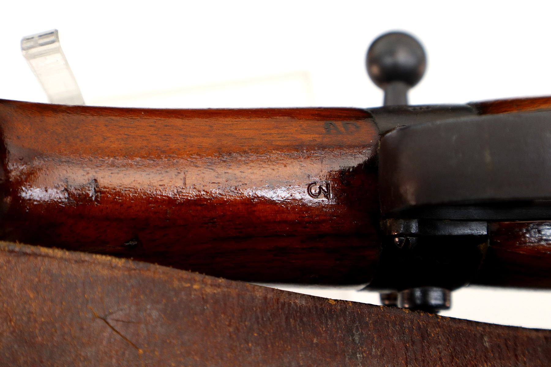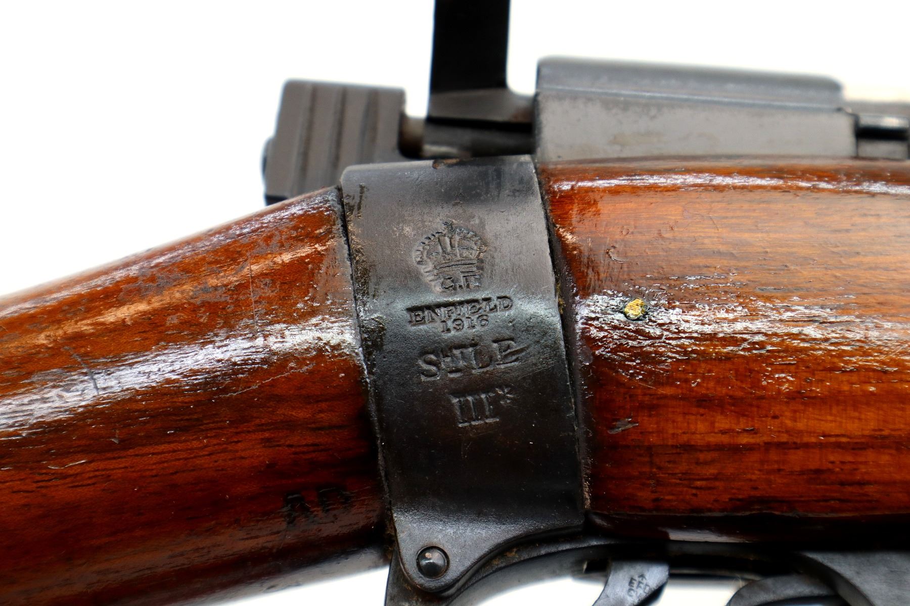 Main Description: Manufactured by Enfield 1916, bolt matches. Blade front sight with ramp, adjustable u notched rear sight, blued finish. Two piece sporterized wood stocks, pistol grip, smooth brass butt plate with trap, sling swivels with P1907 brown Military sling