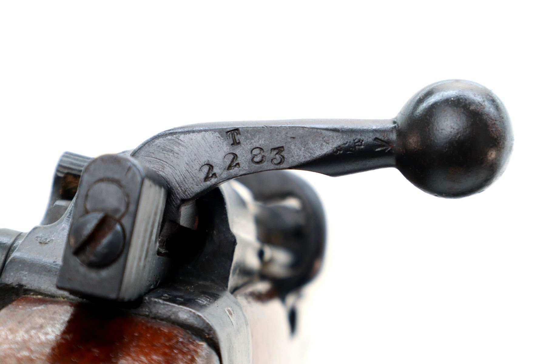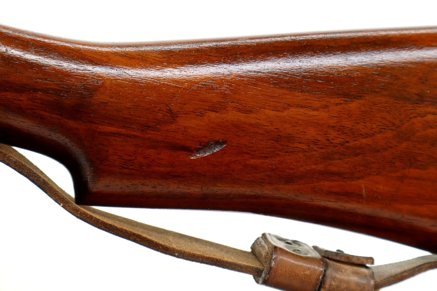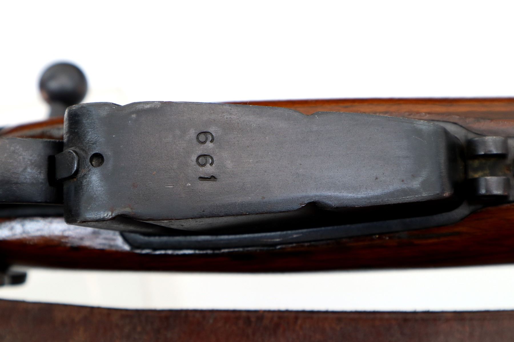 Main Description: Manufactured by Enfield 1916, bolt matches. Blade front sight with ramp, adjustable u notched rear sight, blued finish. Two piece sporterized wood stocks, pistol grip, smooth brass butt plate with trap, sling swivels with P1907 brown Military sling