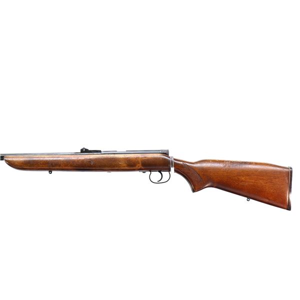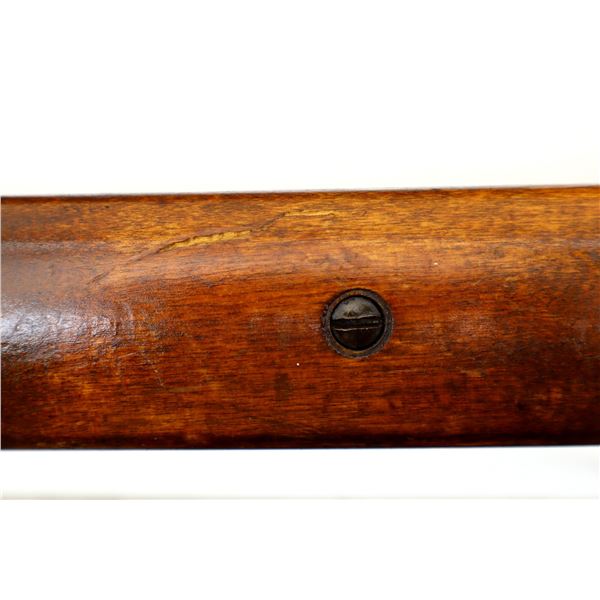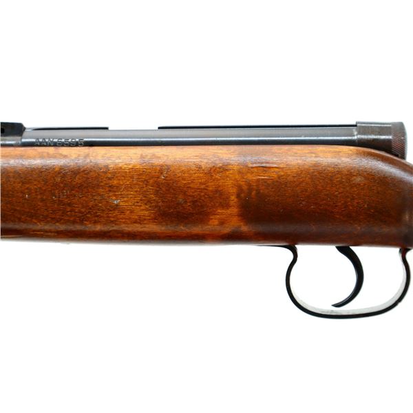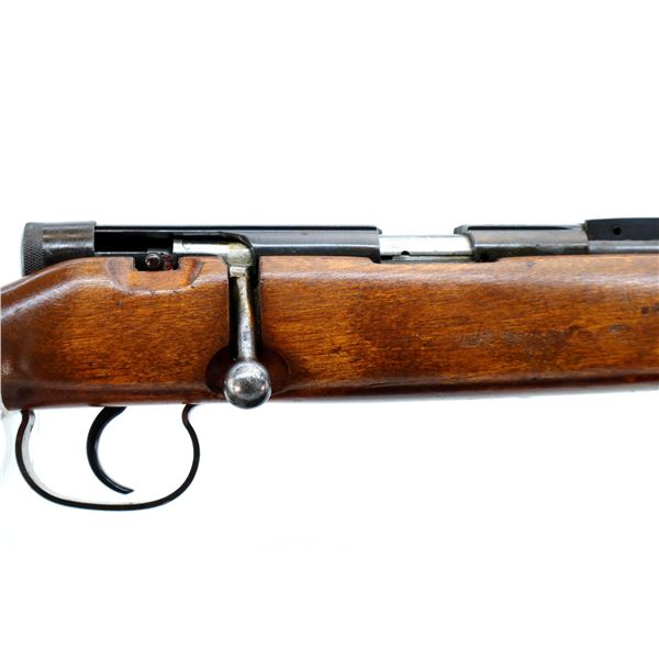 Main Description: Post front sight with hood and ramp, missing rear sight base is present, blued finish, heavy barrel, grooved receiver, smooth bolt knob. One piece wood stock, checkered pistol grip, grooved brown polymer butt plate, swivel studs.