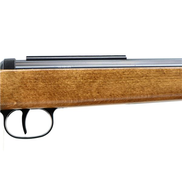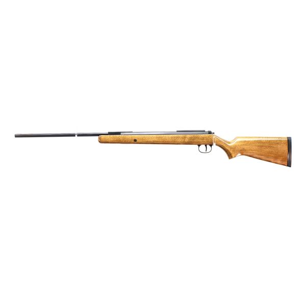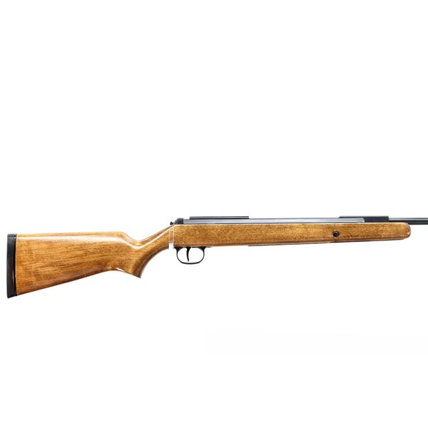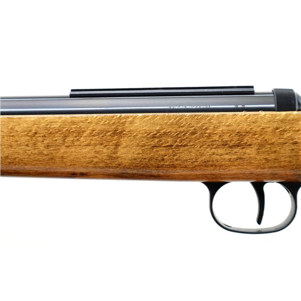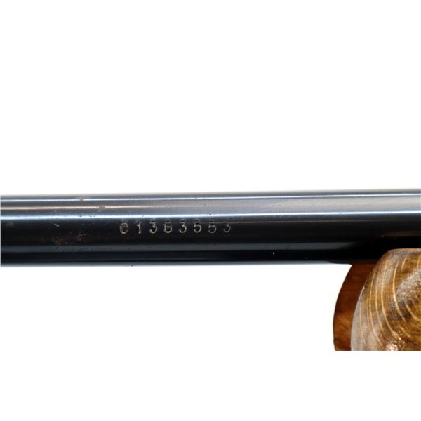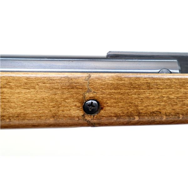Main Description: Missing front and rear sights, threaded holes present, blued finish, receiver drilled and tapped with one piece scope base installed. One piece wood stock, forearm is cracked and repaired, pistol grip, grooved black polymer butt plate.