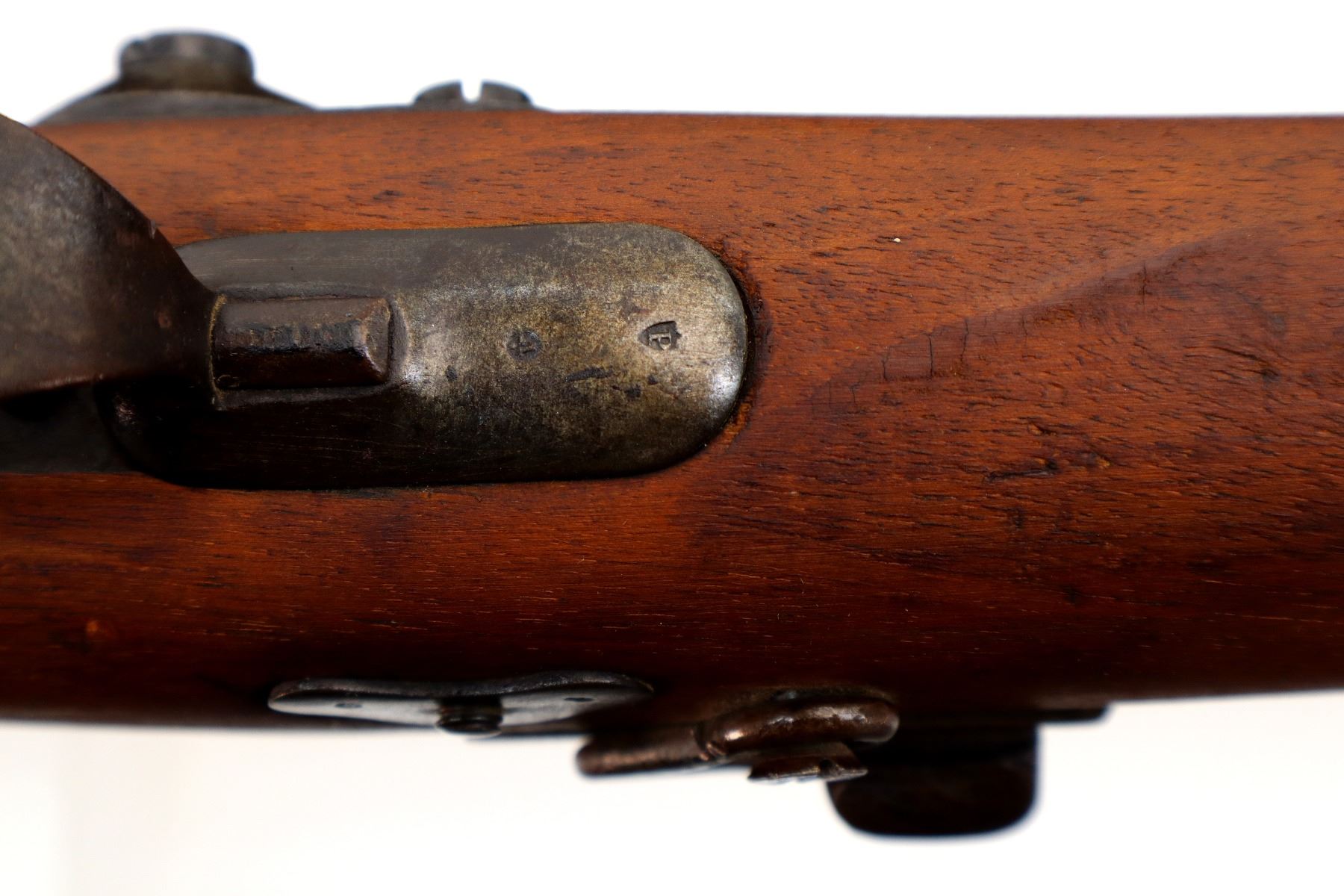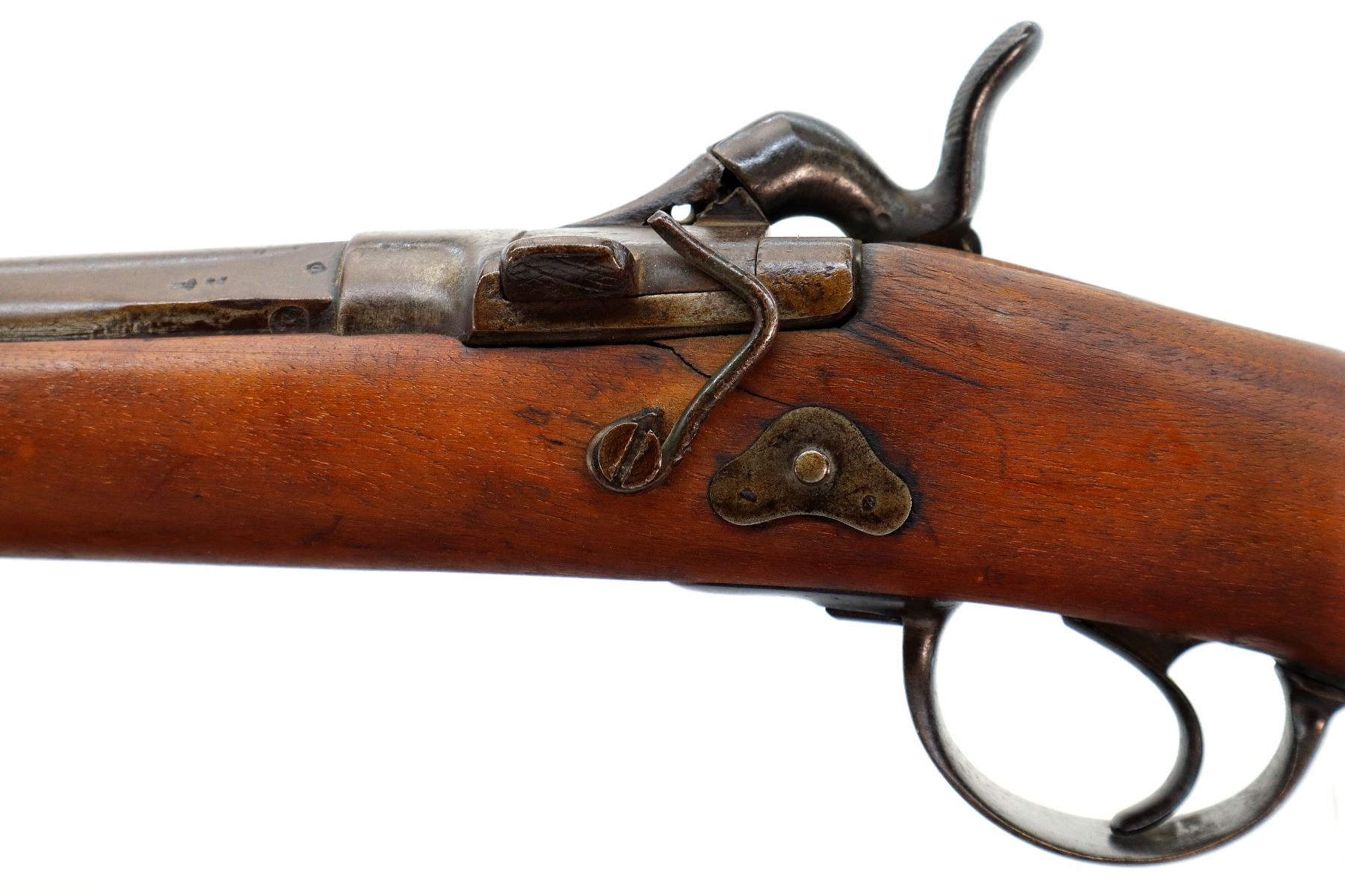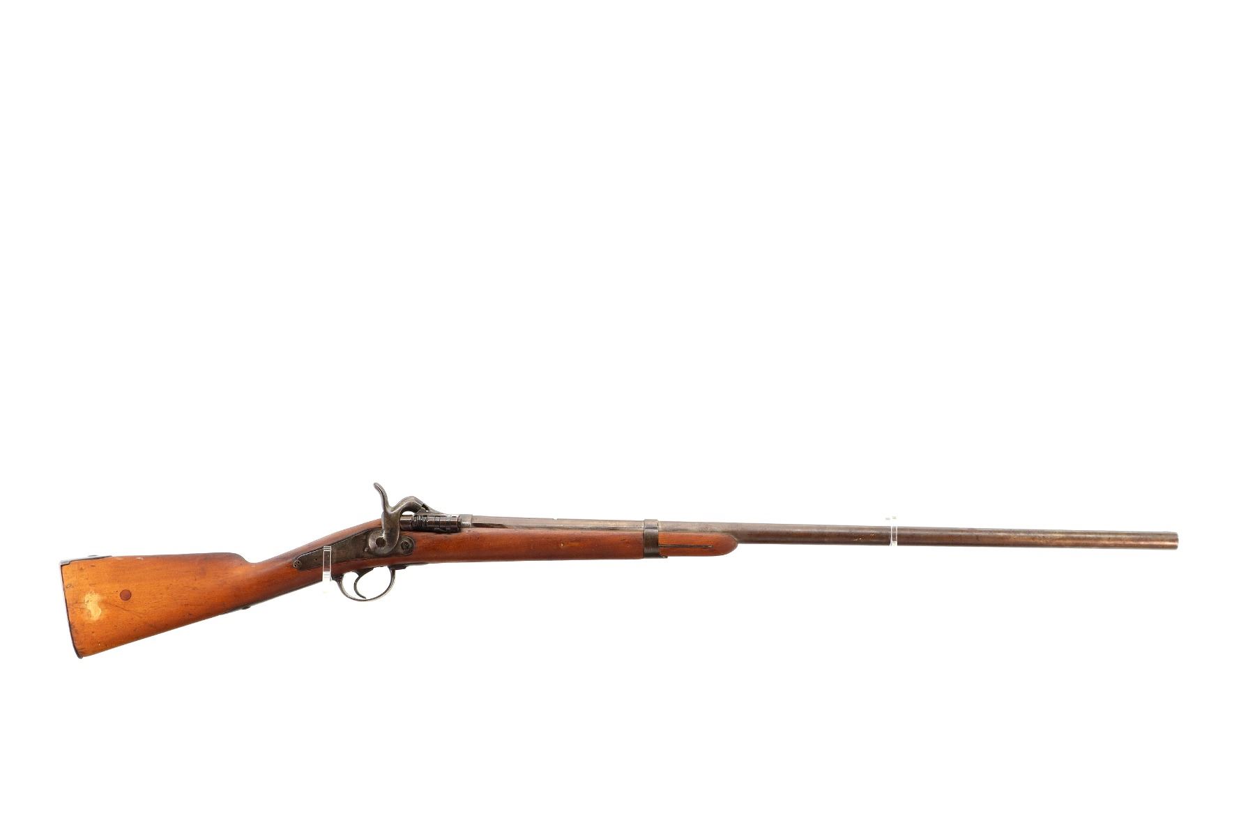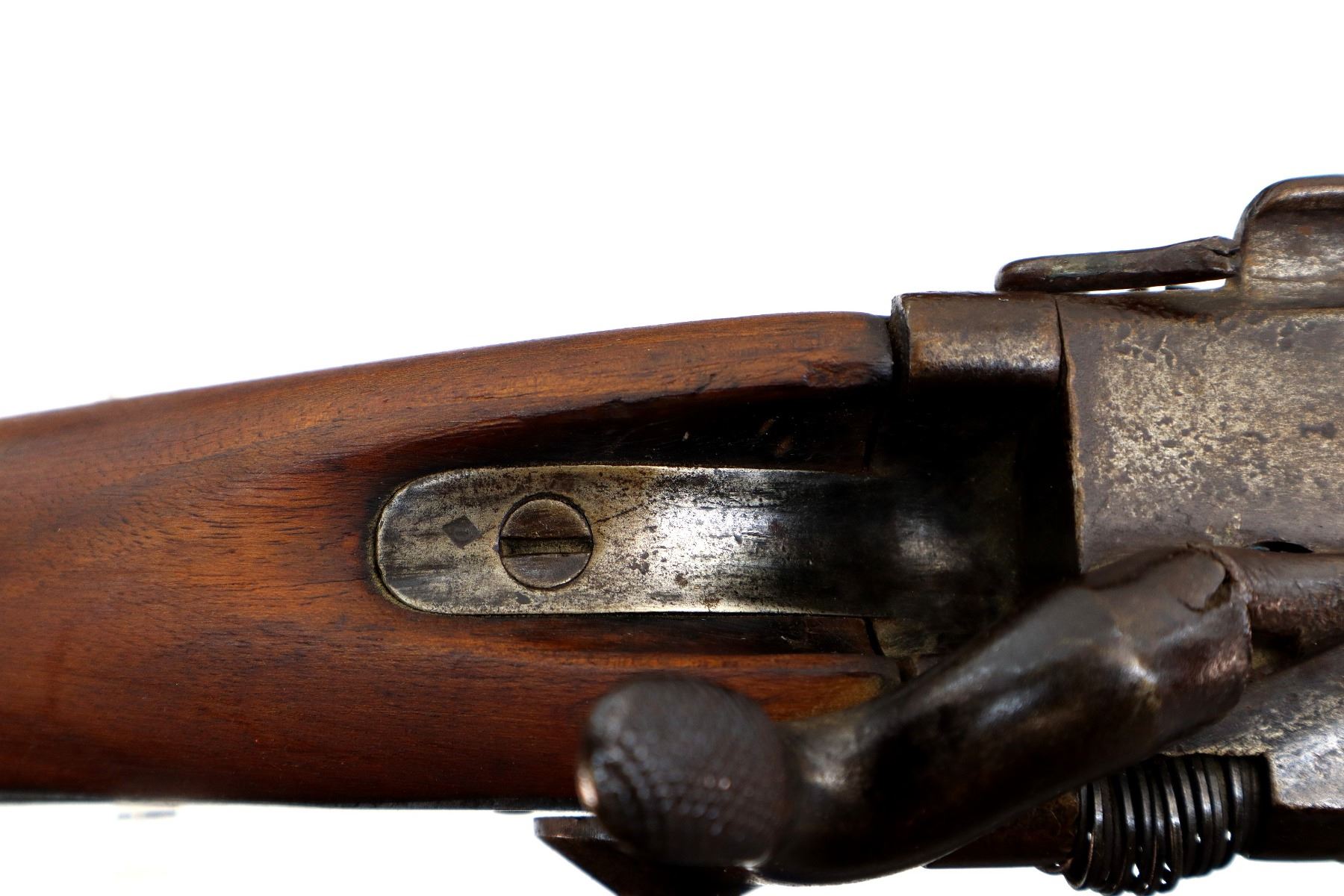 Main Description: Broken bead, missing rear sight, tapered round barrel, bolt is loose missing firing pin chipped and cracked, back action lock with checkered spur hammer that functions. One piece half length wood stock, straight grip cracked behind receiver, smooth steel butt plate, steel trigger guard.