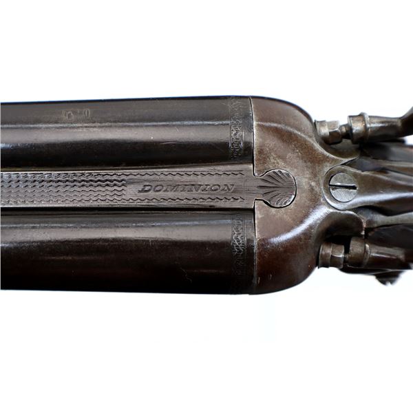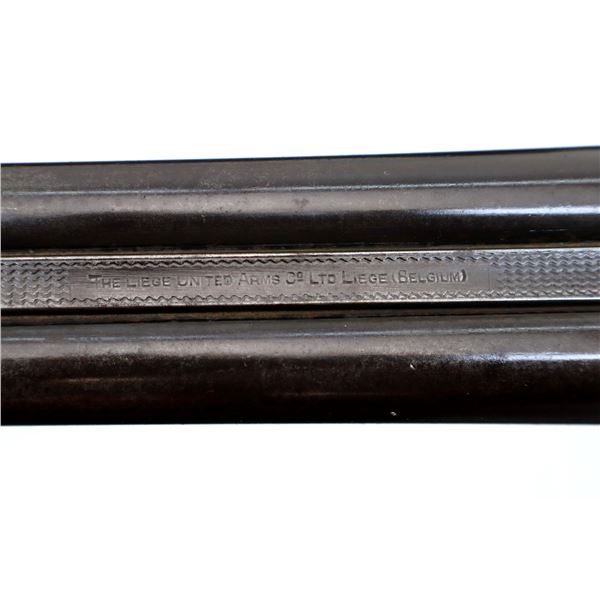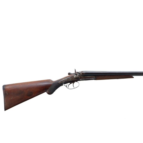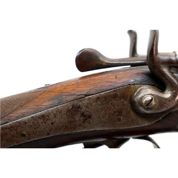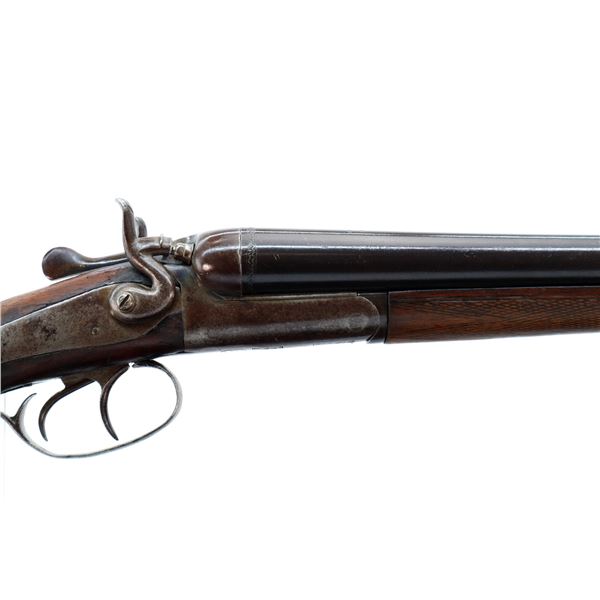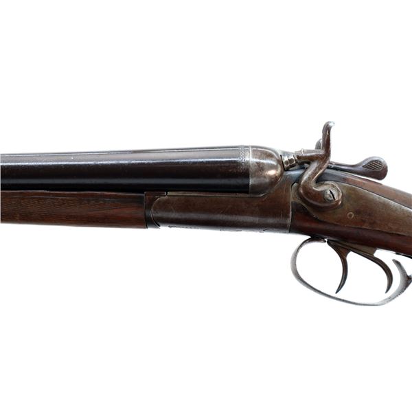 Main Description: Brass bead, raised rib, back action locks with checkered spur hammers that function, extractor, double triggers, barrels are slightly loose on face. Two piece wood stocks, checkered forearm and pistol grip, chipped and cracked behind locks and receiver, smooth steel butt plate.