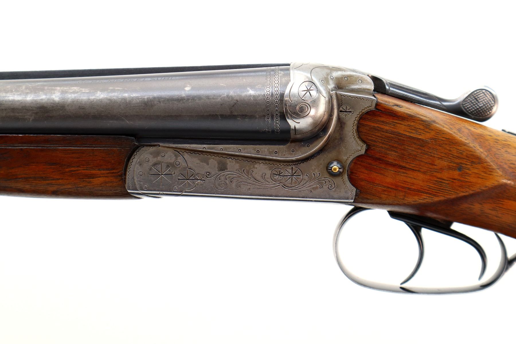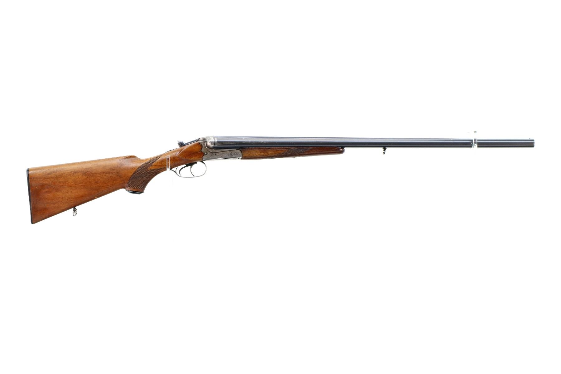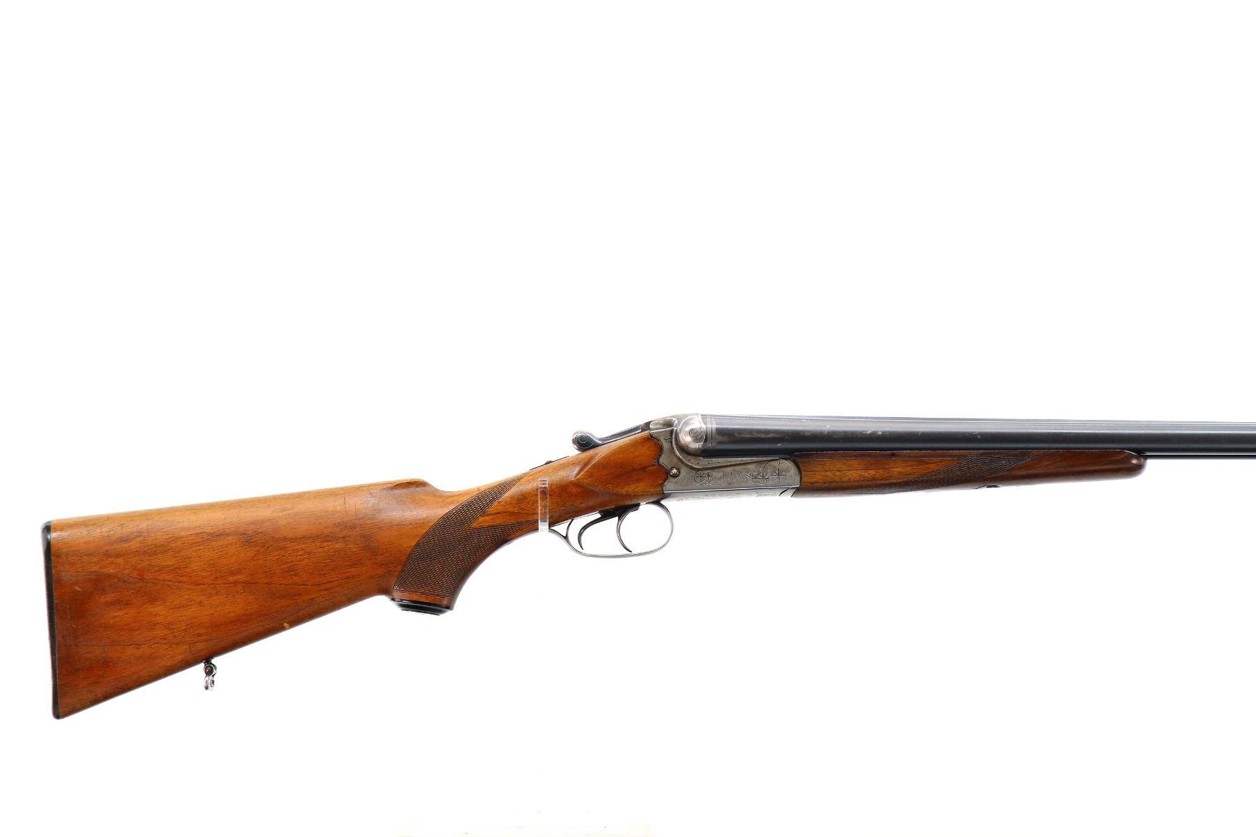 Main Description: Brass bead, blued barrels with raised rib that are loose on face, engraved receiver, automatic safety, extractor, cocking indicators, double triggers. Two piece wood stocks, checkered forearm and pistol grip, chipped and cracked behind receiver, European cheek rest, grooved black polymer butt plate, grip cap, sling swivels.