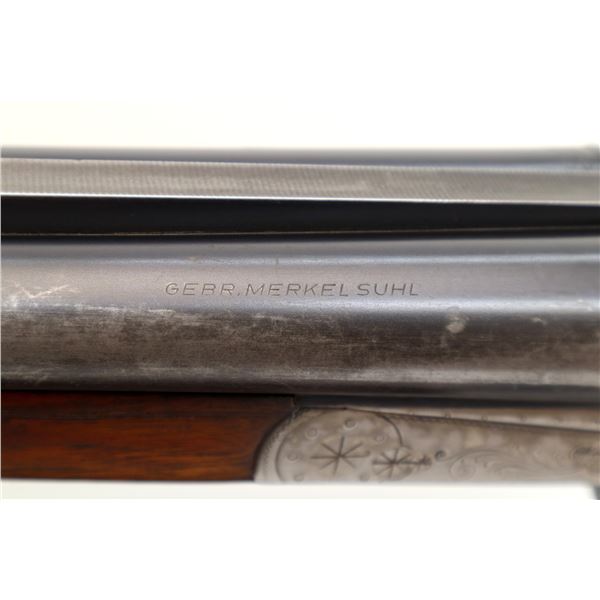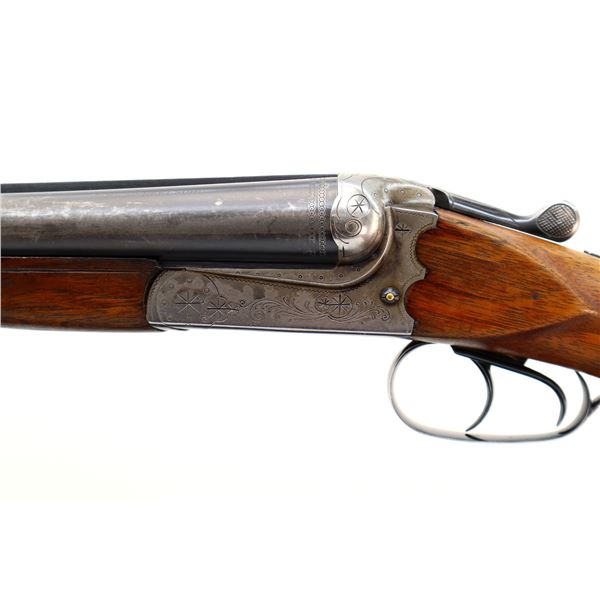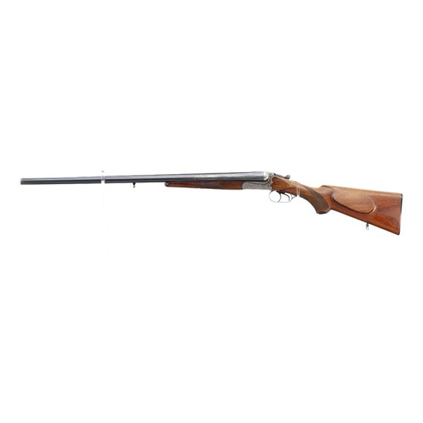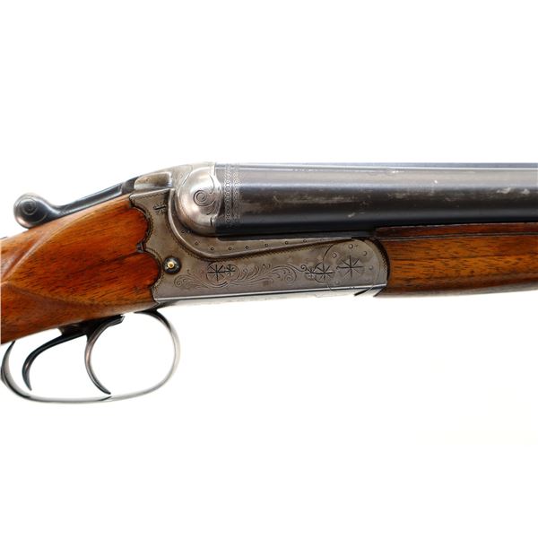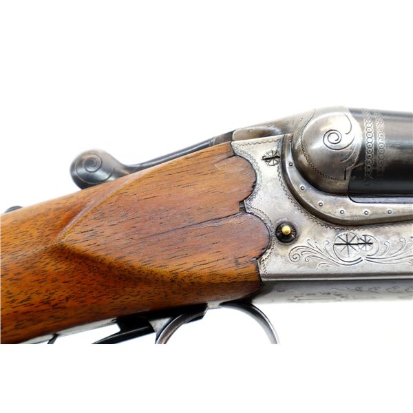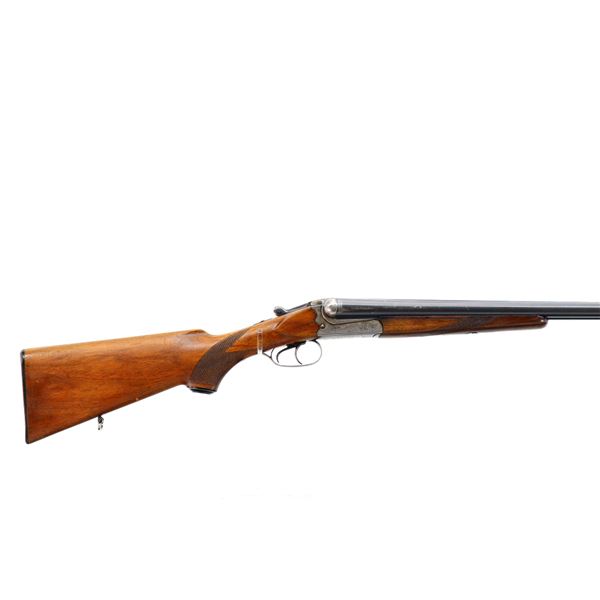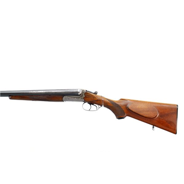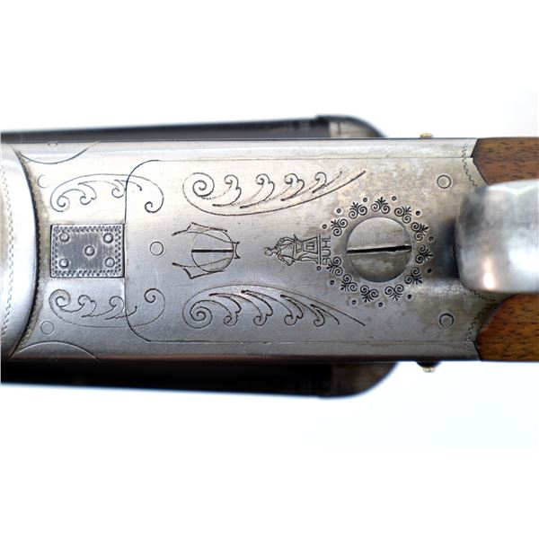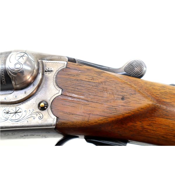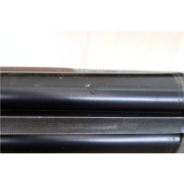 Main Description: Brass bead, blued barrels with raised rib that are loose on face, engraved receiver, automatic safety, extractor, cocking indicators, double triggers. Two piece wood stocks, checkered forearm and pistol grip, chipped and cracked behind receiver, European cheek rest, grooved black polymer butt plate, grip cap, sling swivels.